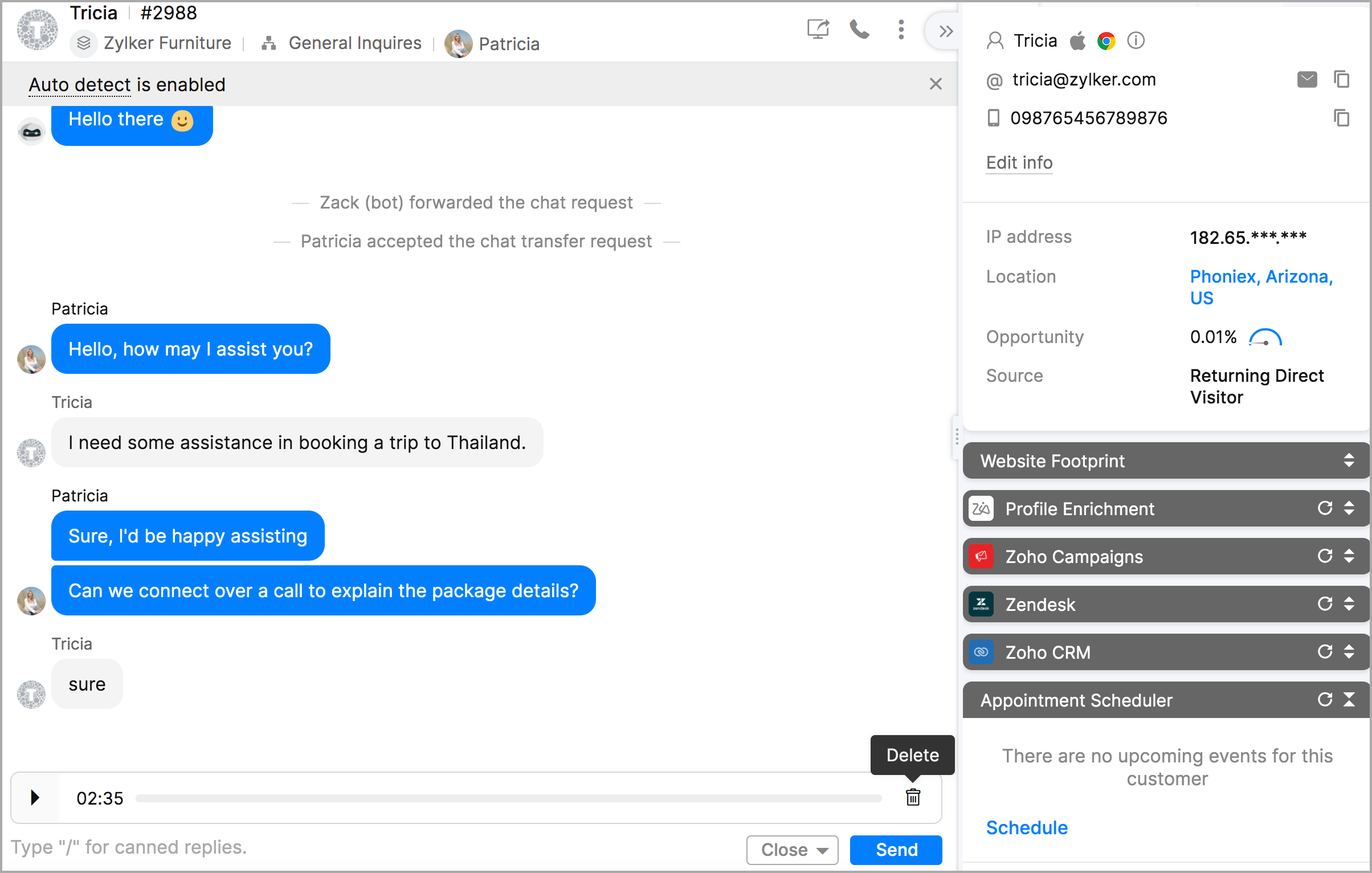 メールやチャットボットを通じたやりとりよりも、担当者とのチャットを好む訪問者もいます。音声メモを使用すると、担当者は複雑な質問に対する解決策をより迅速に説明できるため、訪問者からの信頼を得やすくなります。