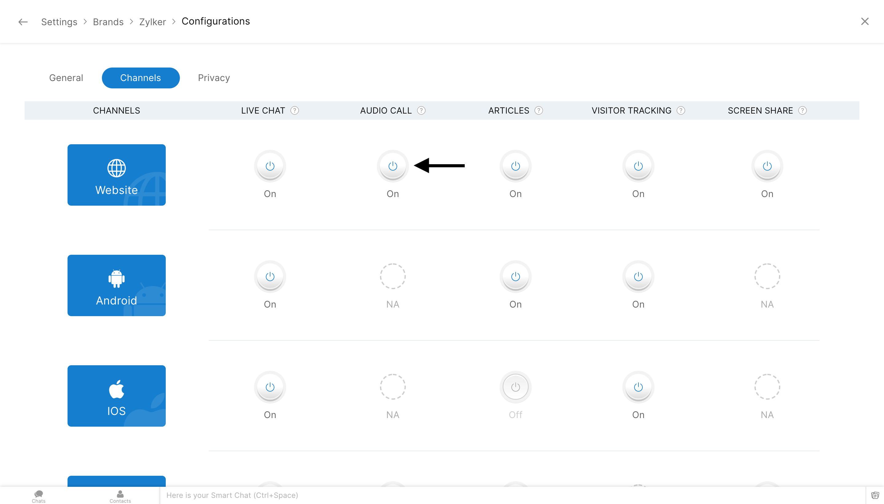 1. [設定]→[パーソナライズ]→[ブランド]→[(ブランド名)]→[管理画面]→[チャネル] の順に移動し、選択したチャネルの [音声通話] ボタンを有効にします。
