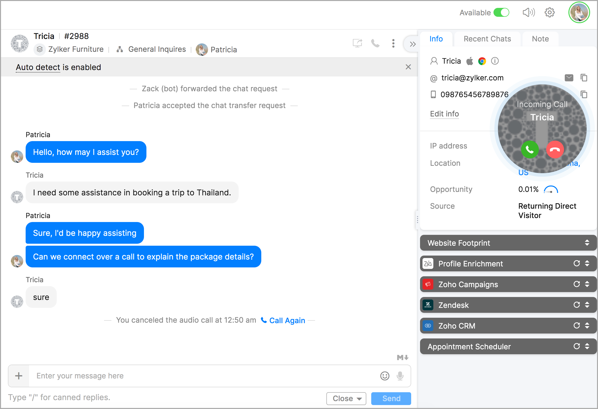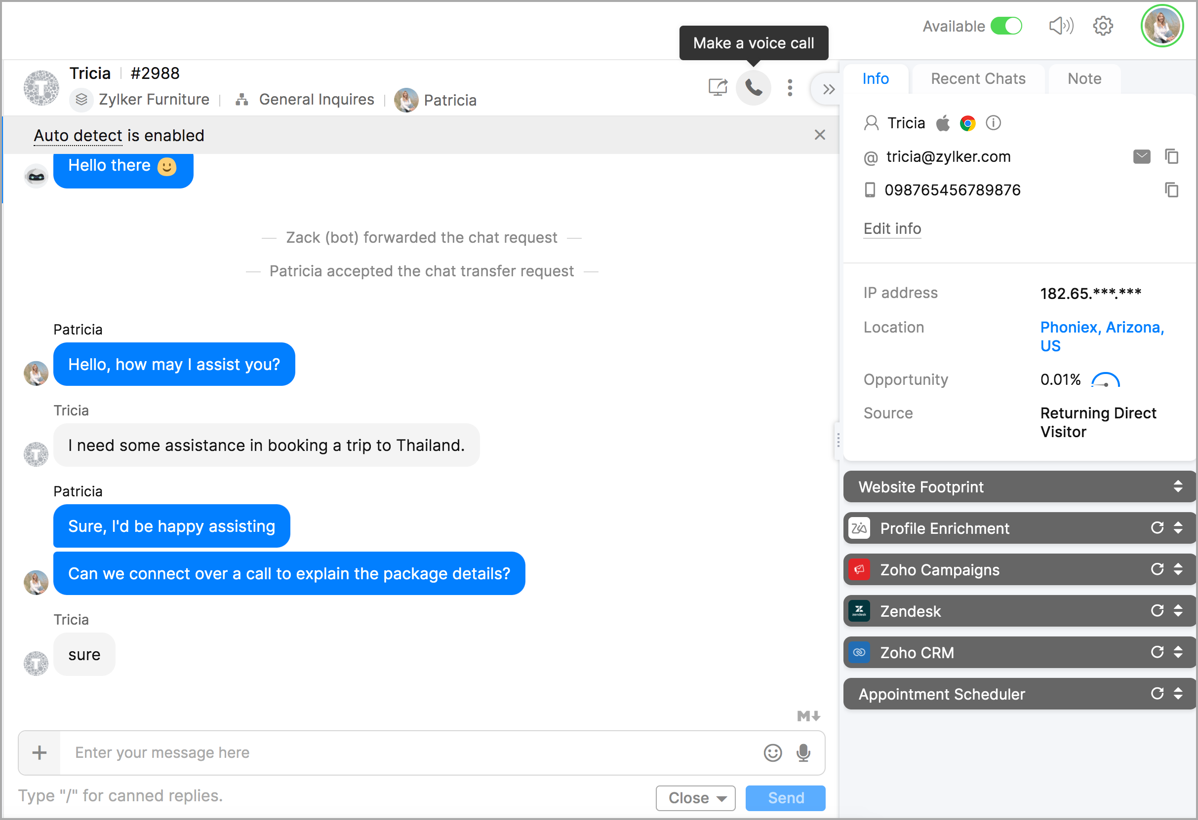 Zoho SalesIQの音声通話機能を使用すると、従来の電話を使用するのと同じように、音声通話を受発信できます。必要なのは、コンピューターのスピーカーとマイク、またはコンピューターに接続したヘッドセットやハンドセットのみです。