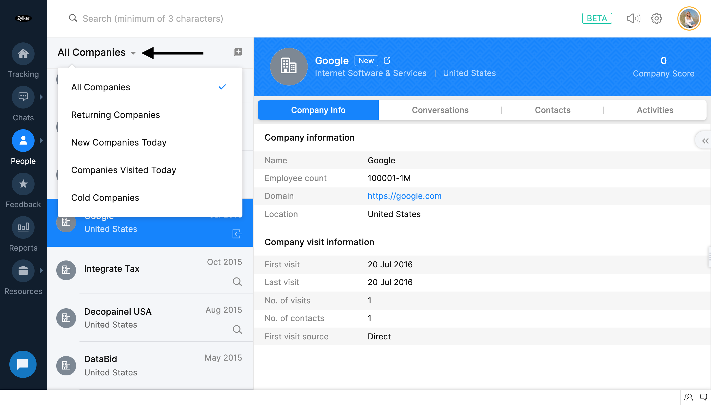 Zoho SalesIQの画面左側のメニューにある[連絡先]→[会社]に移動し、リストの種類の横にある [+]アイコンをクリックします。