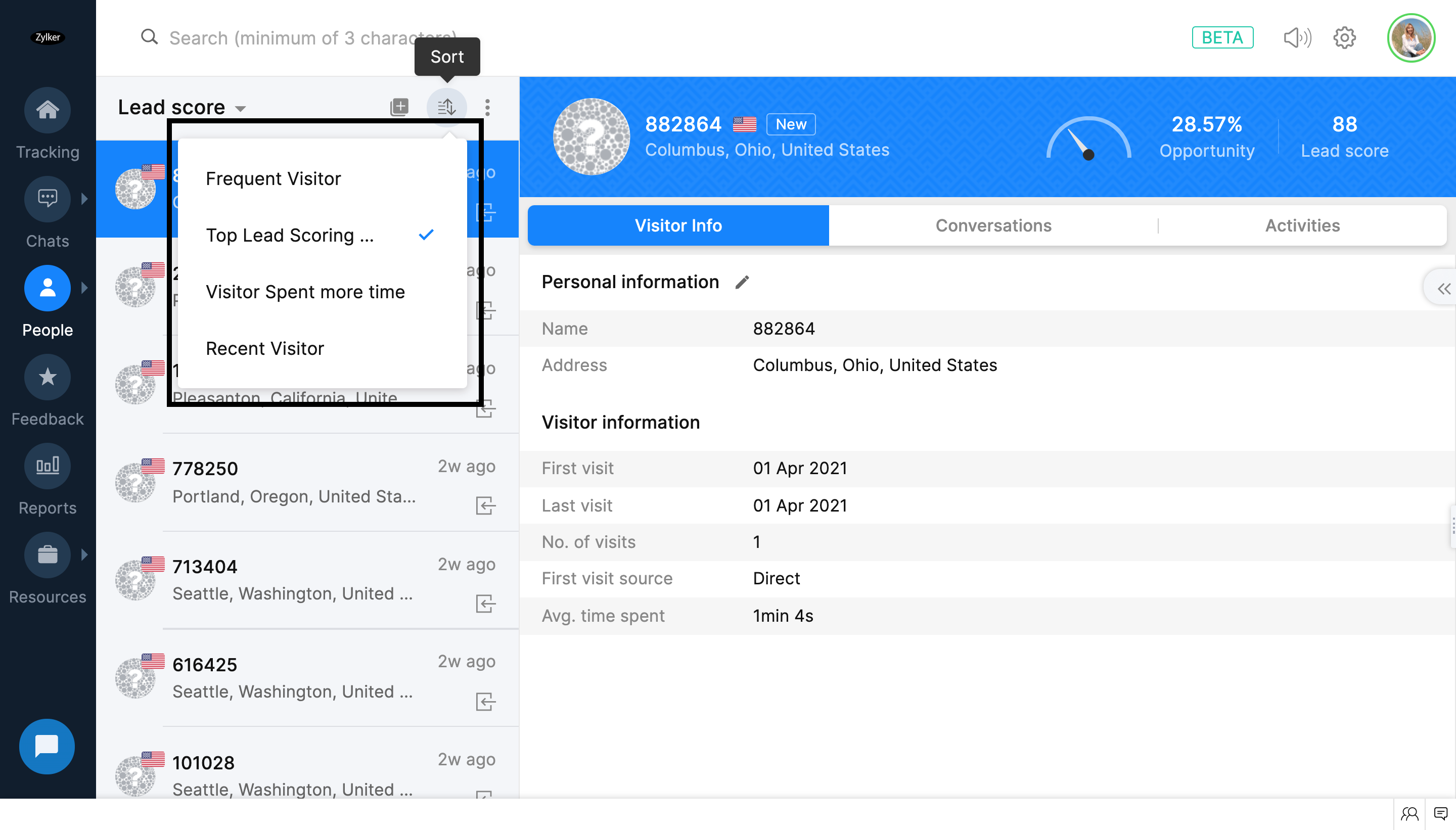 • リストの種類の横にある[並べ替える]アイコンをクリックすると、並べ替え条件の一覧が表示されます。選択した条件で、リスト内の訪問者を並べ替えることができます。