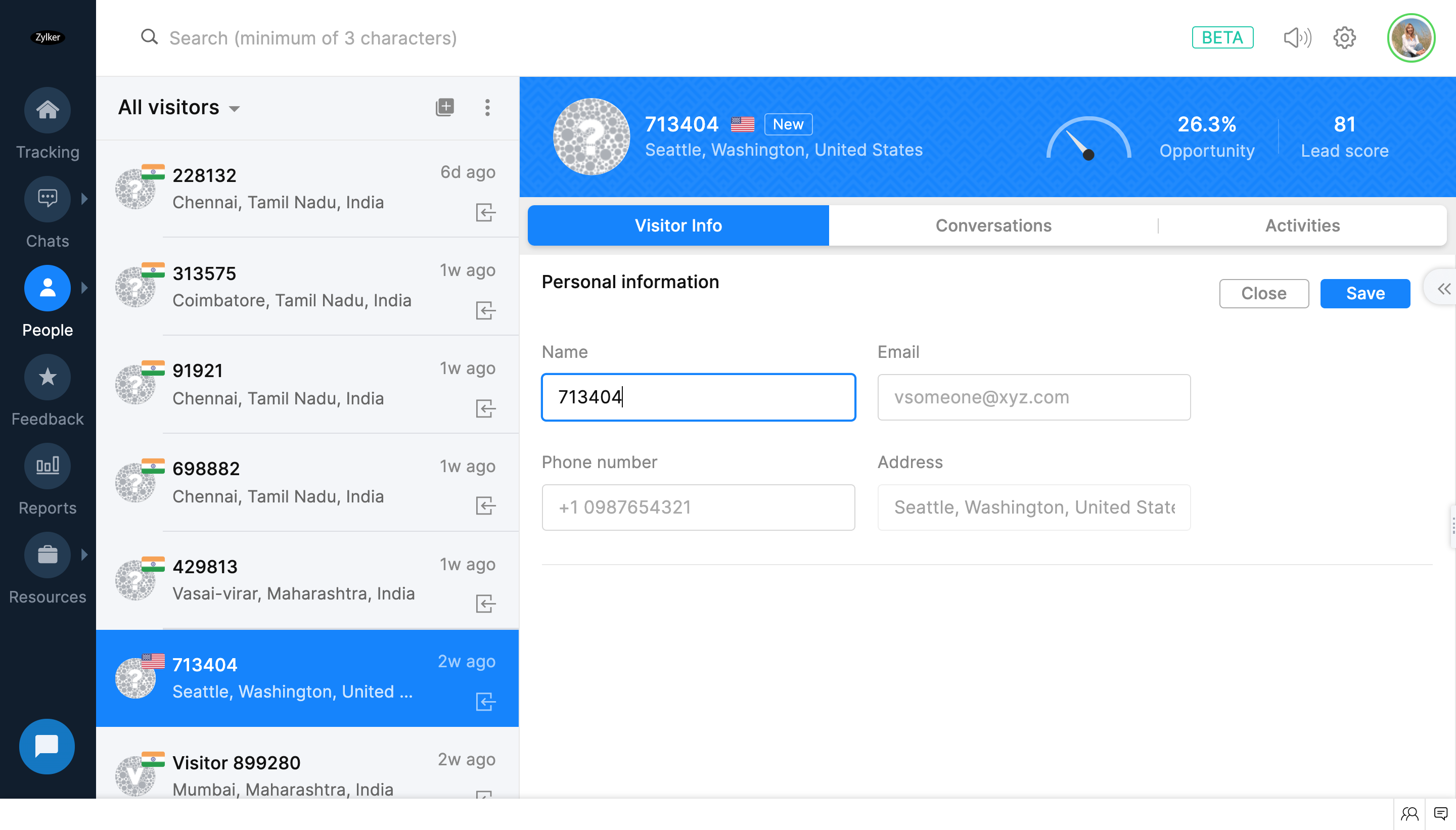 Zoho SalesIQでは、訪問者に関するさまざまな情報を収集できます。これらの情報はすべて[訪問者の情報]タブで確認できます。