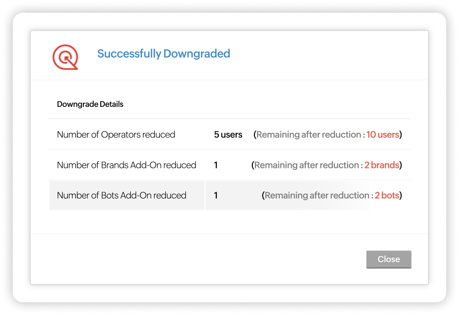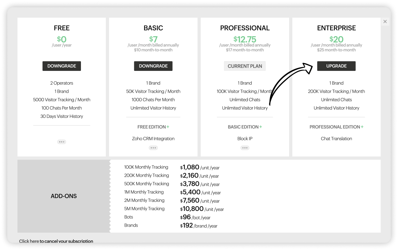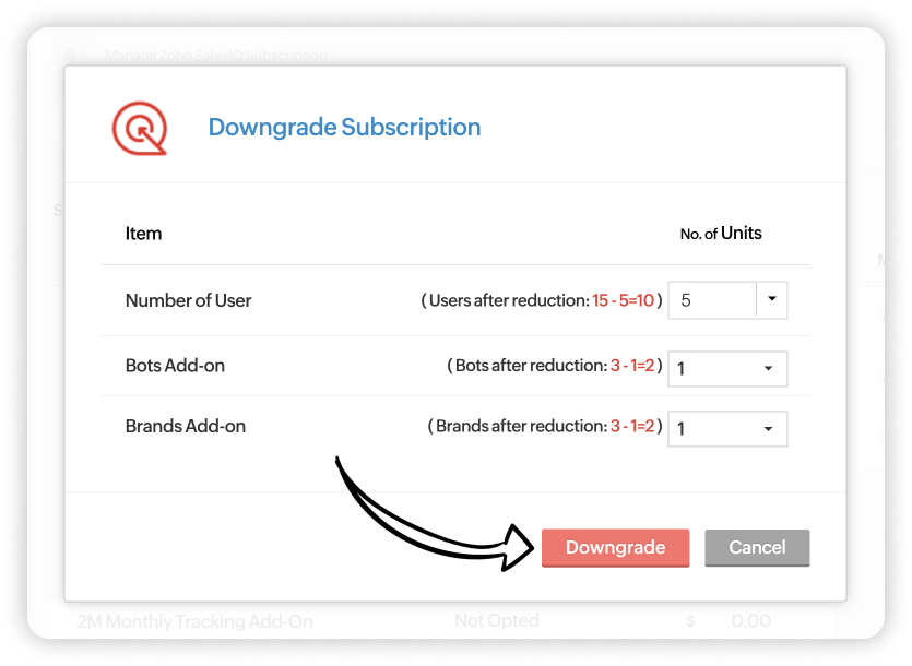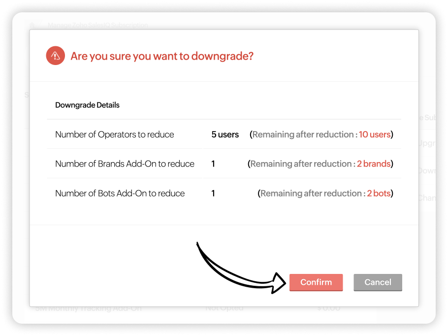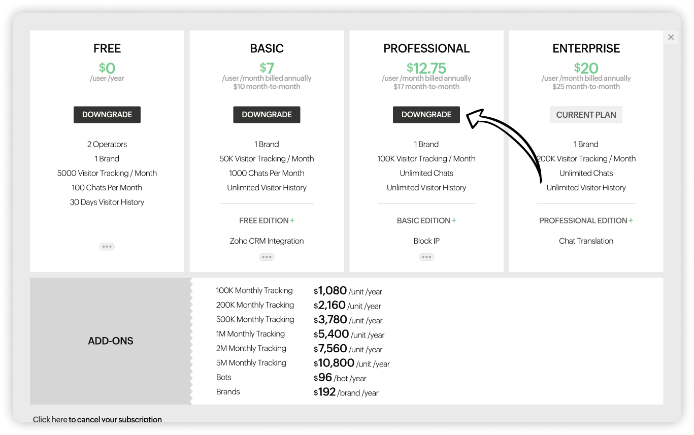 Zoho SalesIQのサブスクリプションはいつでも変更できます。必要に応じて、プランのアップグレード(上位プランへの変更)、ダウングレード(下位プランへの変更)、アドオンの購入(ユーザー数の追加)が可能です。また、組織の要件や規模に応じて、Zoho SalesIQのプランを選択し、アドオンを追加購入することが可能です。