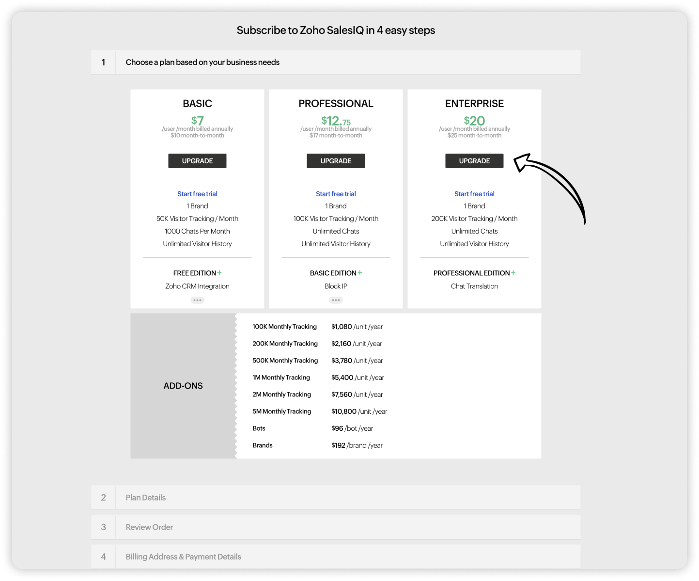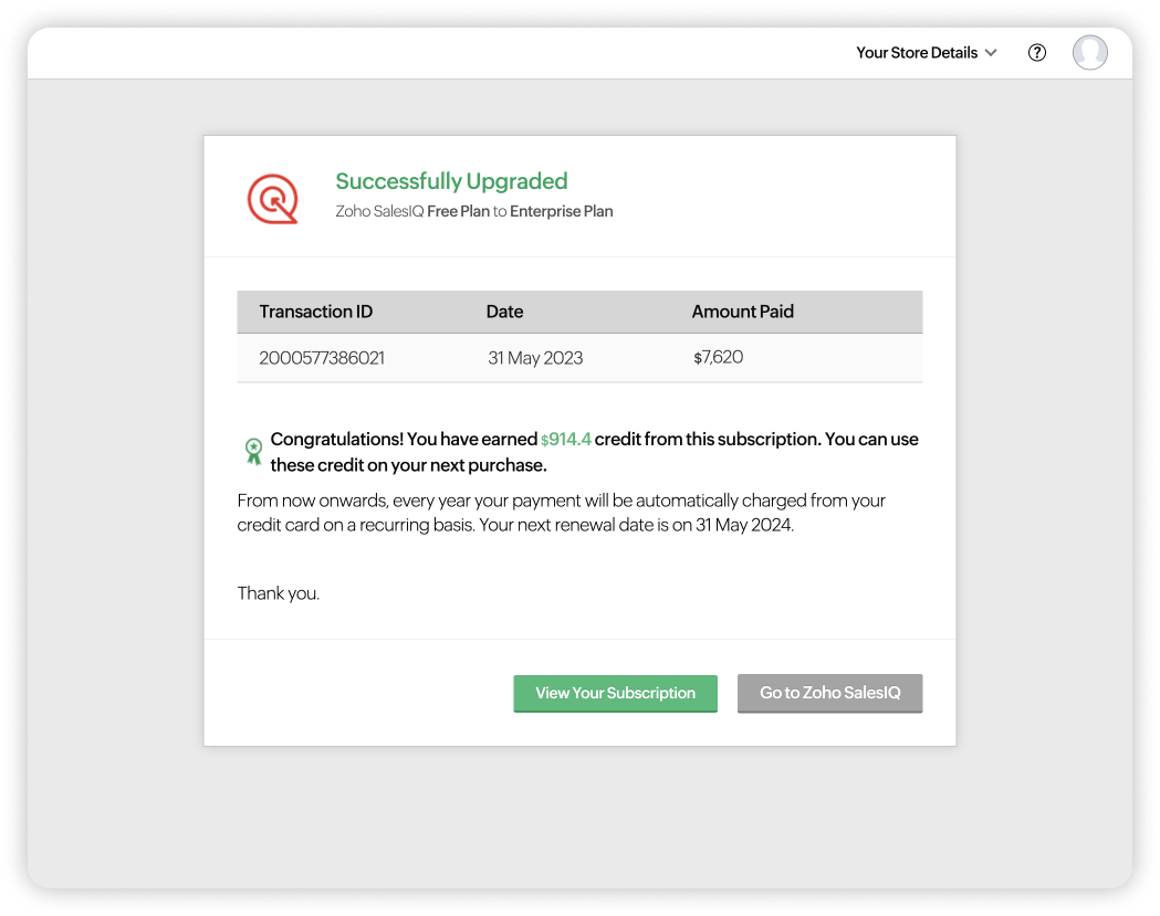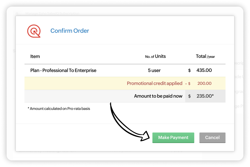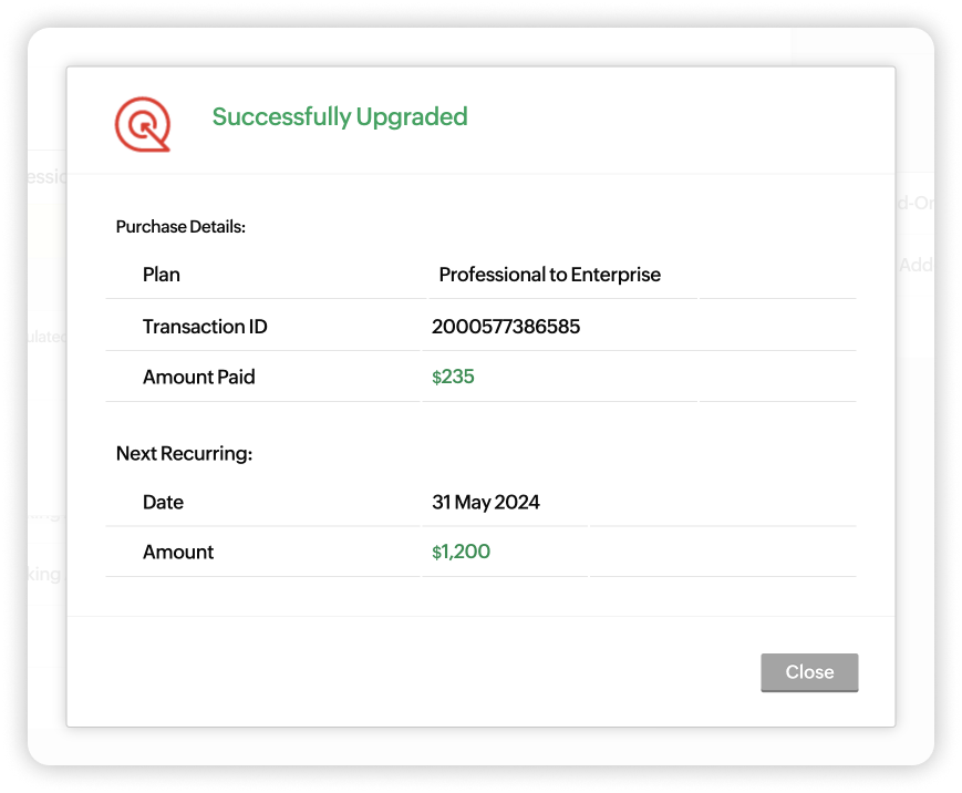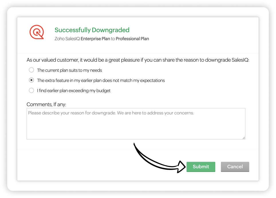 Zoho SalesIQのサブスクリプションはいつでも変更できます。必要に応じて、プランのアップグレード(上位プランへの変更)、ダウングレード(下位プランへの変更)、アドオンの購入(ユーザー数の追加)が可能です。また、組織の要件や規模に応じて、Zoho SalesIQのプランを選択し、アドオンを追加購入することが可能です。
