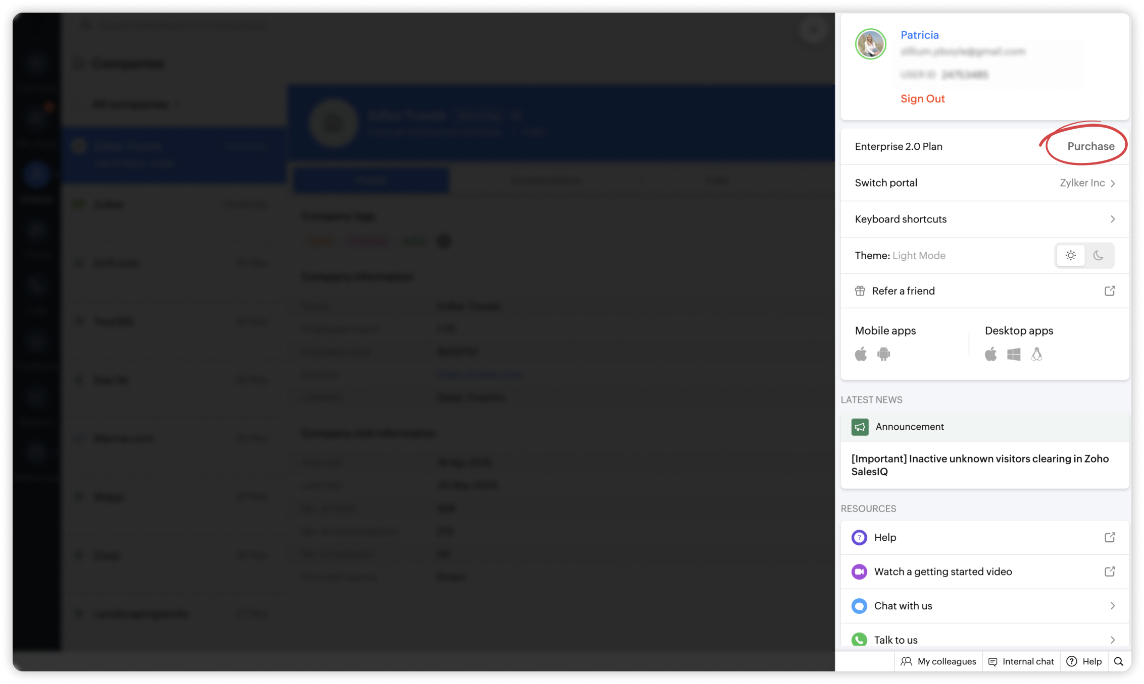 Zoho SalesIQのプランをアップグレードするには、Zoho SalesIQにサインインして、画面の右上にある自分のプロフィール画像をクリックします。画面の右側に、プロフィールの詳細が表示されます。こちらで、Zoho SalesIQの現在のプランを確認できます。現在のプラン名の右側にある[購入する]リンクをクリックして、サブスクリプションの購入画面を開きます。