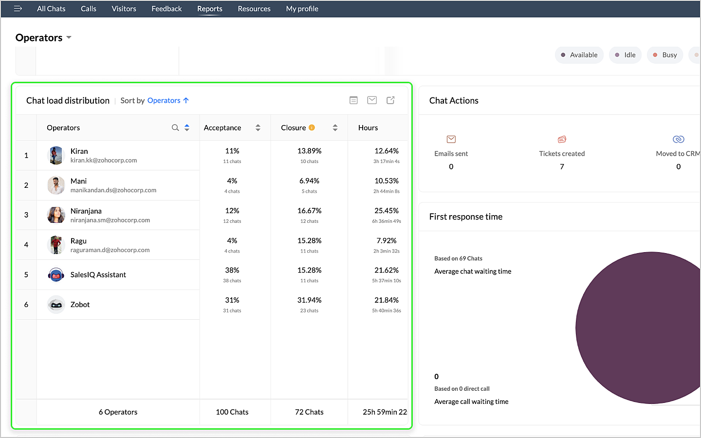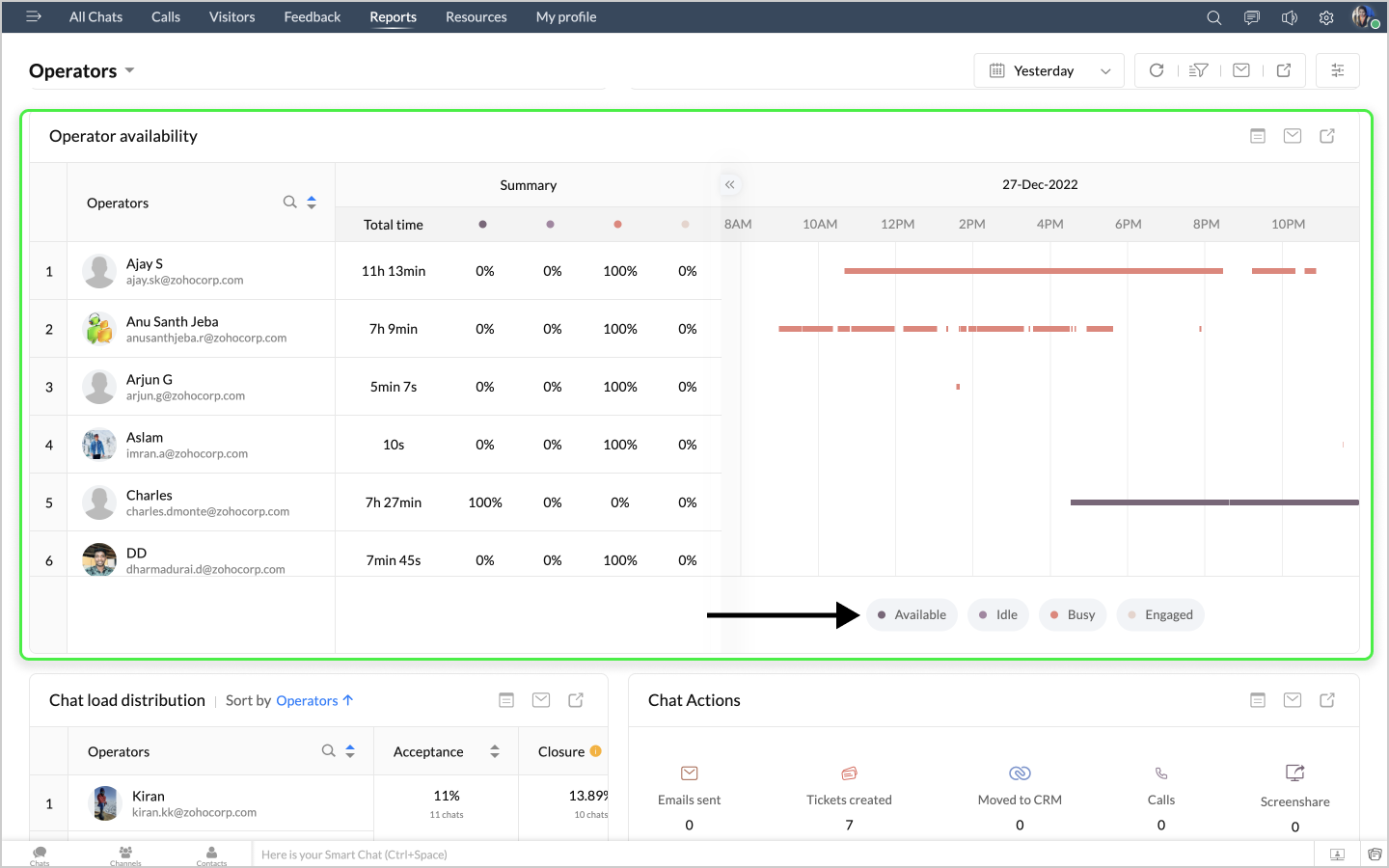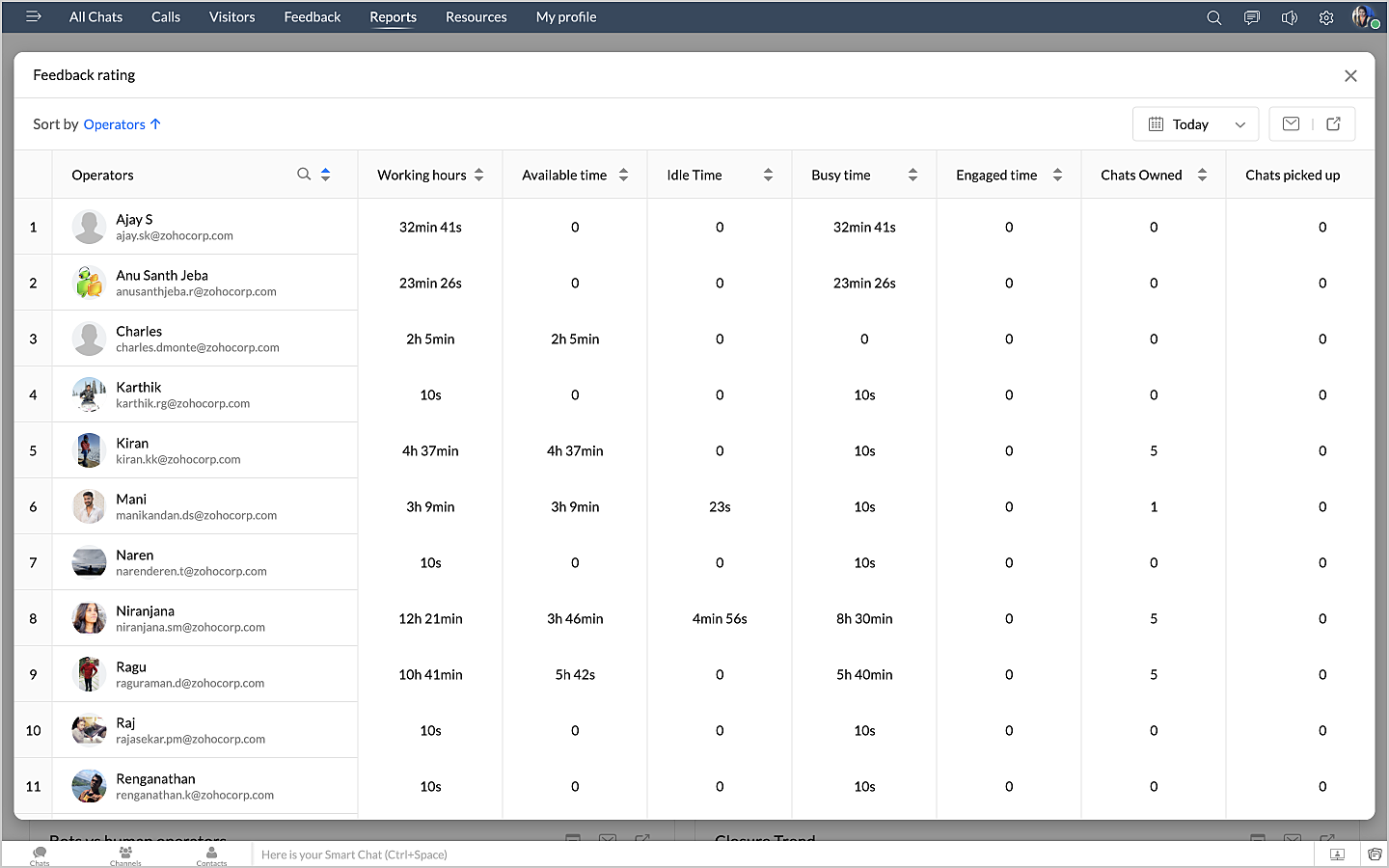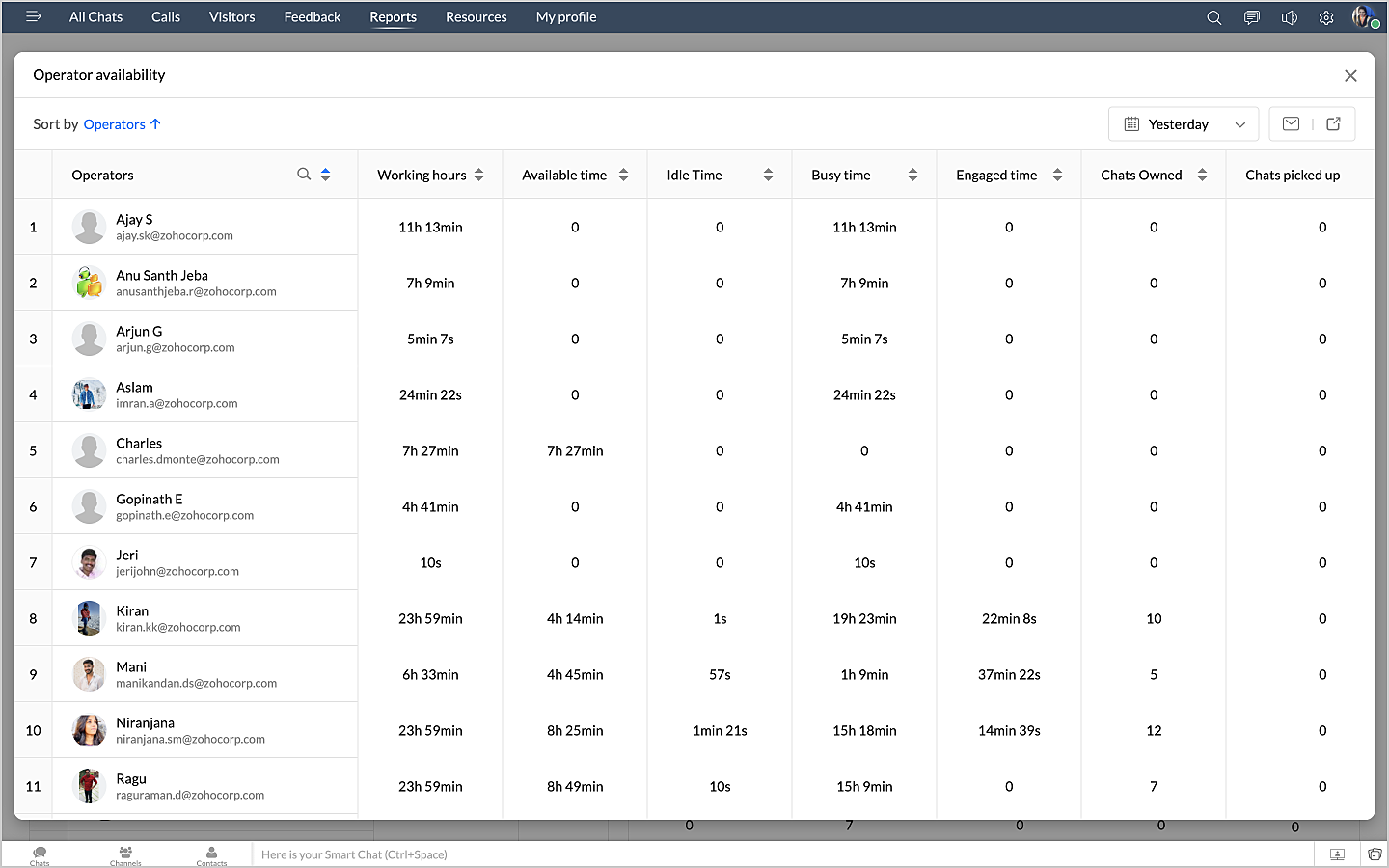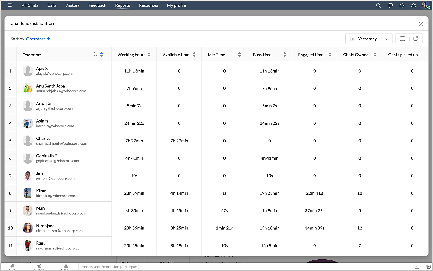 詳細表示アイコンをクリックすると、チャットの対応量のデータが、担当者別に表形式で表示されます。