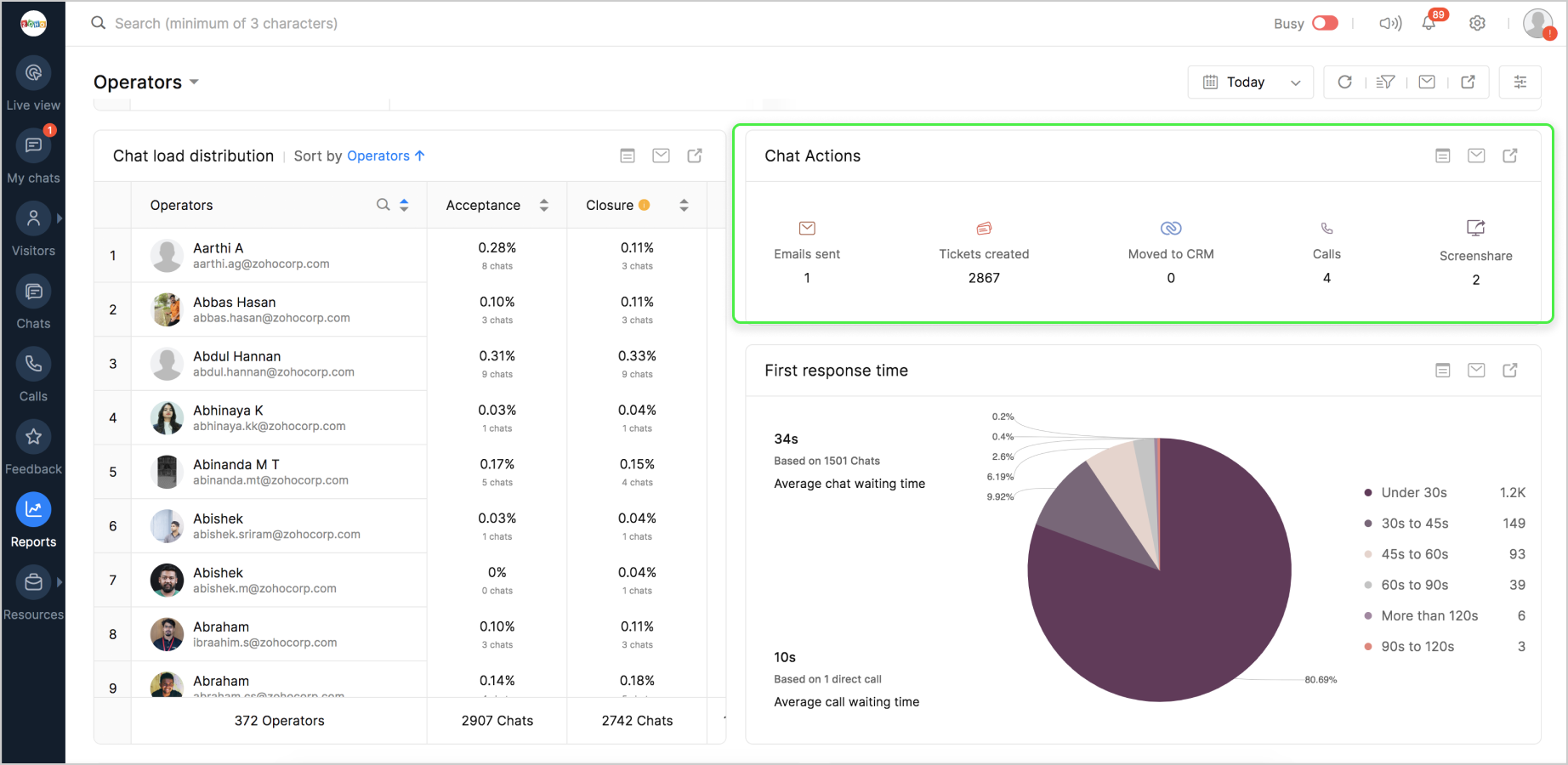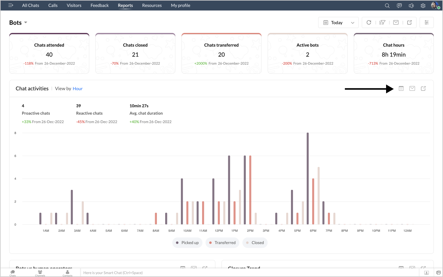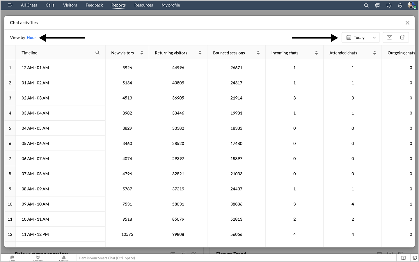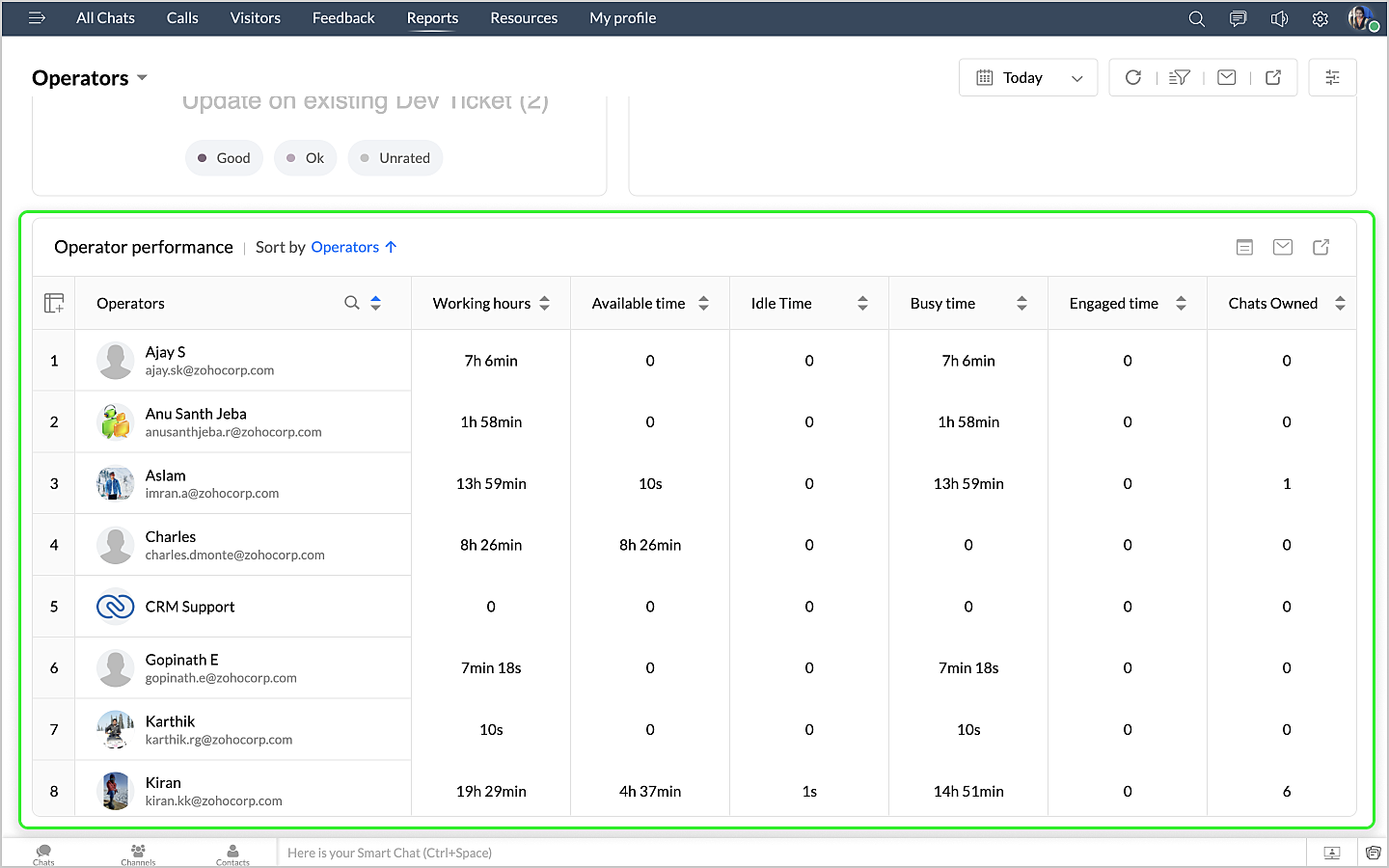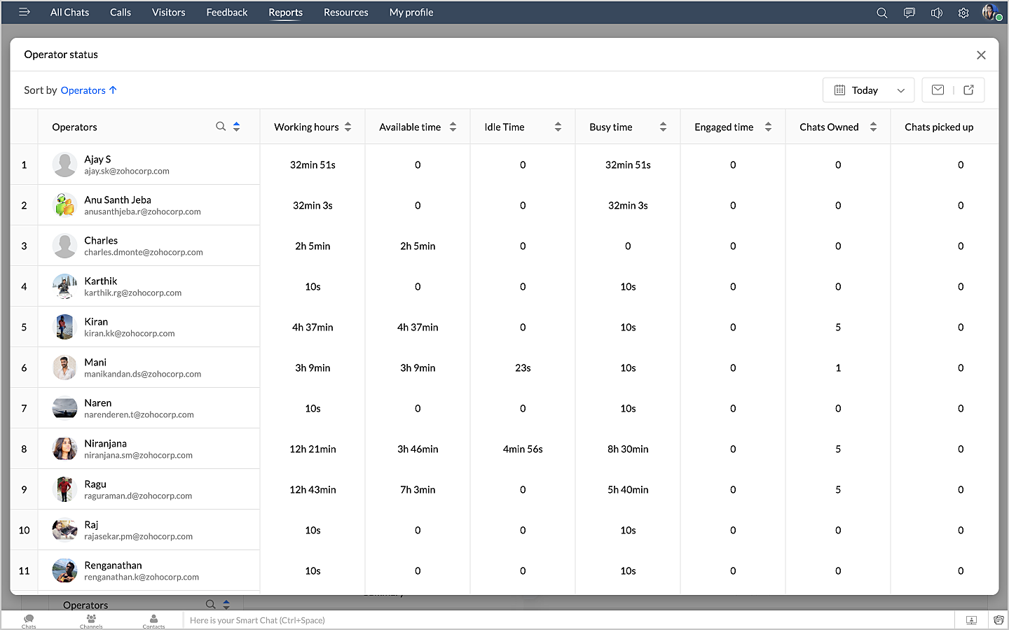 詳細表示アイコンをクリックすると、チャットの対応量のデータが、担当者別に表形式で表示されます。