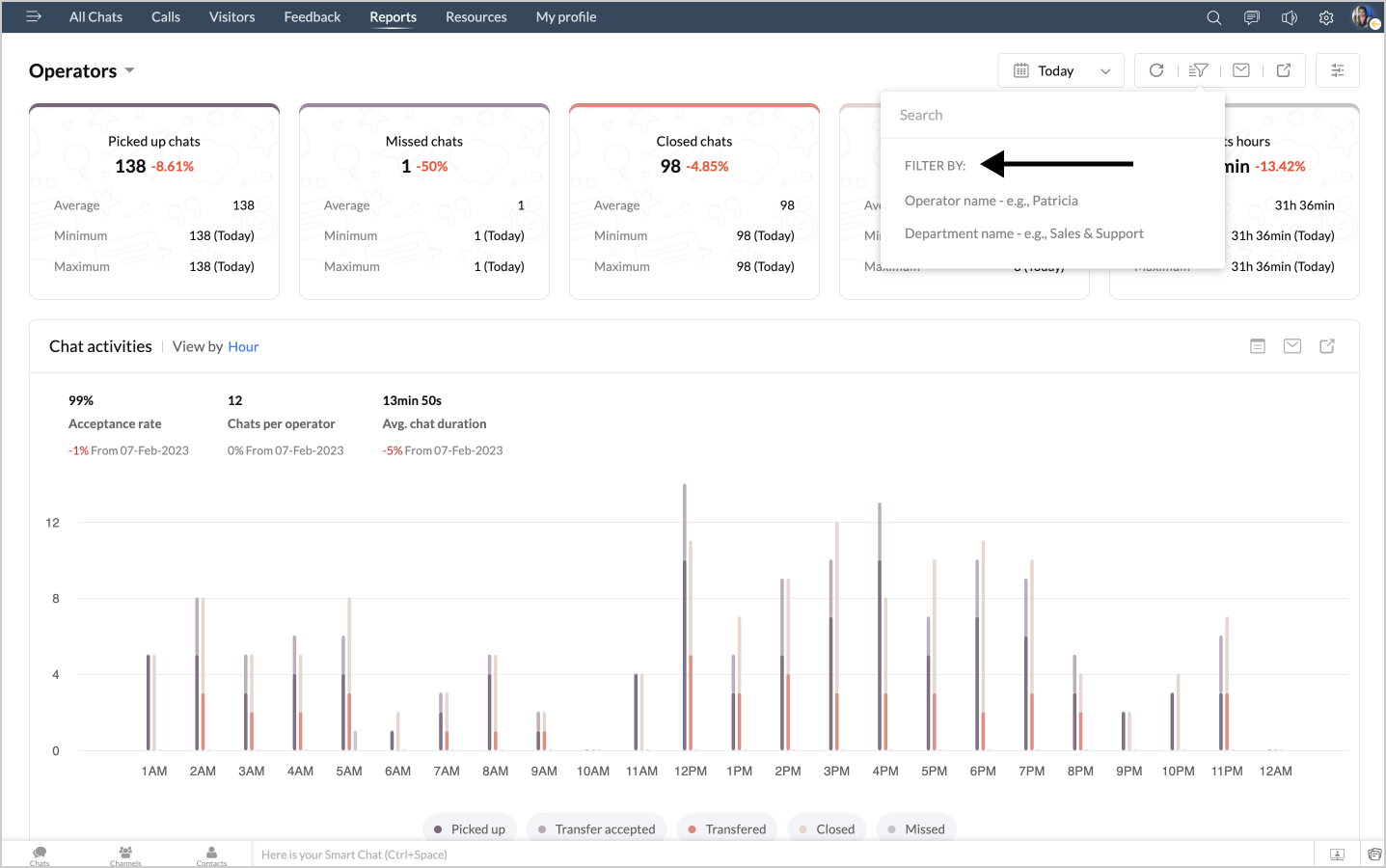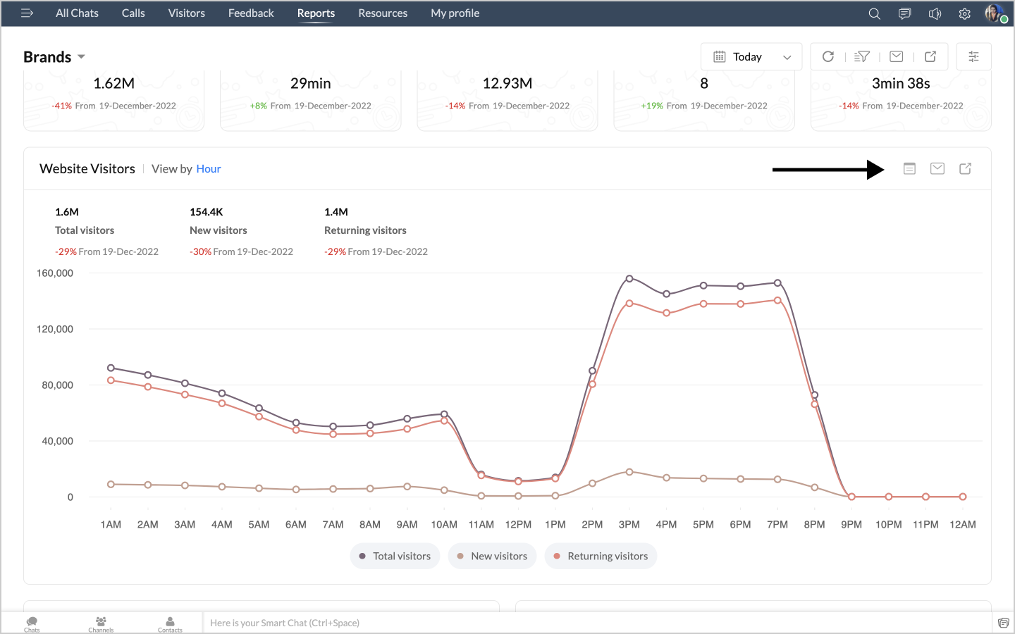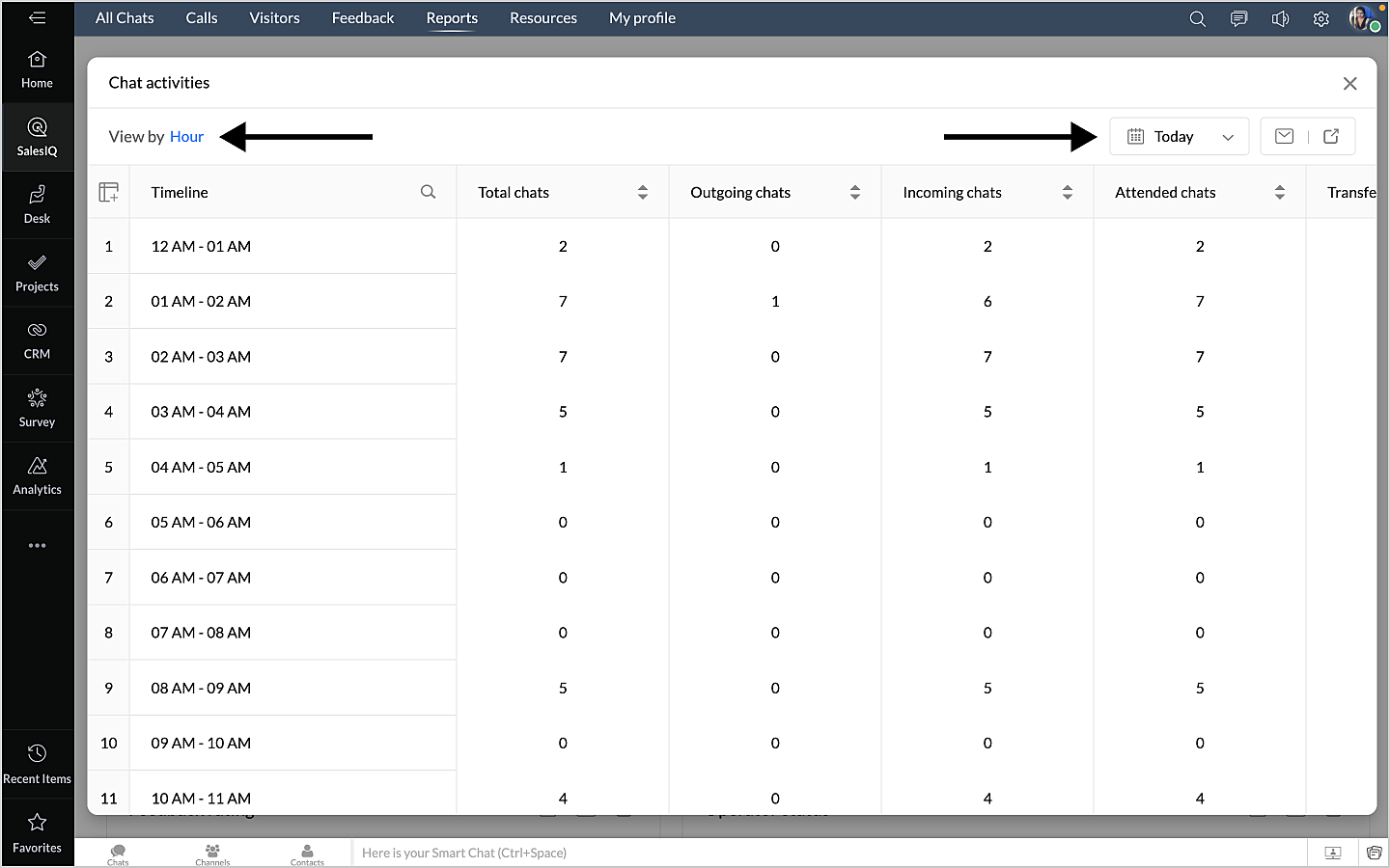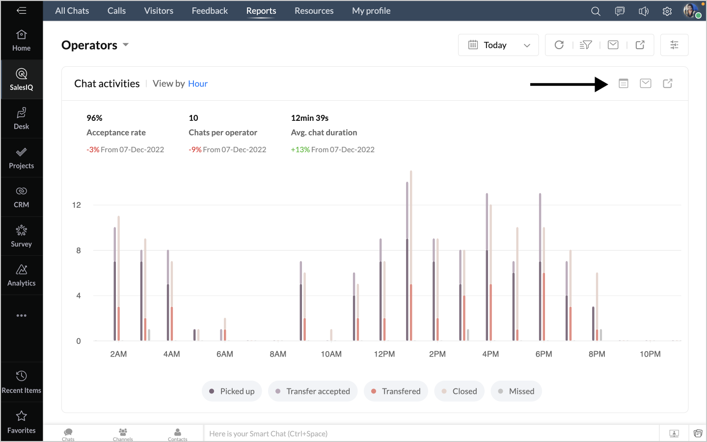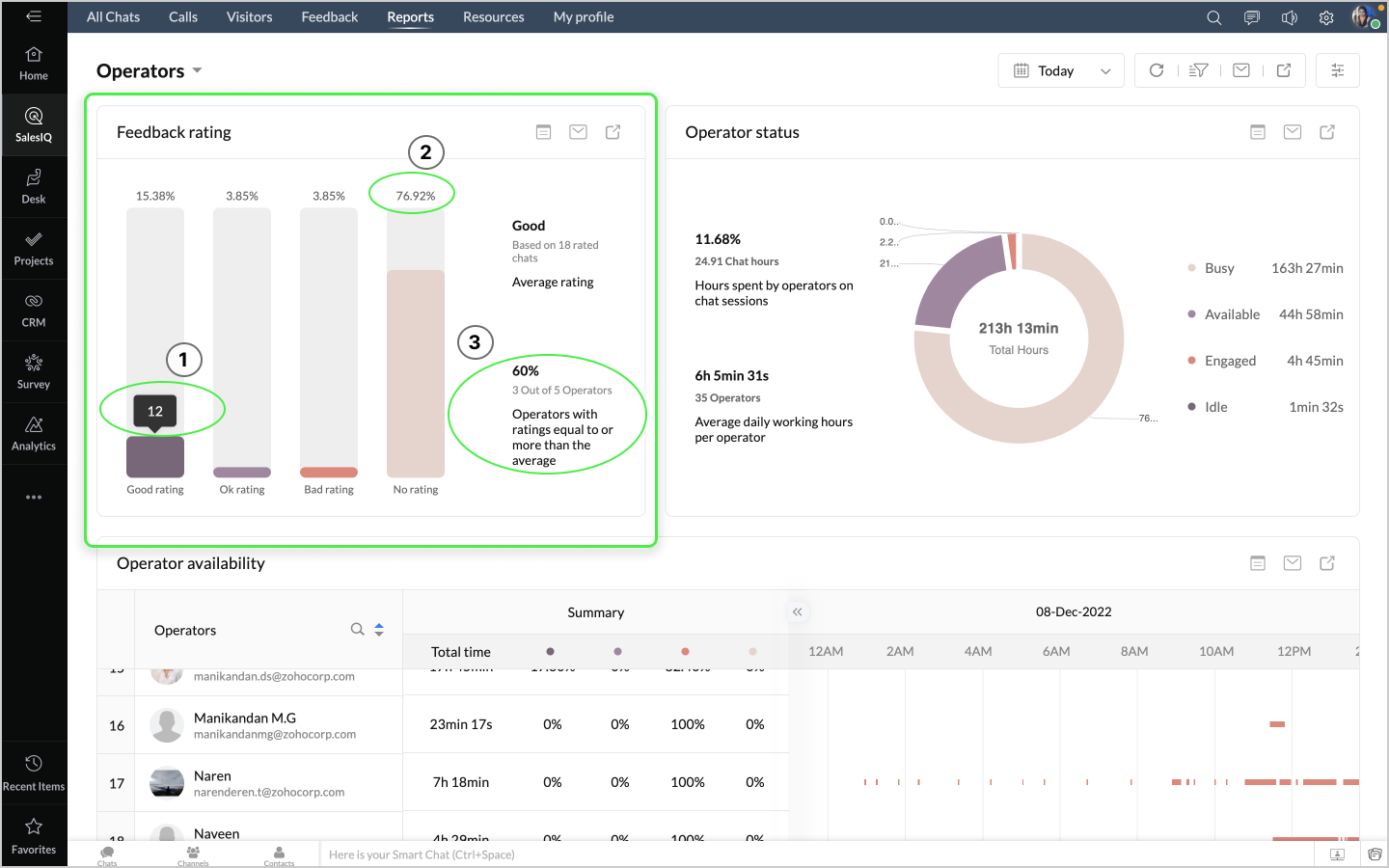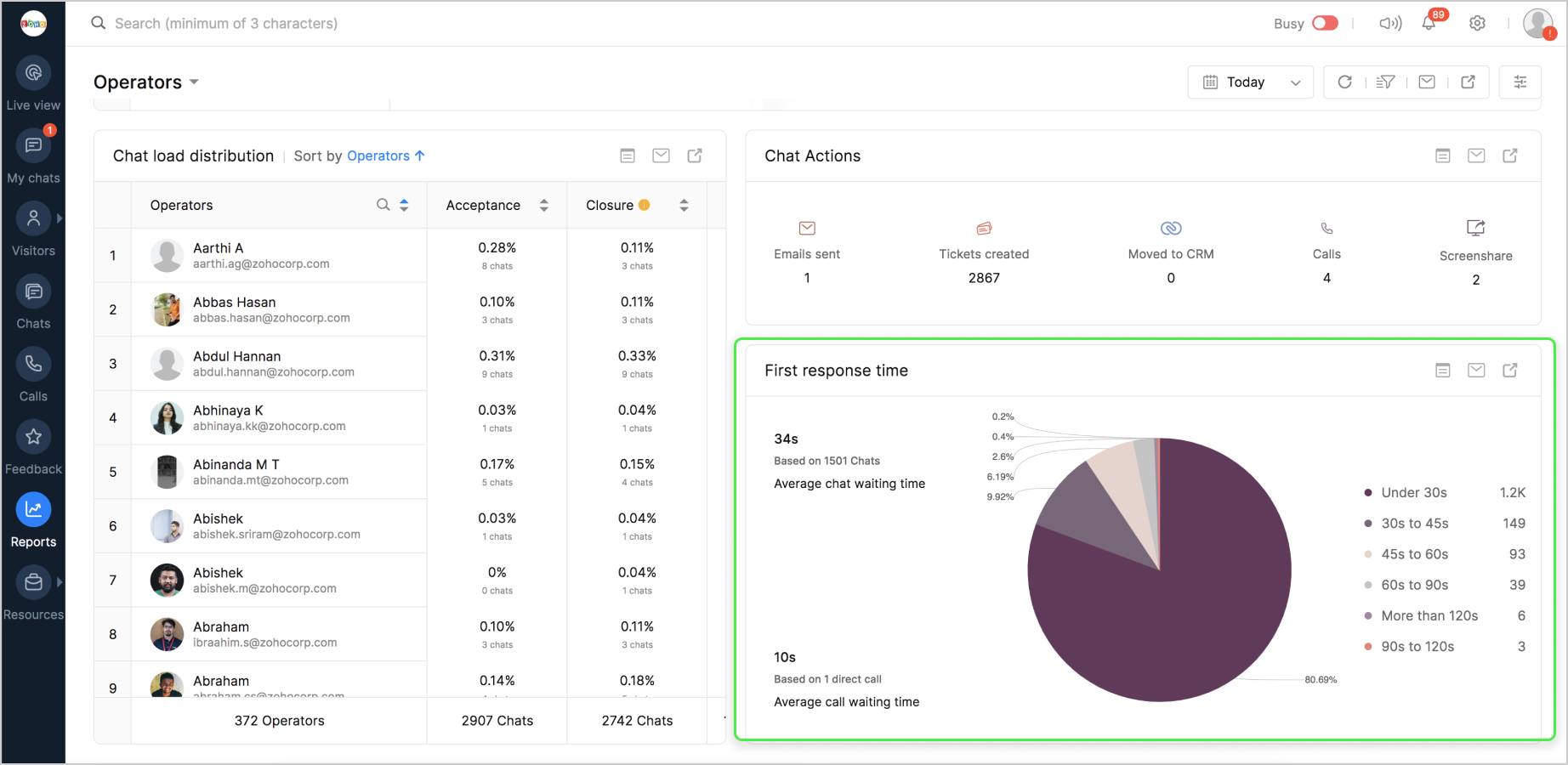 詳細表示アイコンをクリックすると、チャットの対応量のデータが、担当者別に表形式で表示されます。