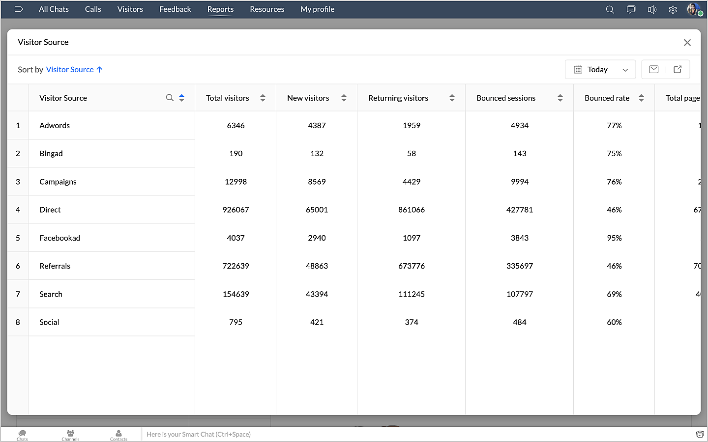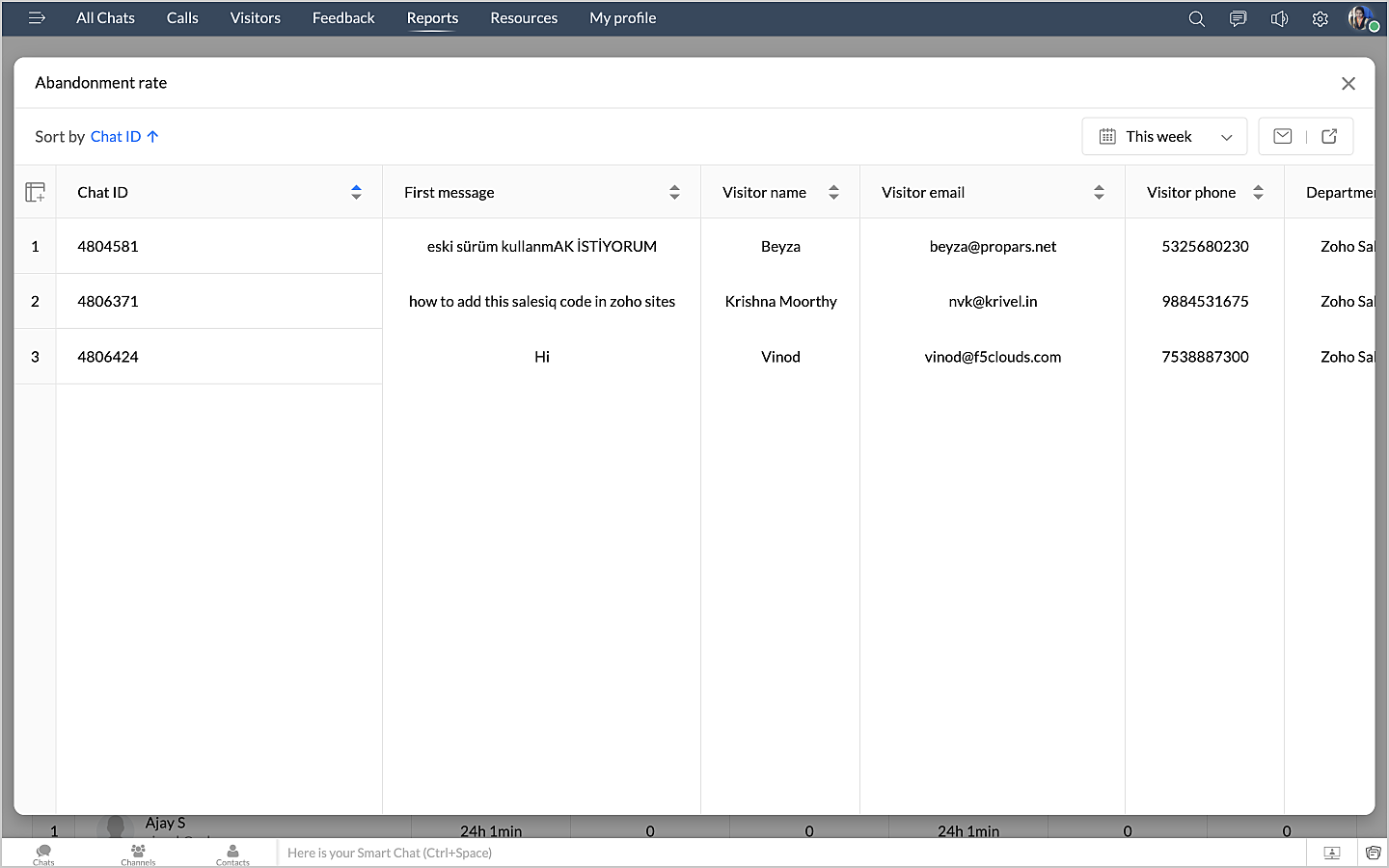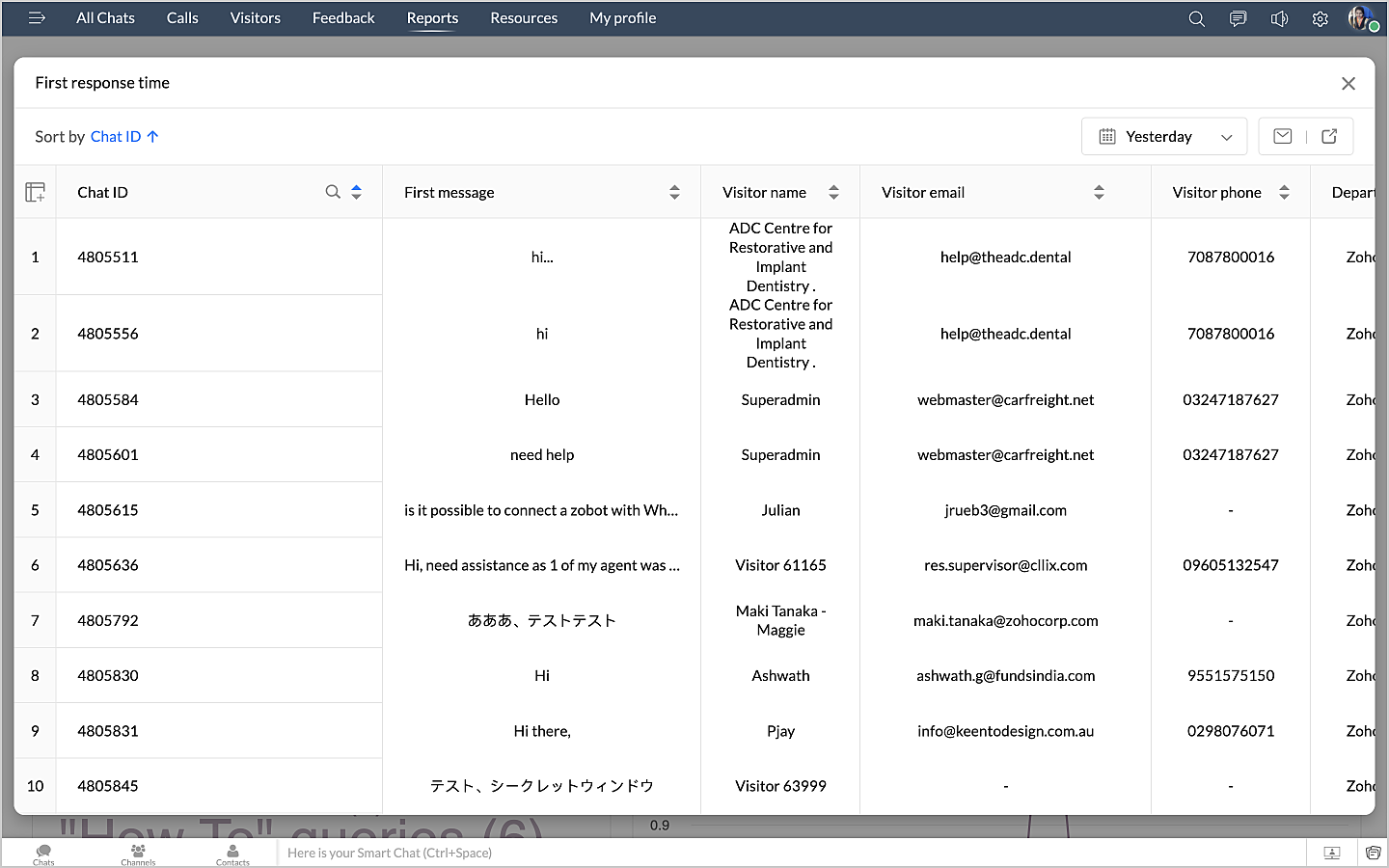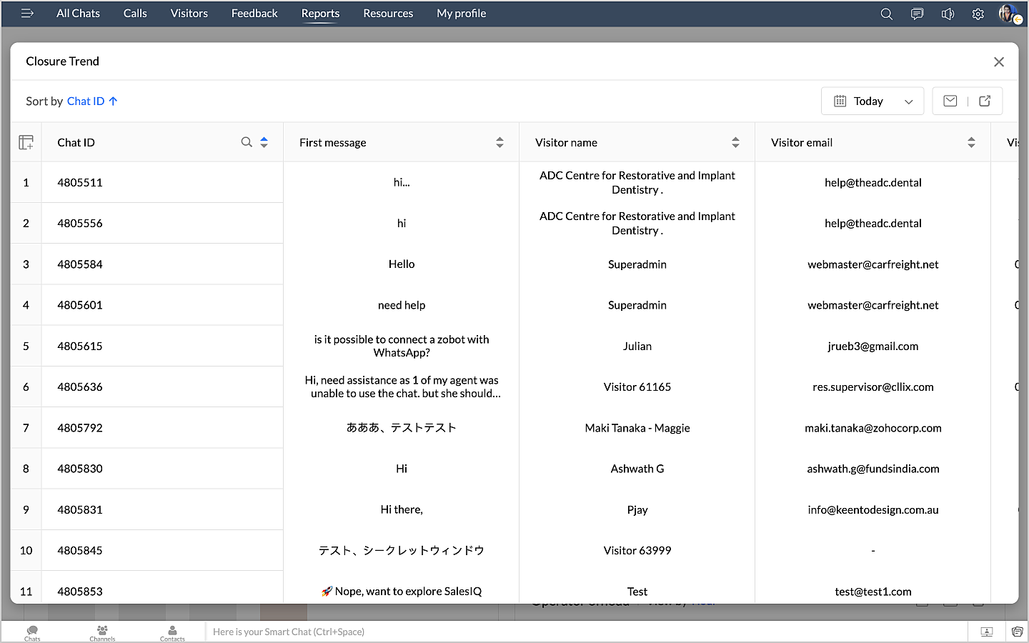 詳細表示アイコンをクリックすると、チャットの最初のメッセージや訪問者名などのデータが、チャットID別に表形式で表示されます。