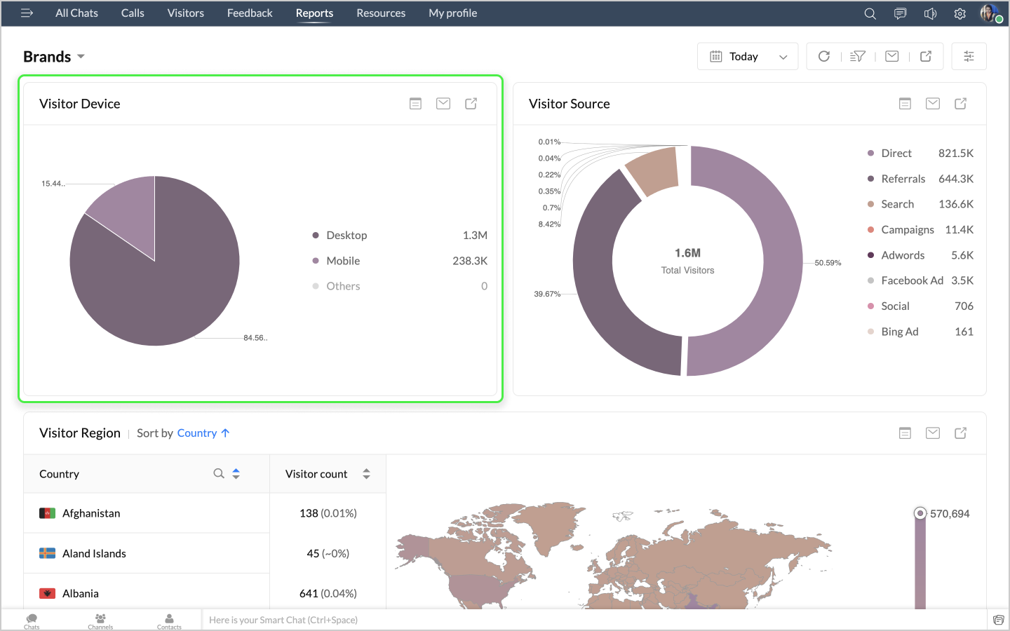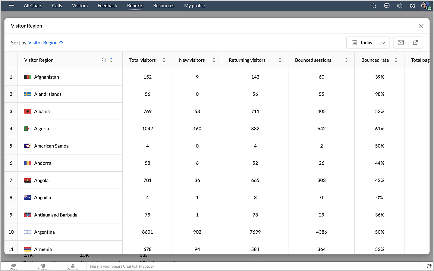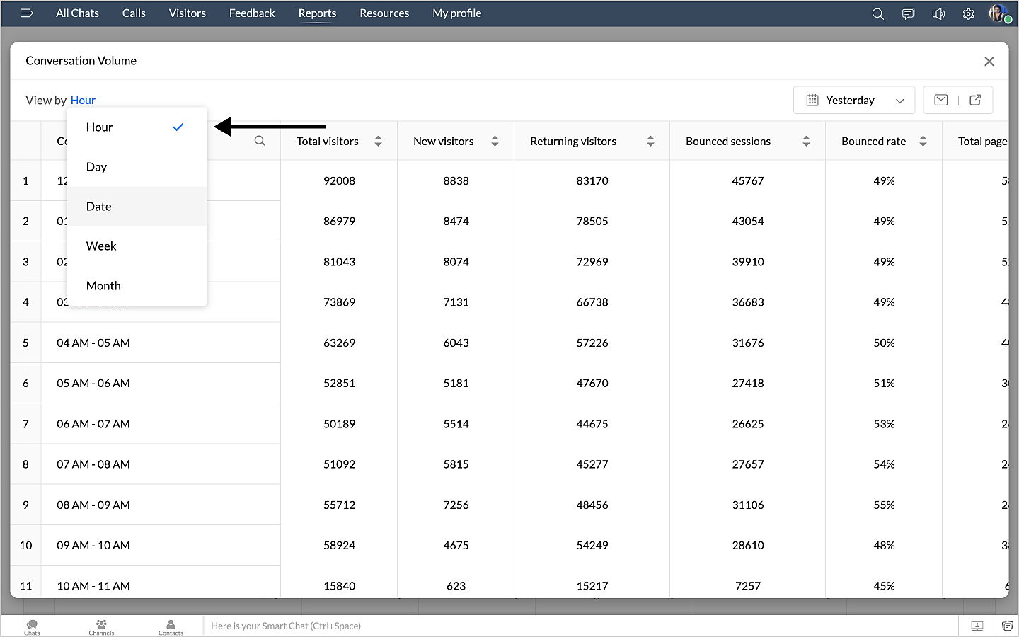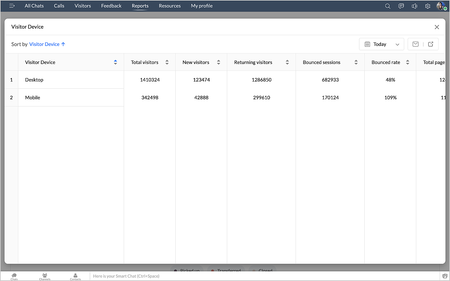 詳細表示アイコンをクリックすると、チャットの最初のメッセージや訪問者名などのデータが、チャットID別に表形式で表示されます。