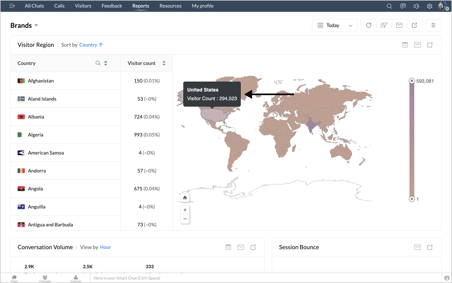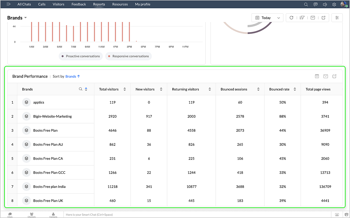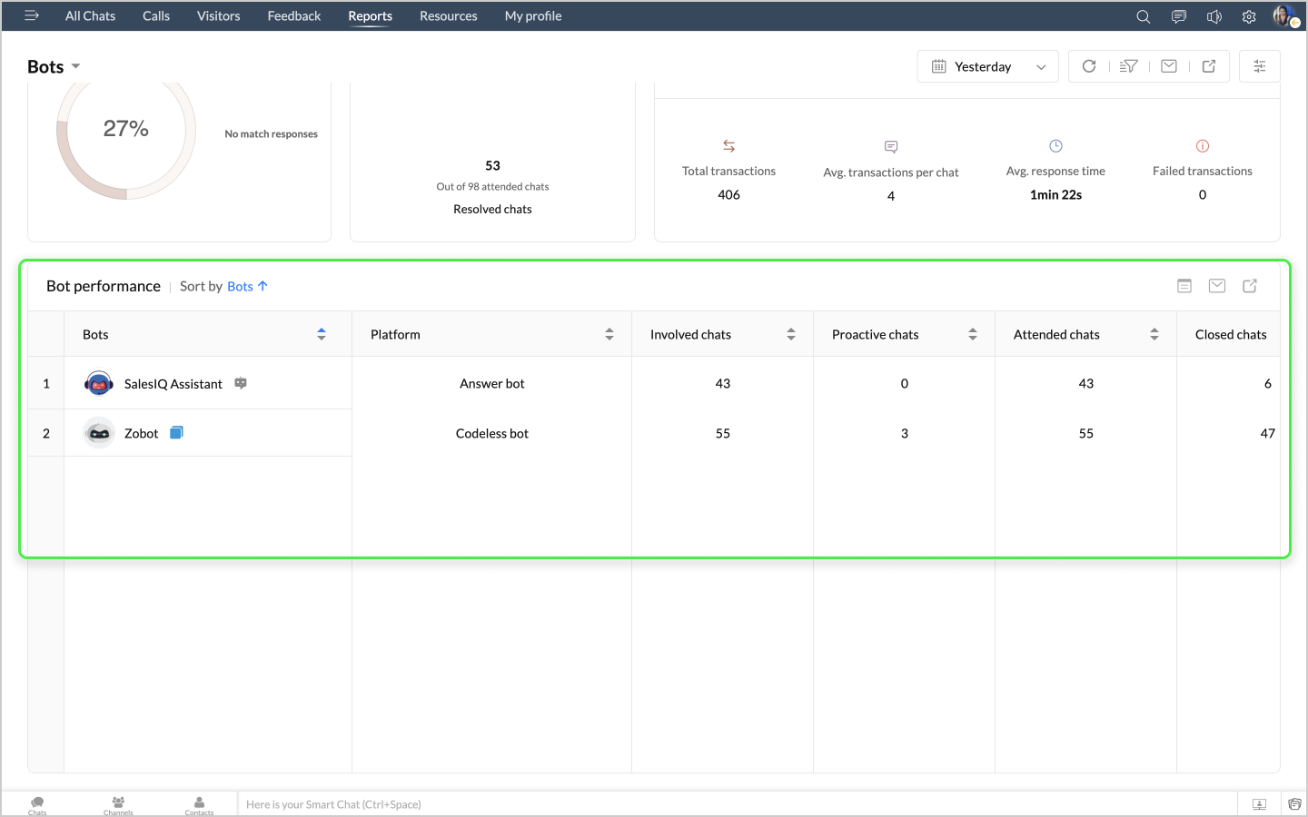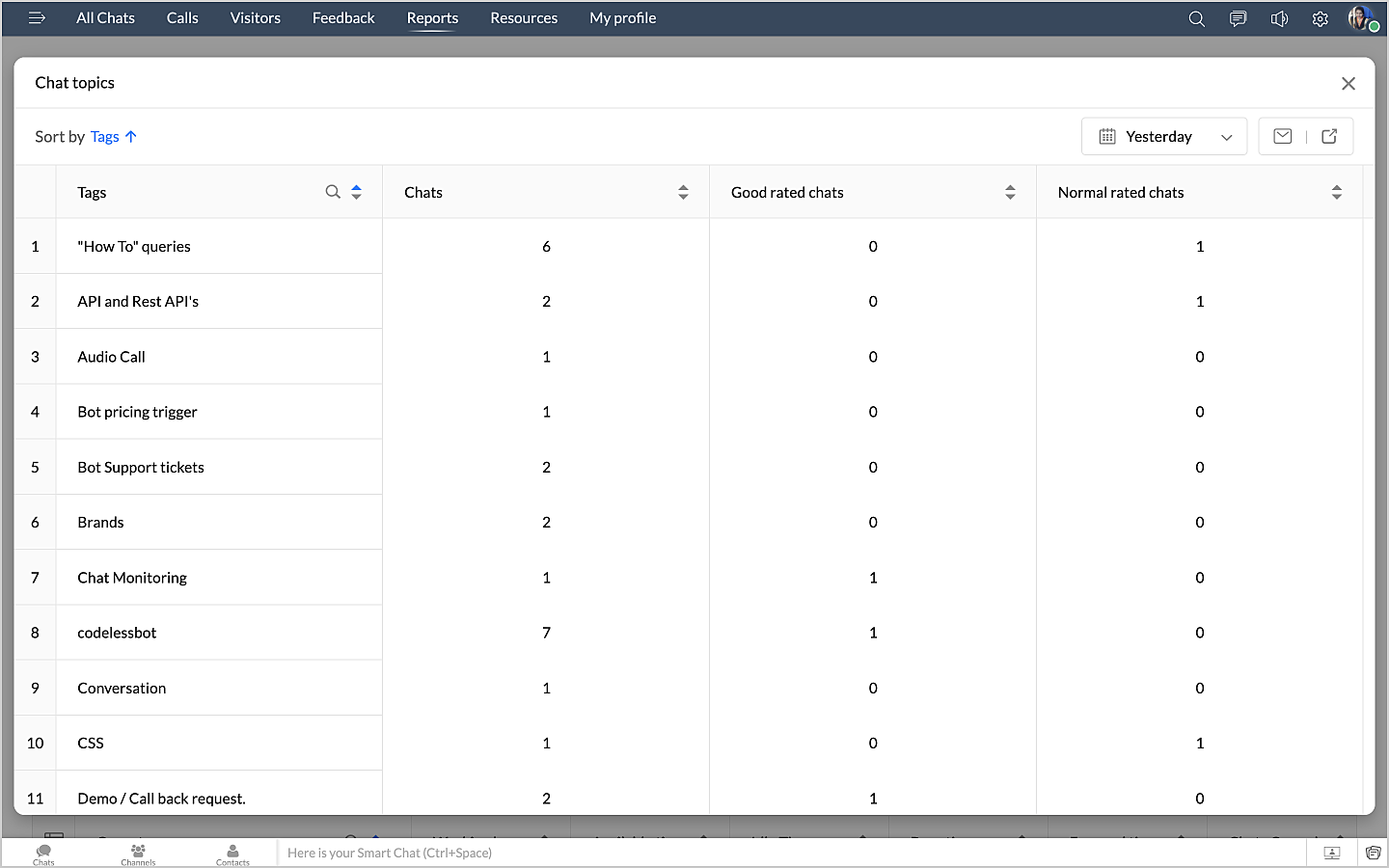 詳細表示アイコンをクリックすると、ボットによるチャットの最初のメッセージや訪問者名などのデータが、チャットID別に表形式で表示されます。