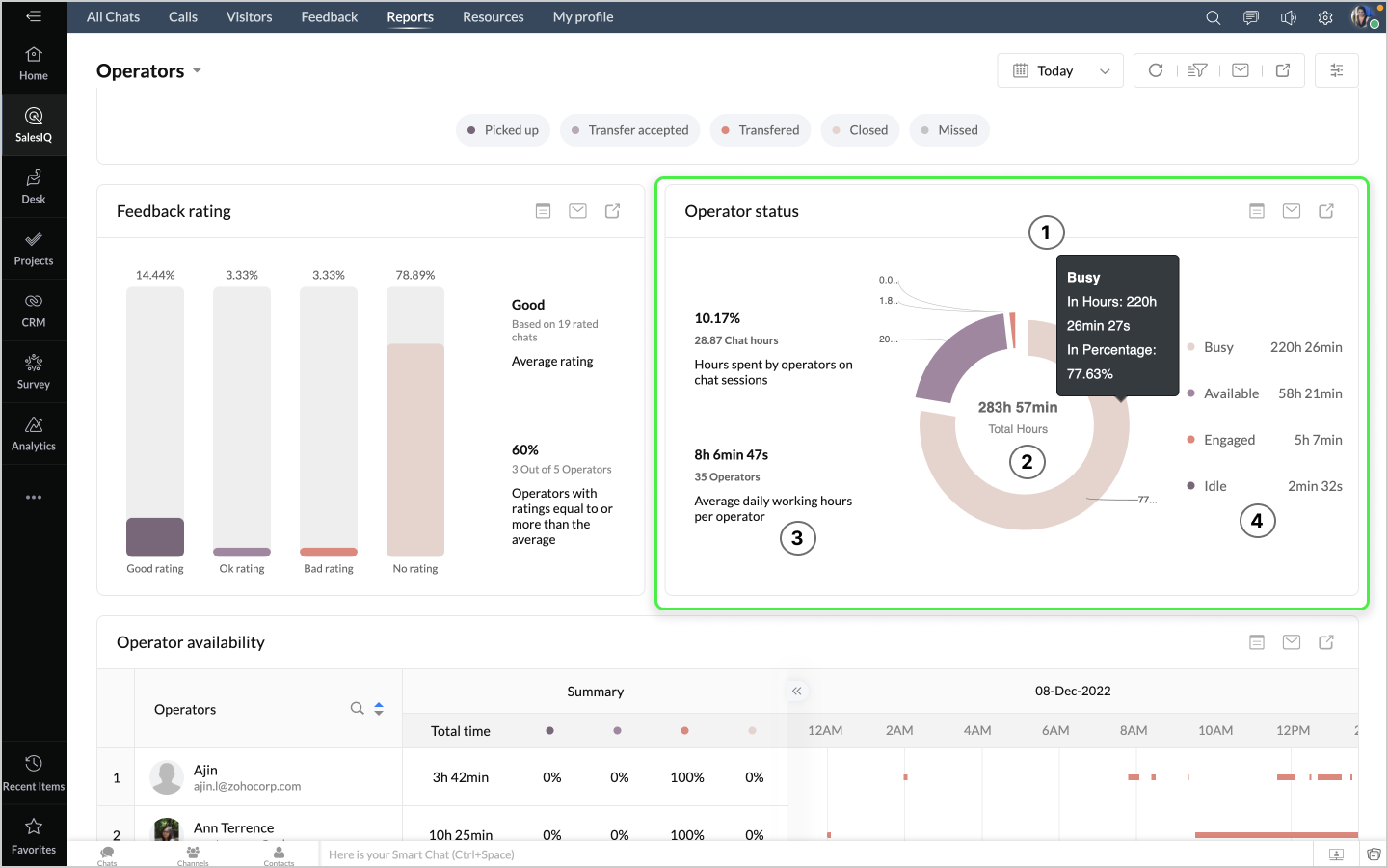 詳細表示アイコンをクリックすると、稼働時間(勤務時間)、取り込み中の時間、対応中の時間などのデータが、表形式で表示されます。
