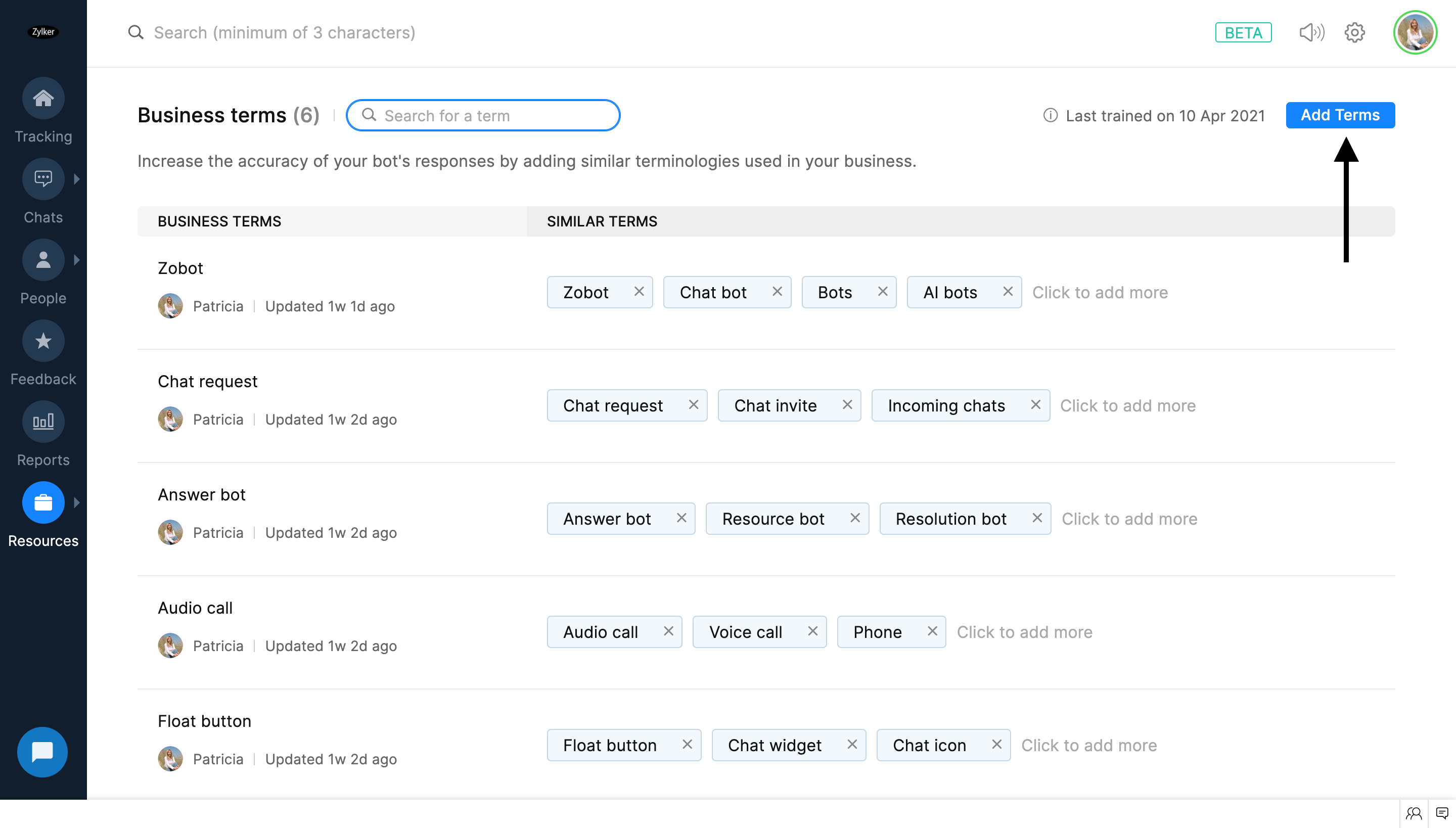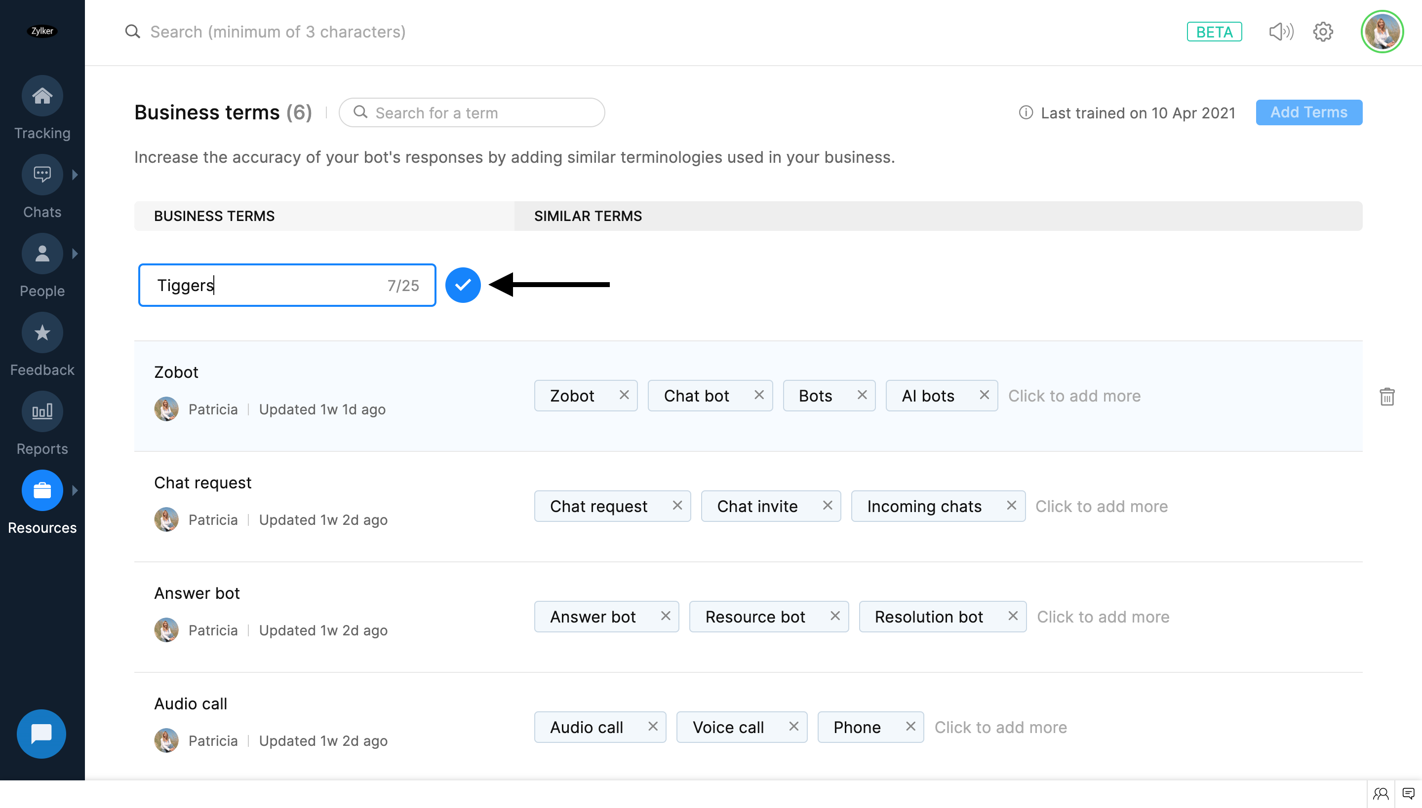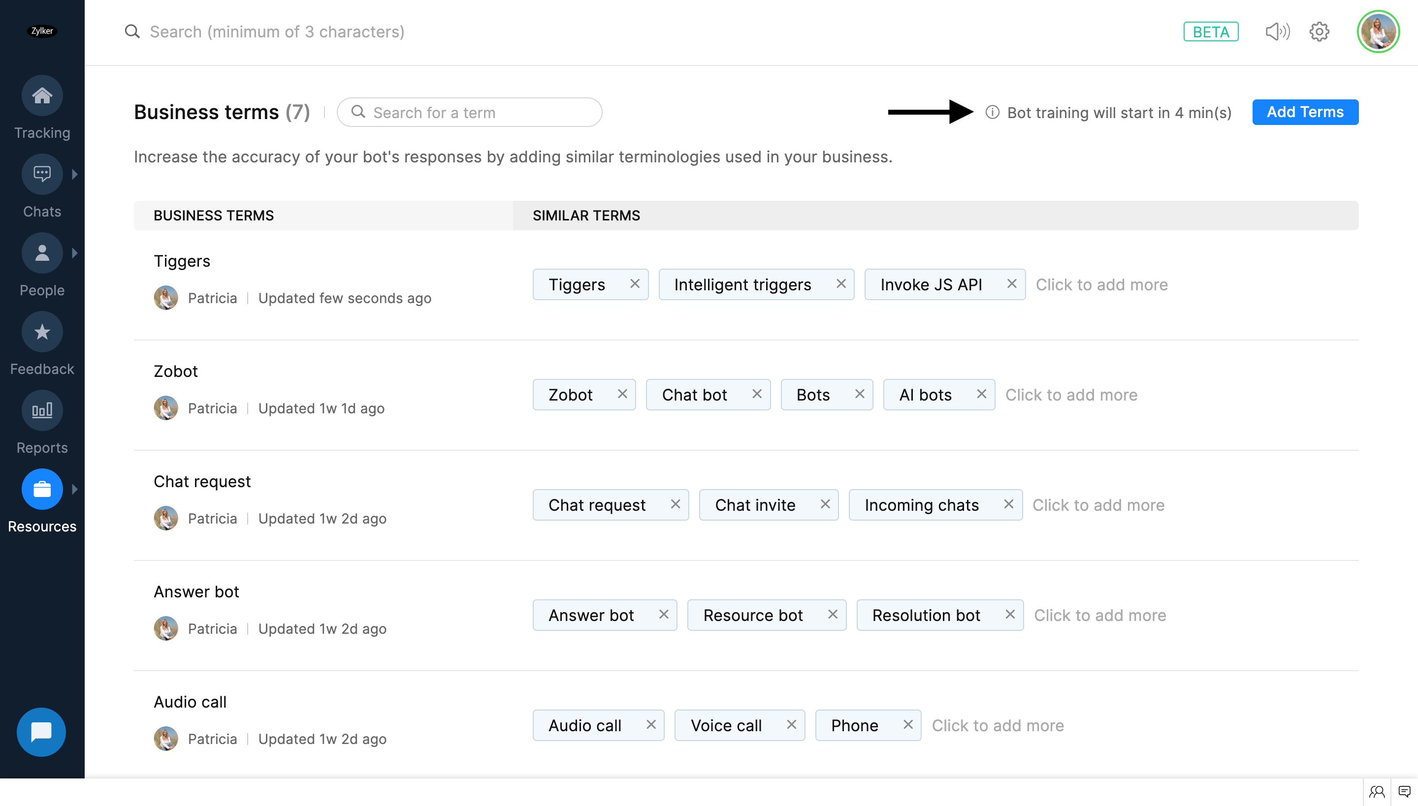 • 組織用語を追加すると、5分以内にボットのトレーニングが自動的に開始され、画面の右上に表示されます。ボットを手動でトレーニングする必要はありません。