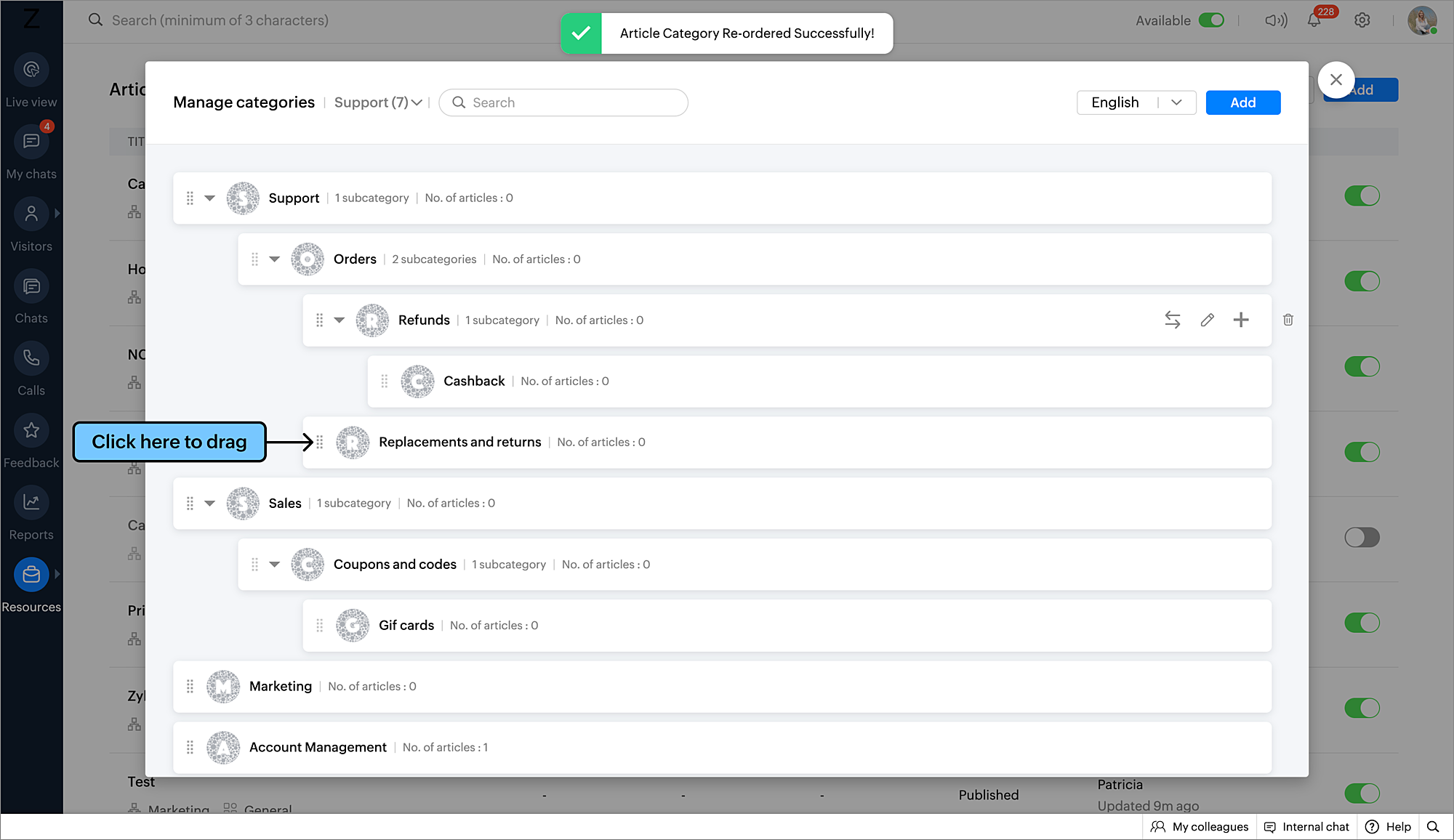 1つ目は、[カテゴリーの管理]ページで、カテゴリーの左側にカーソルを合わせてから、ドラッグ&ドロップして並べ替える方法です。並べ替えた順番は、訪問者に対して記事やよくある質問が表示される際に反映されます。