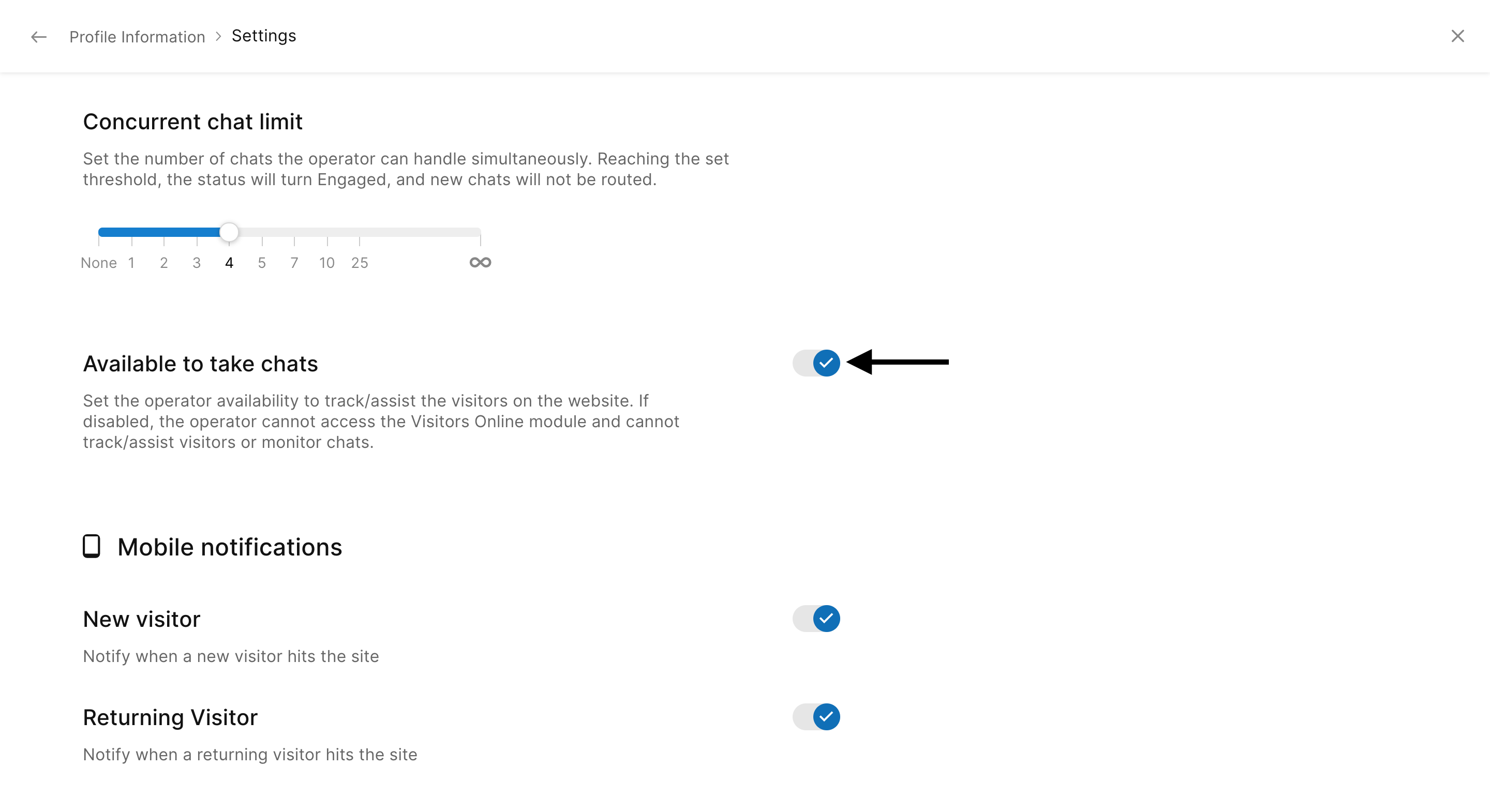 同時に対応可能なチャットの件数を設定できます。設定した件数に達すると、ステータスが「対応中」に変更されます。進行中のチャットが終了するまで、新しいチャットはあなたに割り当てられません。