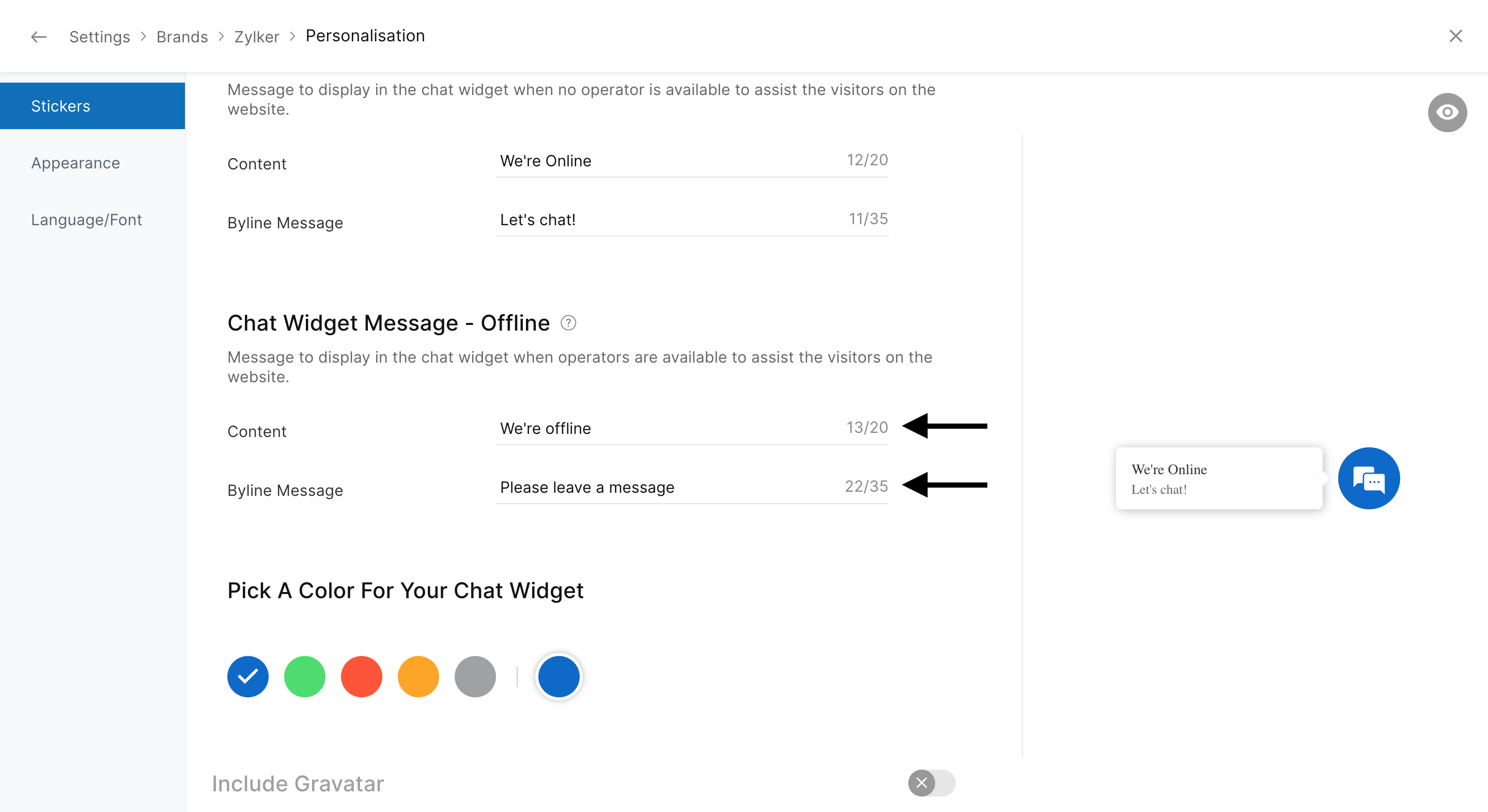 [表示画像]ページで、下にスクロールして [チャットウィジェットのメッセージ - オフライン] を表示します。メッセージの内容と署名メッセージの欄のテキストを編集します。画面の上部に表示されたポップアップ画面で、 [保存する] をクリックして、変更内容を保存します。