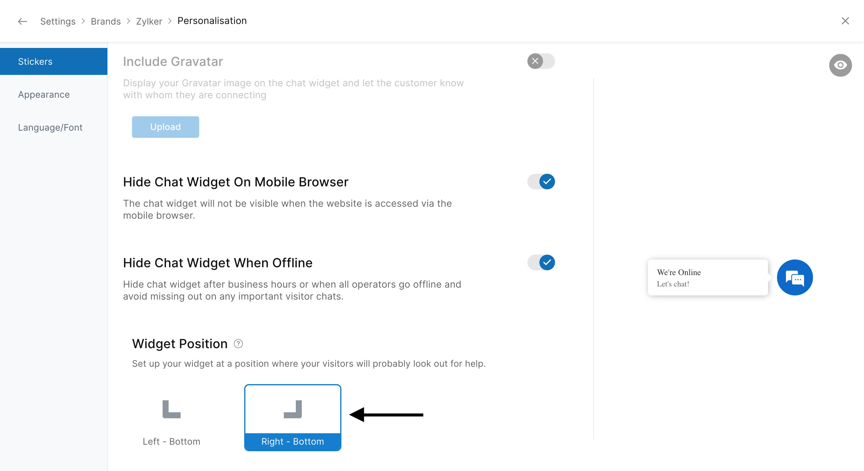 - [表示画像]ページで下にスクロールし、[ウィジェットの位置]設定を表示します。チャットウィジェットの表示位置として、[左下]または[右下]を選択します。画面の上部に表示されたポップアップ画面で、 [保存する] をクリックして、変更内容を保存します。