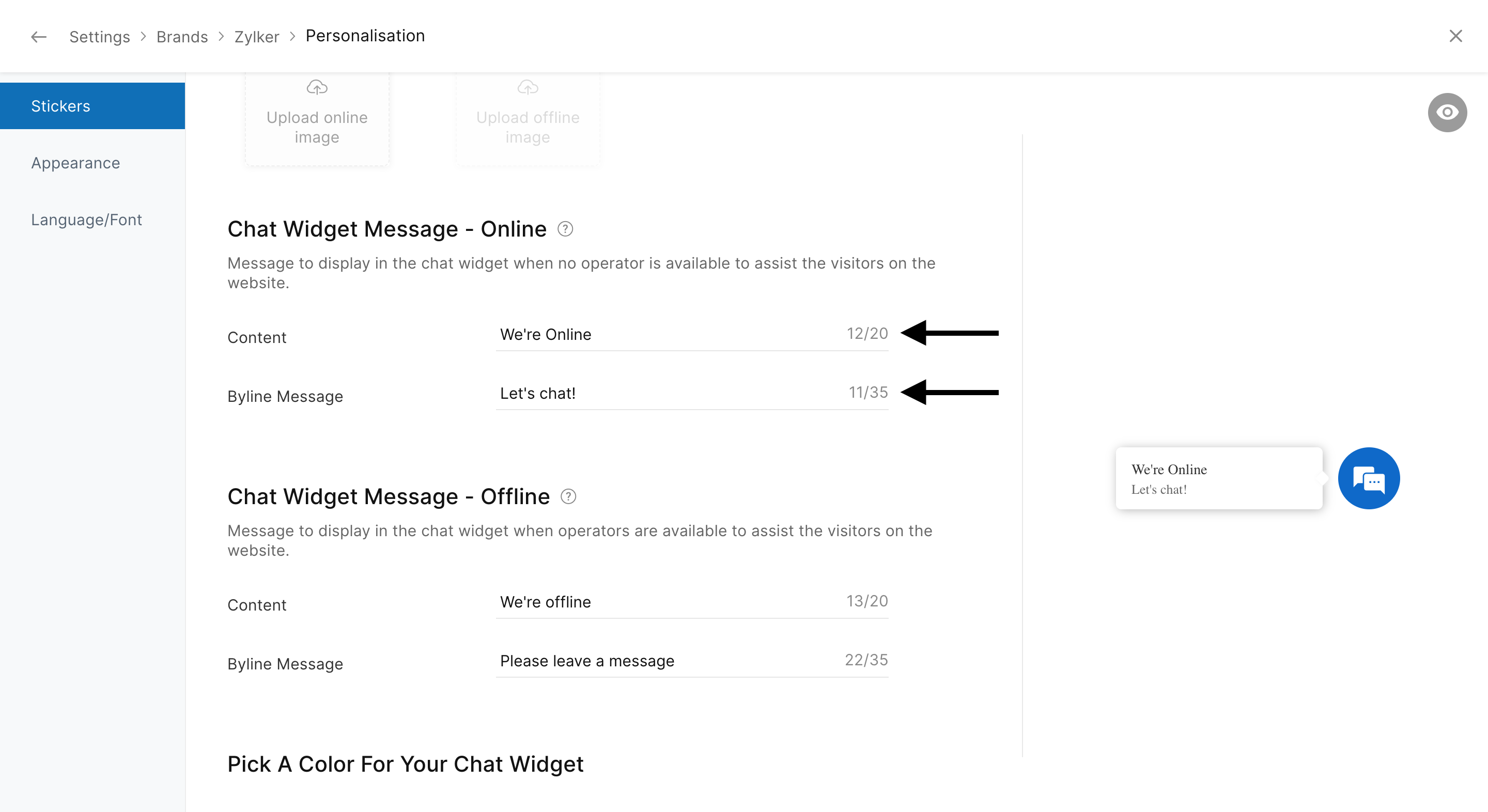 [表示画像]ページで、下にスクロールして [チャットウィジェットのメッセージ - オンライン] を表示します。メッセージの内容と署名メッセージの欄のテキストを編集します。画面の上部に表示されたポップアップ画面で、 [保存する] をクリックして、変更内容を保存します。