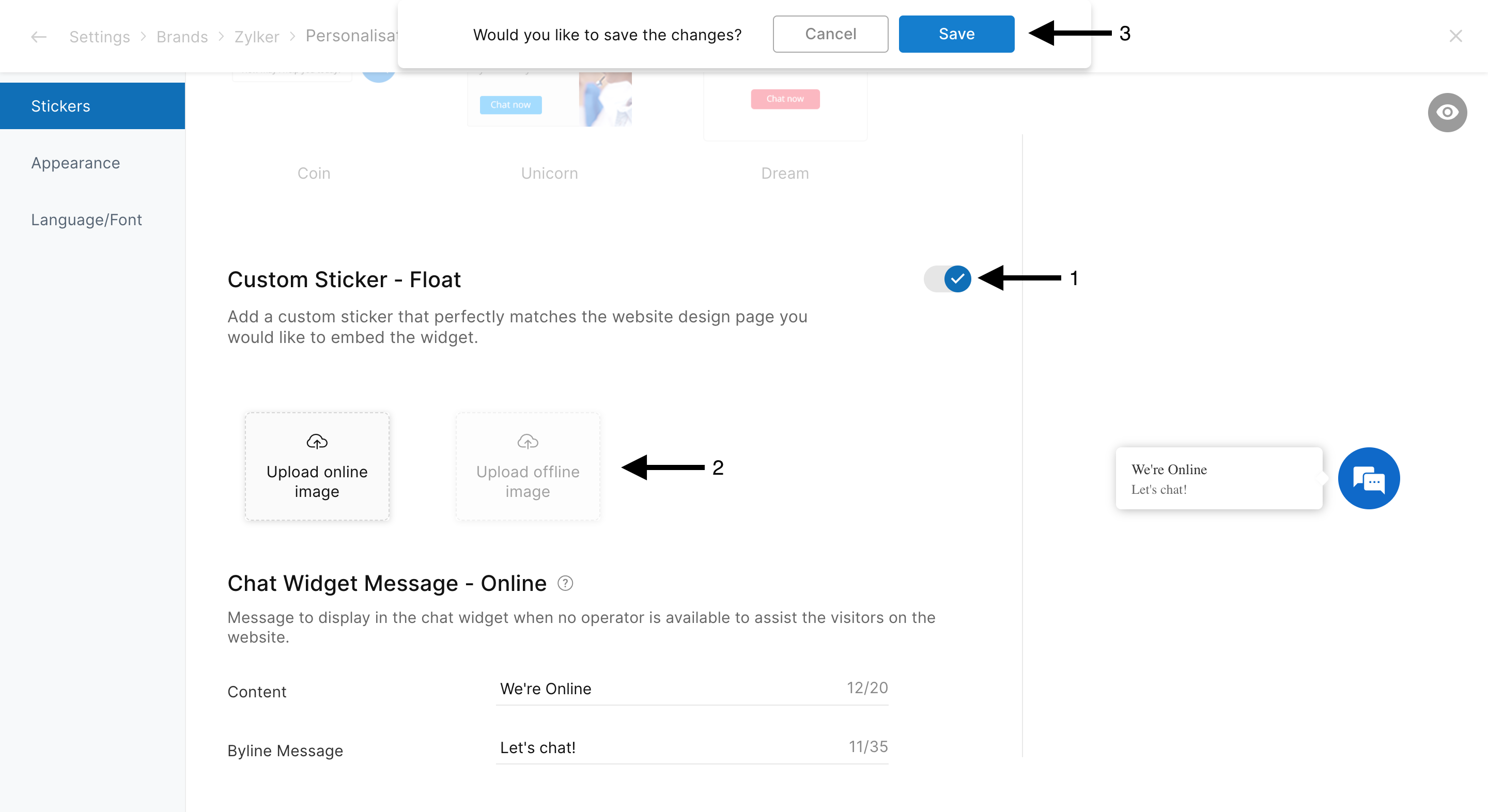 - [表示画像]ページの下部にある[独自の表示画像 - フロート]または[独自の表示画像 - ボタン]設定のスイッチを切り替えて、有効にします。[オンライン時の画像をアップロードする]をクリックします。