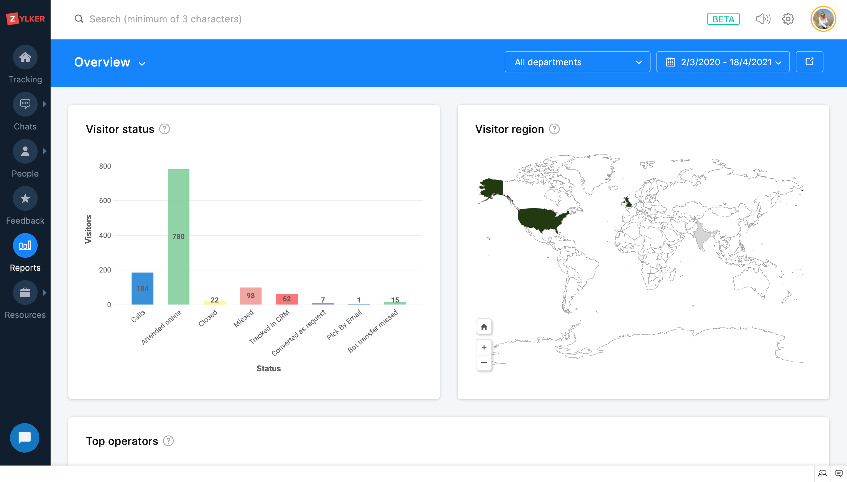 [レポート]タブでは訪問者の追跡情報に関するレポートを表示できます。Webサイトへの訪問やチャットの状況を手軽に確認することが可能です。