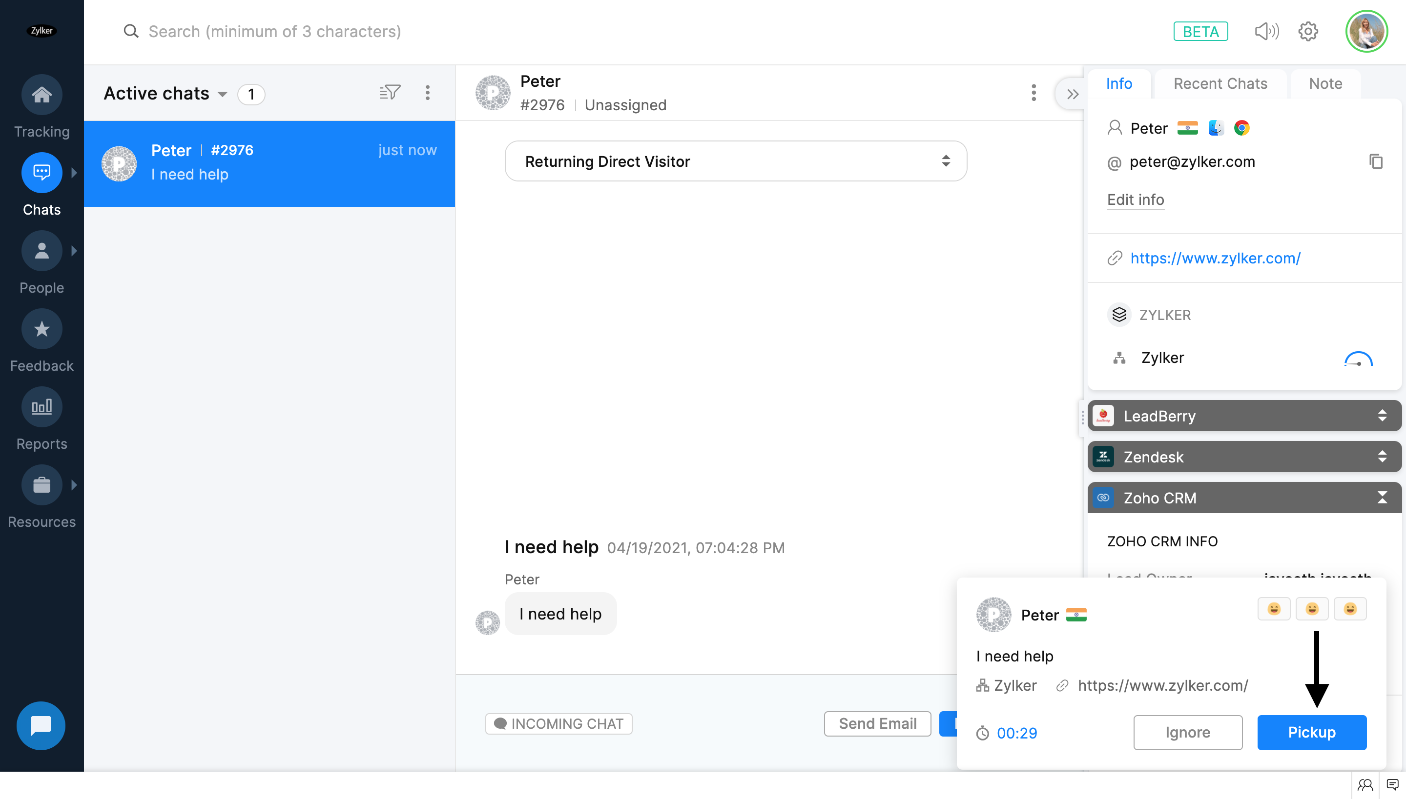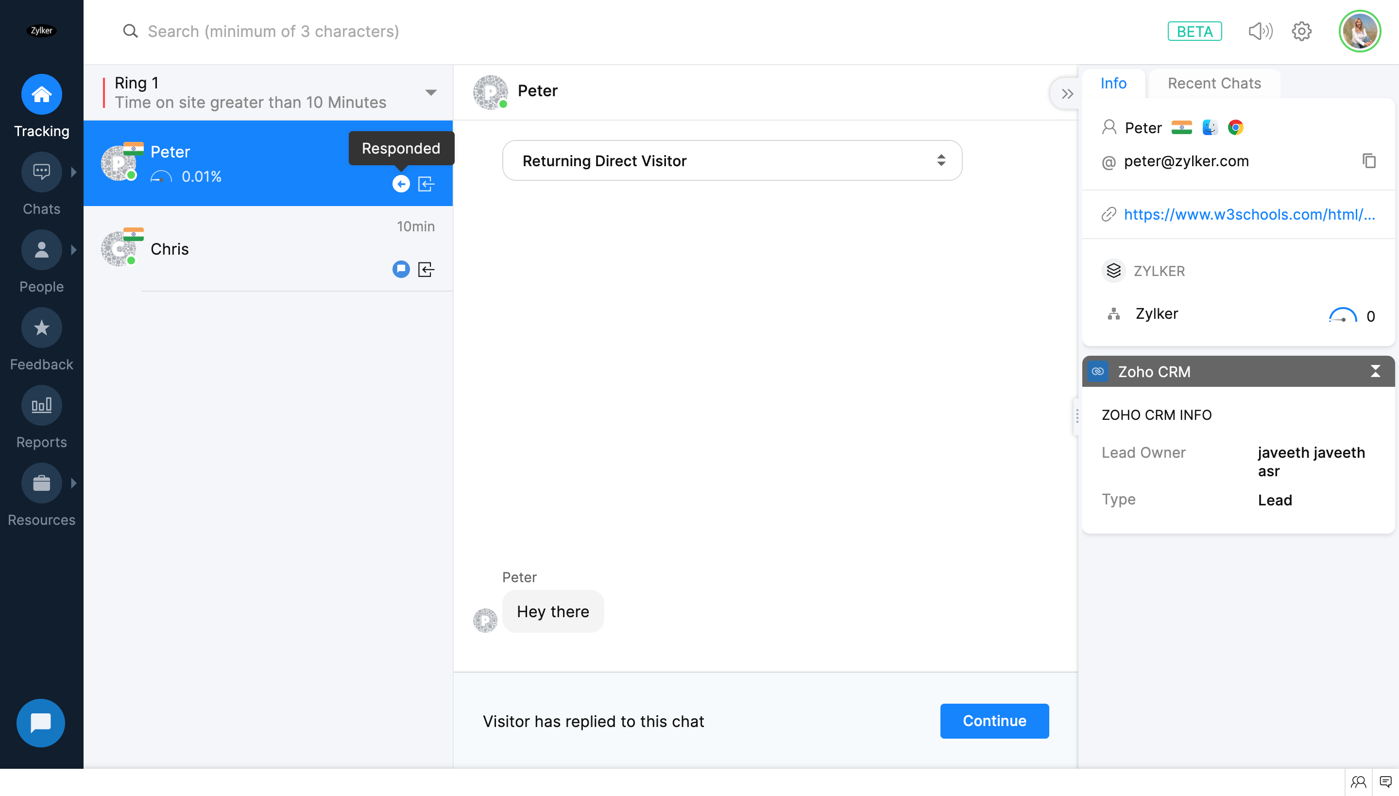 [追跡]タブで、訪問者をクリックすると、担当者のチャットウィンドウが開きます。担当者のチャットウィンドウでは、訪問者の詳細、行動、その他の情報を確認できます。