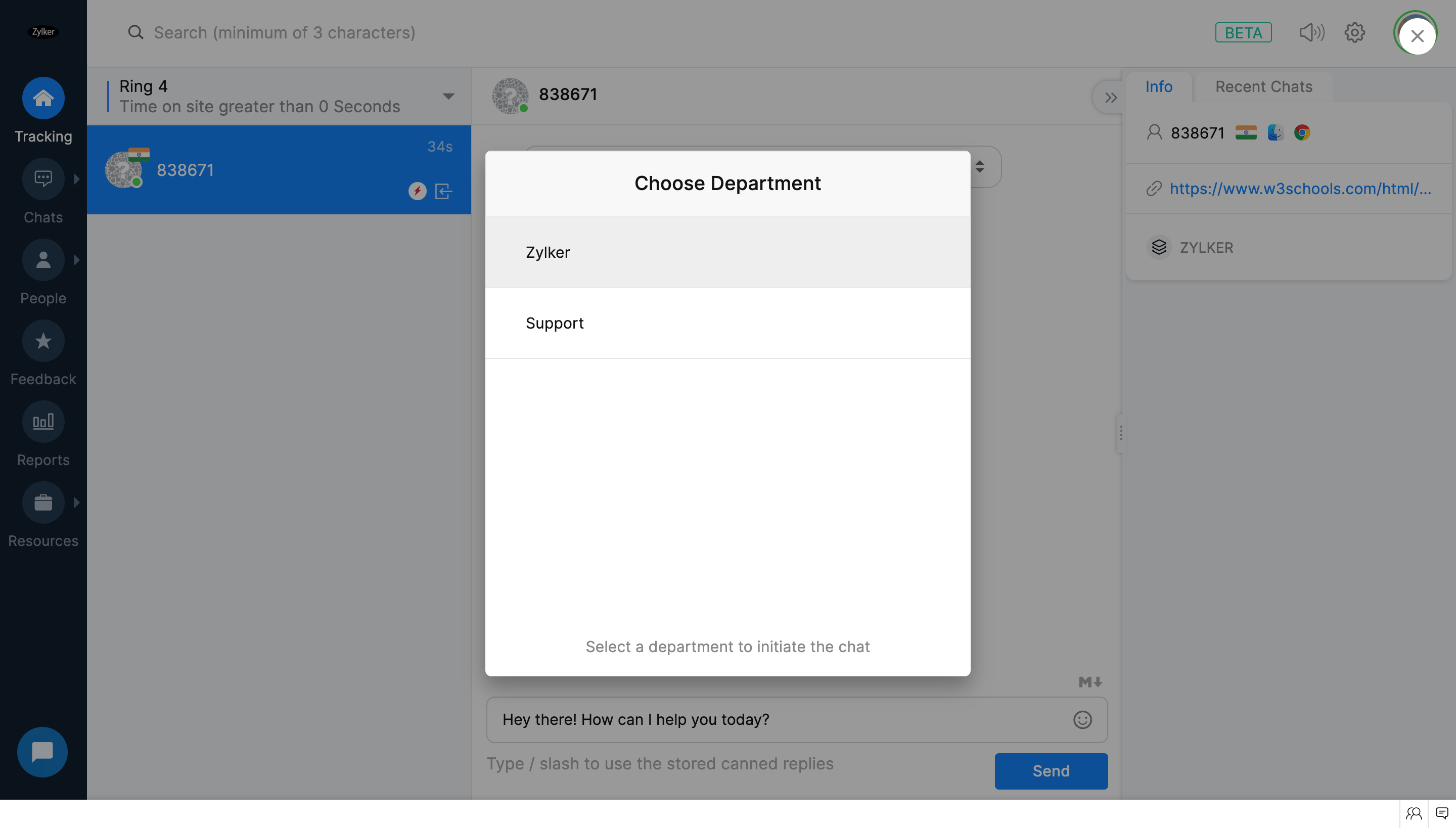 ブランドが複数の部門に関連付けられている場合は、訪問者とのチャットを関連付ける部門を選択できます。