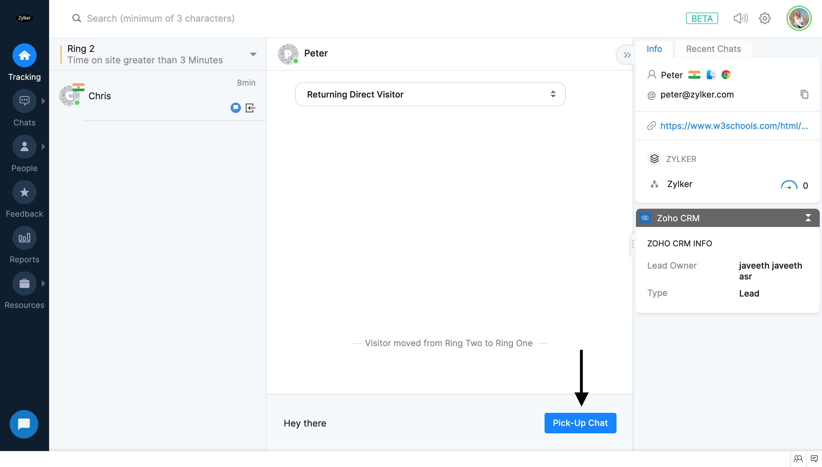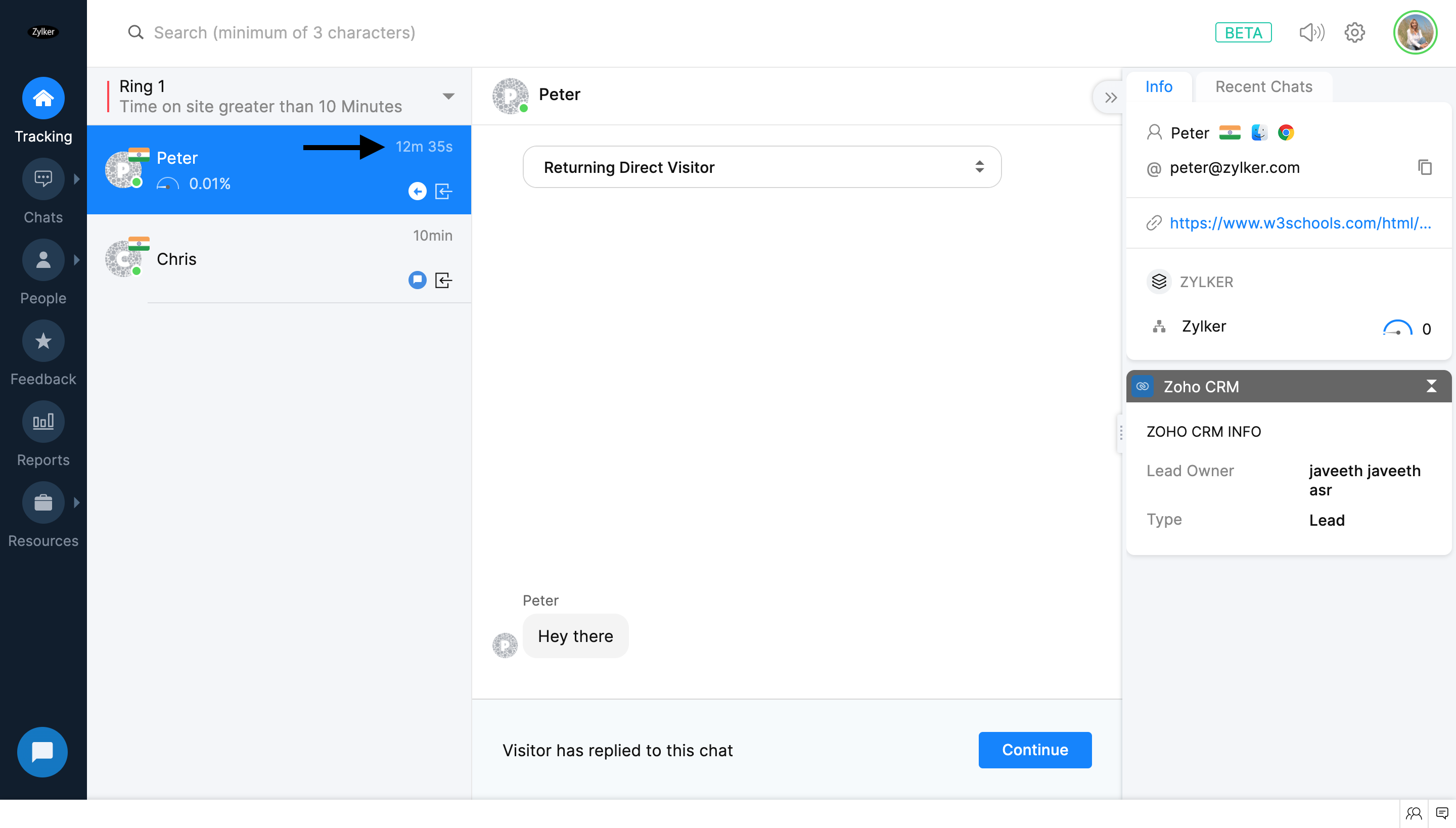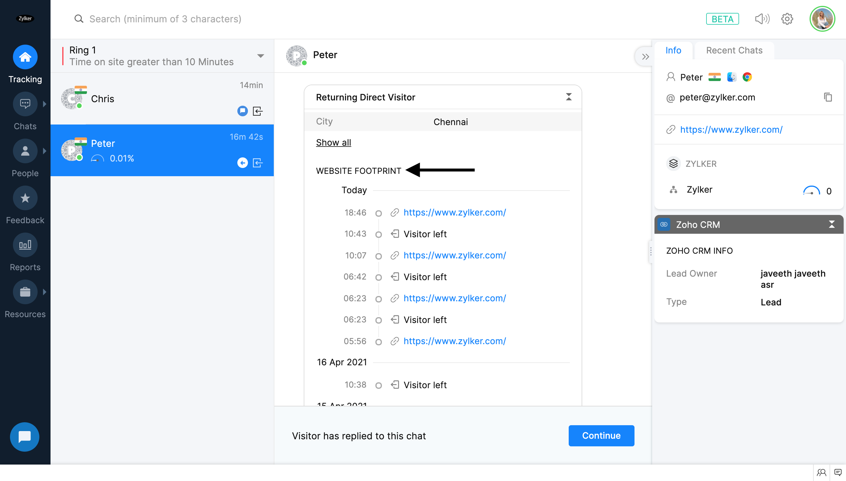 [追跡]タブで、チャットする訪問者をクリックします。