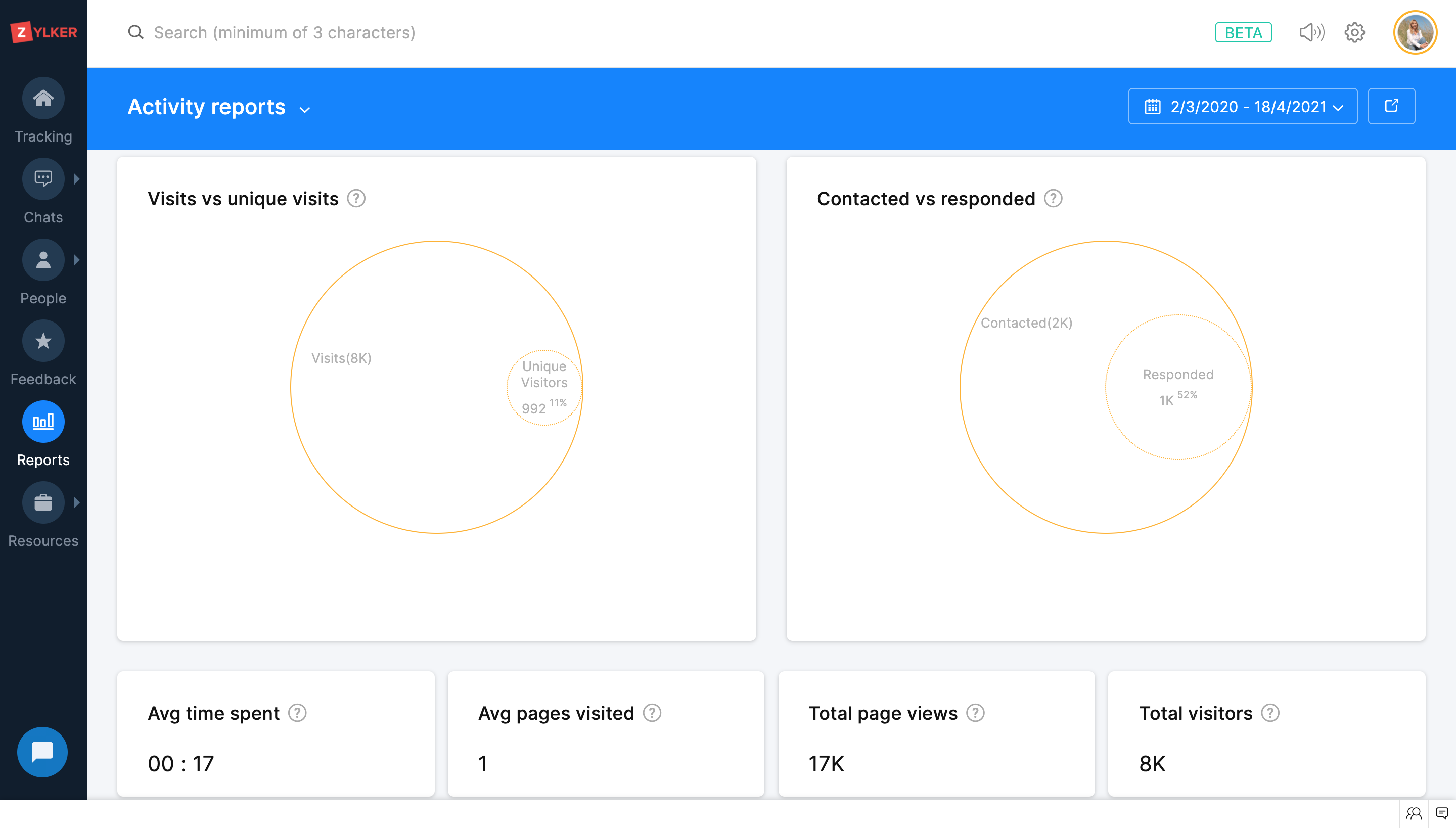 Zoho SalesIQの画面左側のメニューから[レポート]タブをクリックすると、訪問者の追跡情報や担当者の活動に関する概要レポートを確認できます。左上にあるレポート名のメニューから[活動レポート]を選択すると、訪問者の詳細やチャットの状況に関するレポートを確認できます。