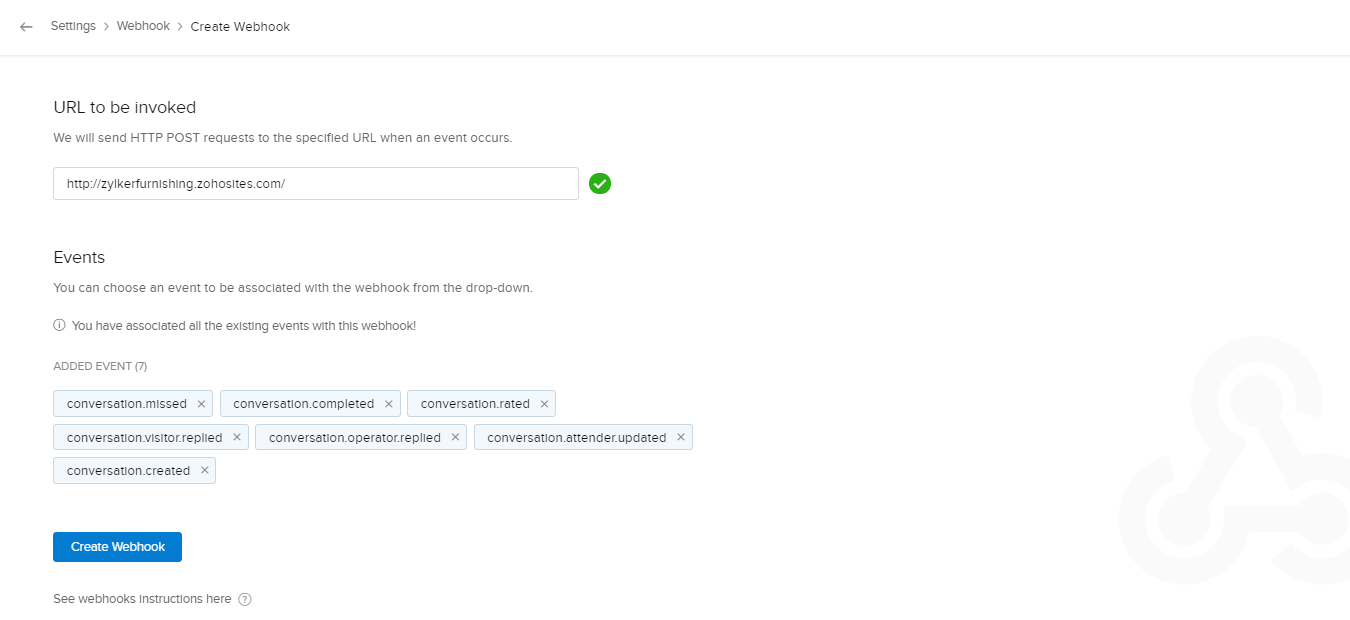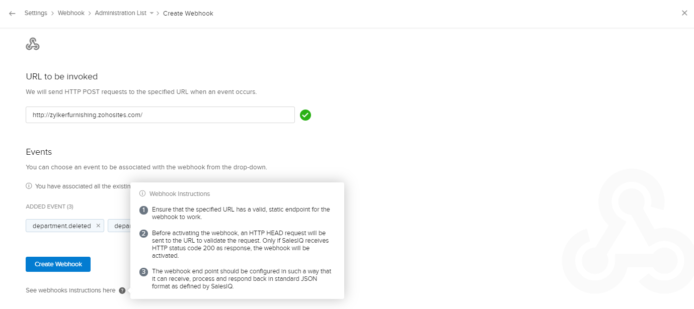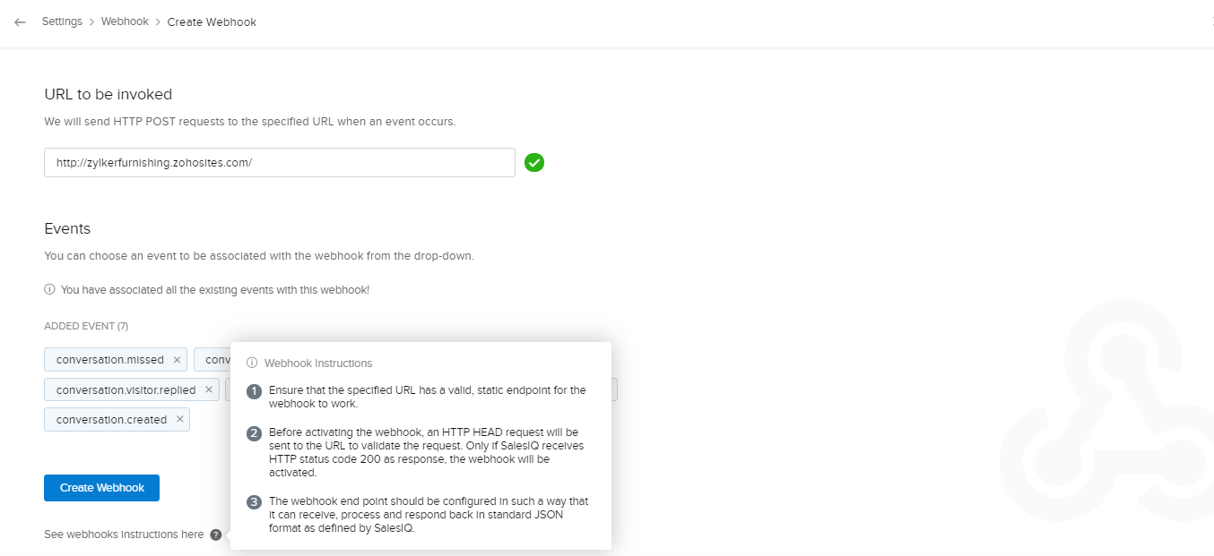 SalesIQで購読しているイベントが発生すると、Webhookが呼び出されます。例えば、conversation。visitor。repliedに購読している場合、訪問者がチャットに返信すると関連データとともに通知されます。