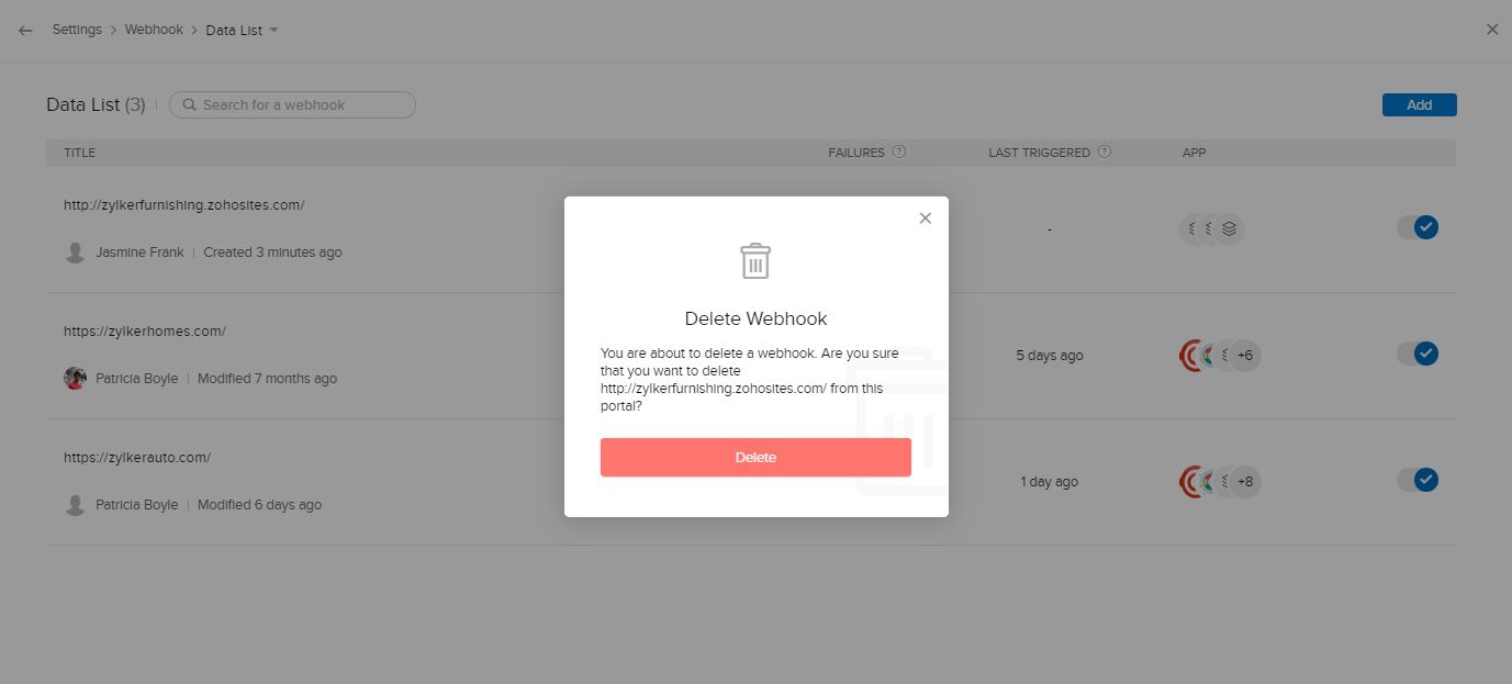 - 確認のポップアップが表示されます。削除をクリックすると、Webhookが削除されます。