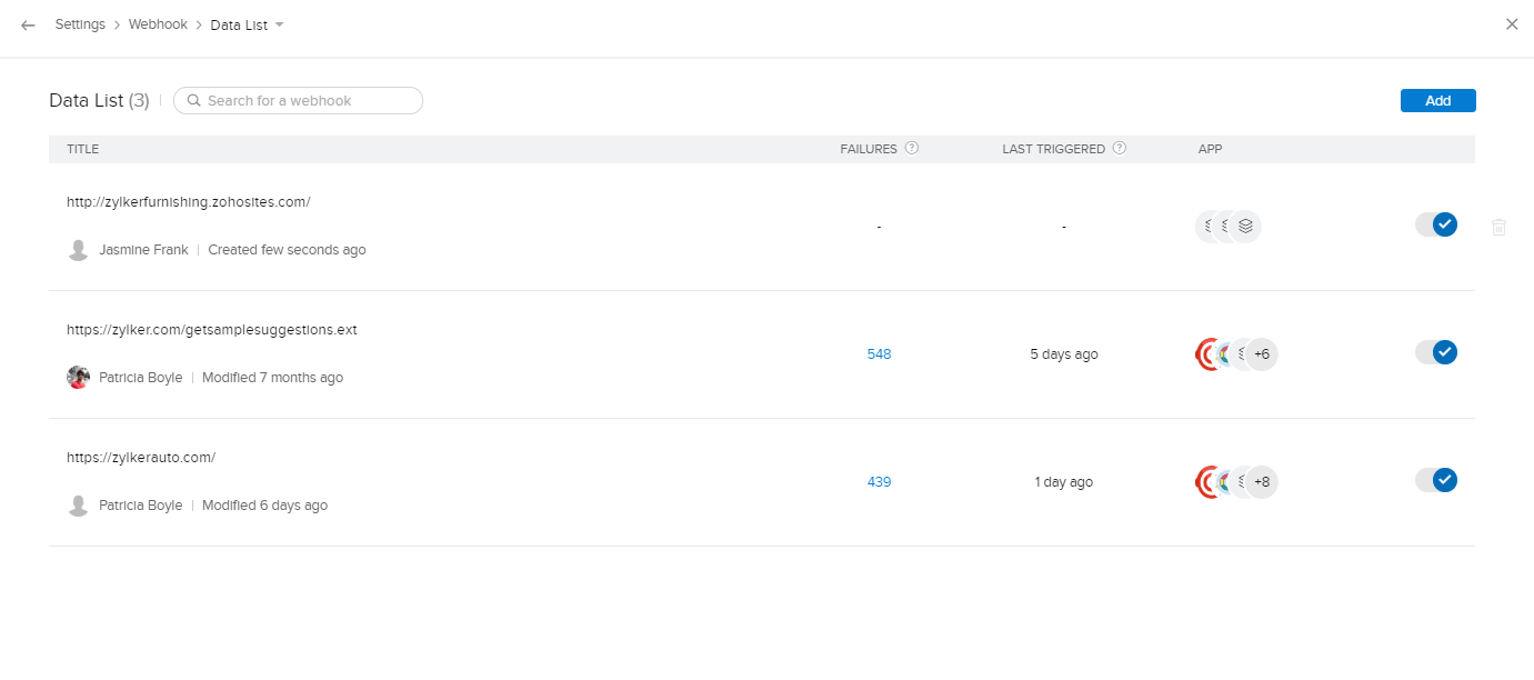 - 各Webhookの右端に表示されるトグルボタンをクリックします。
