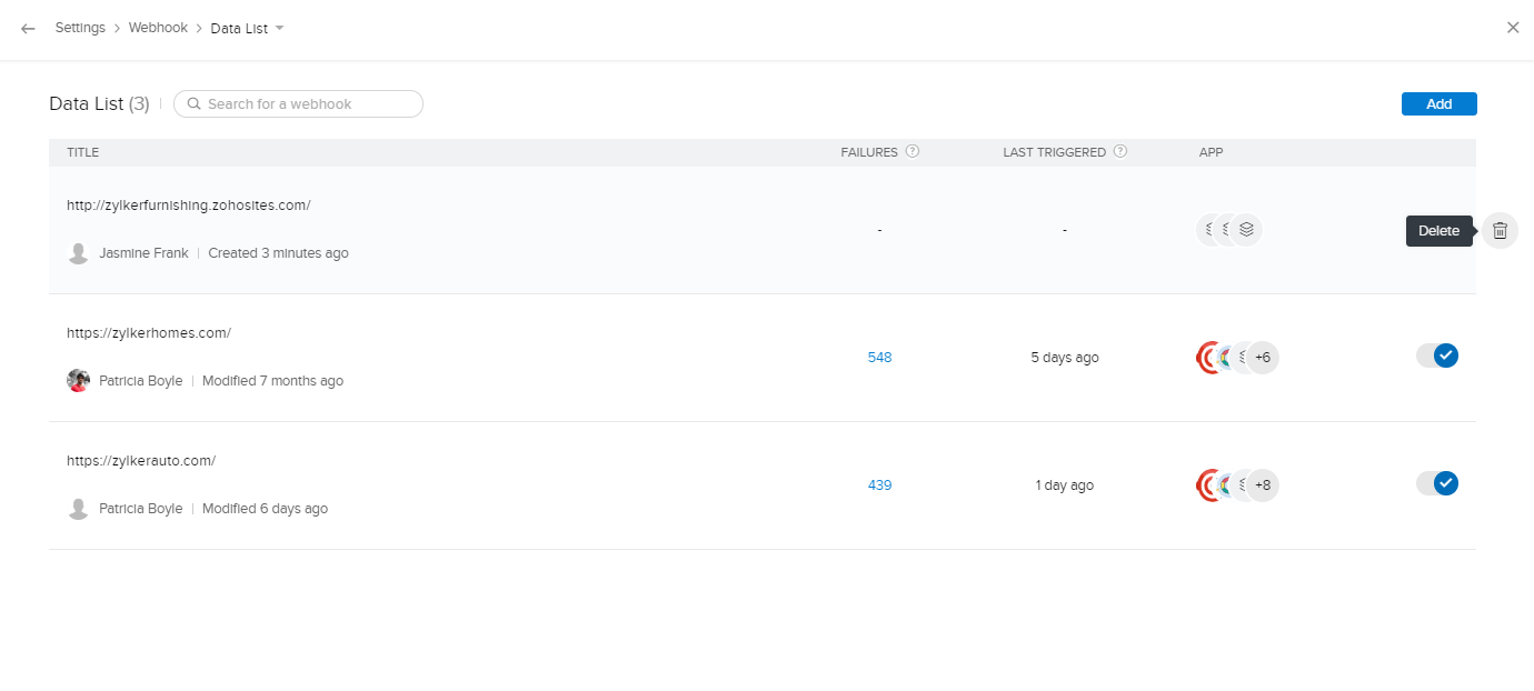 - ダッシュボードで削除したいWebhookにカーソルを合わせ、右端に表示される削除アイコンをクリックします。