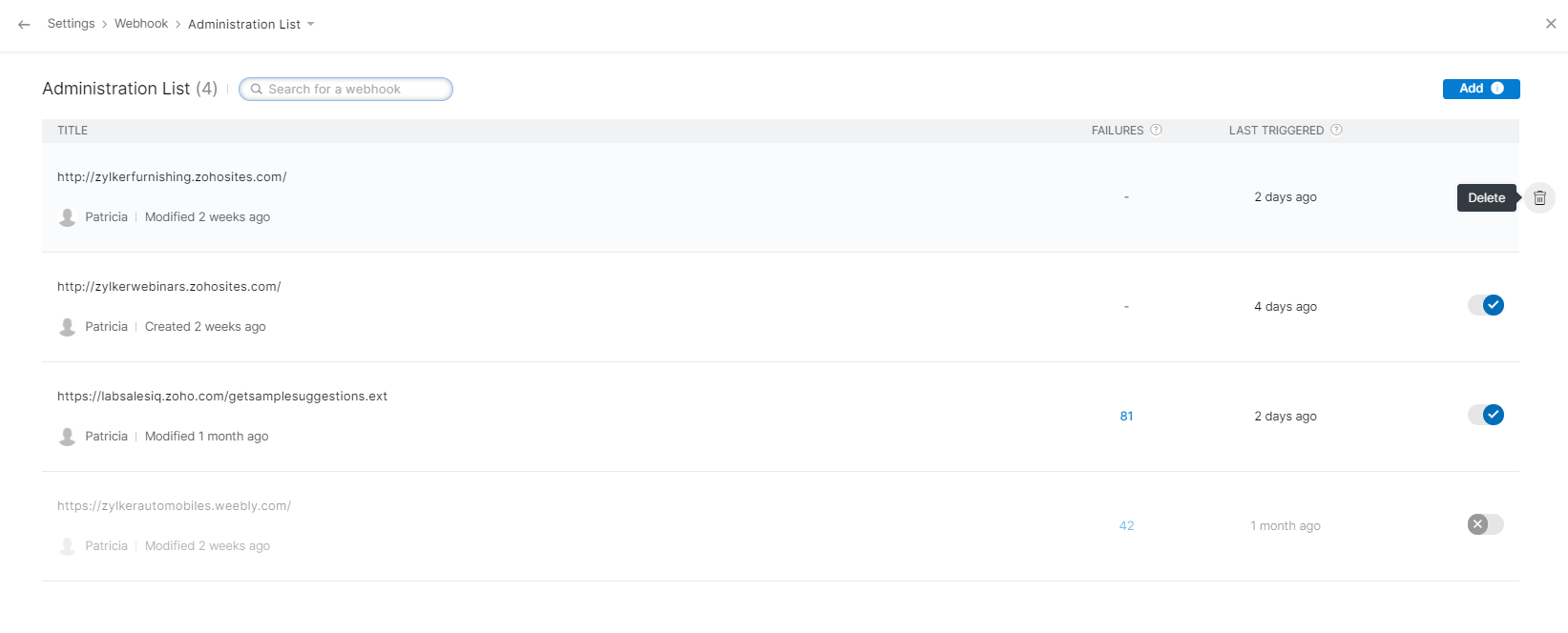 ケース2:Webhookが登録された処理の投稿時にHTTPコード410を返した場合、SalesIQシステムはWebhookを削除し、ポータル担当者とWebhook作成者の両方にメールが送信されます。