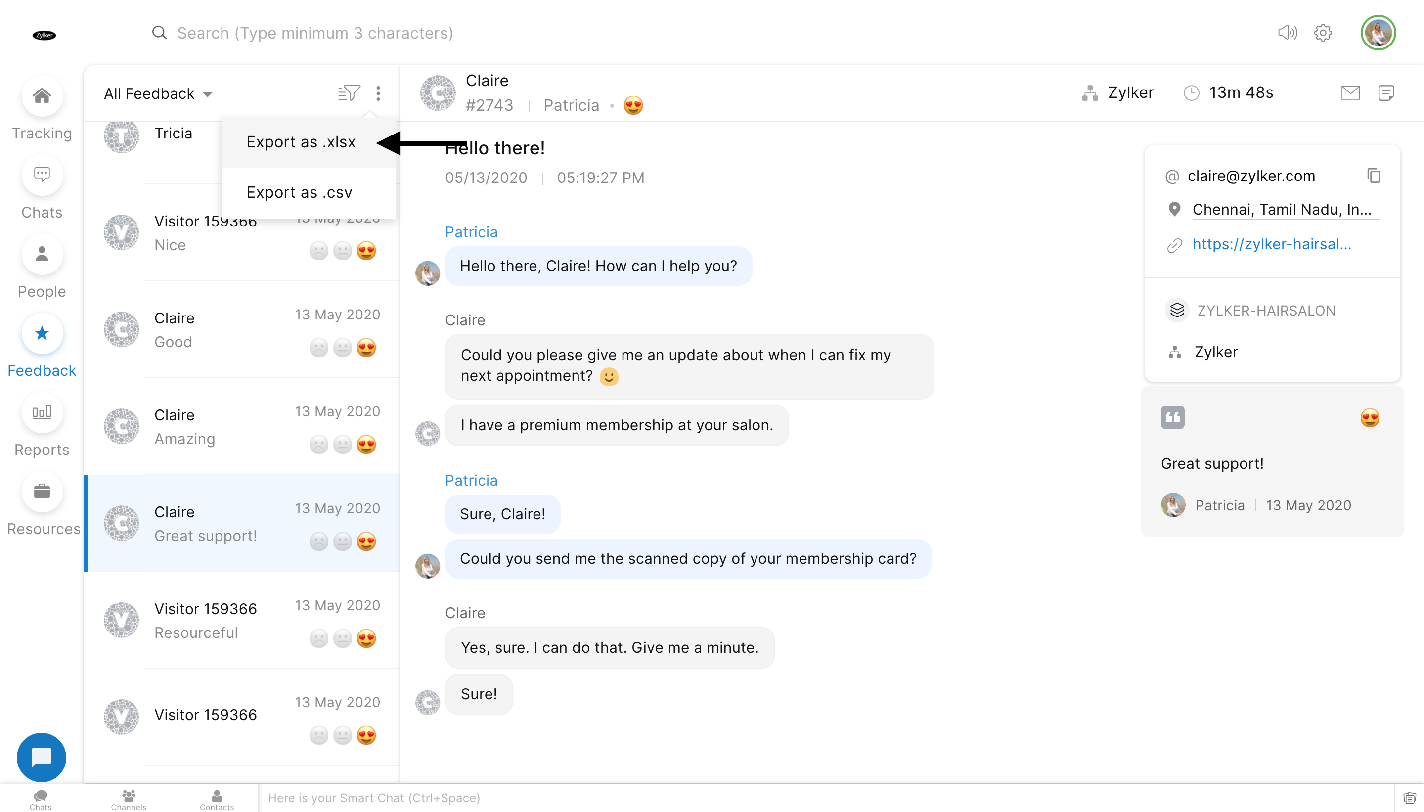 訪問者からのフィードバックデータをエクスポートし、詳細に分析して顧客サポートの改善に役立てたり、担当者に送信したりできます。訪問者のデータは、.csv形式または.xlsx形式のファイルでダウンロードできます。