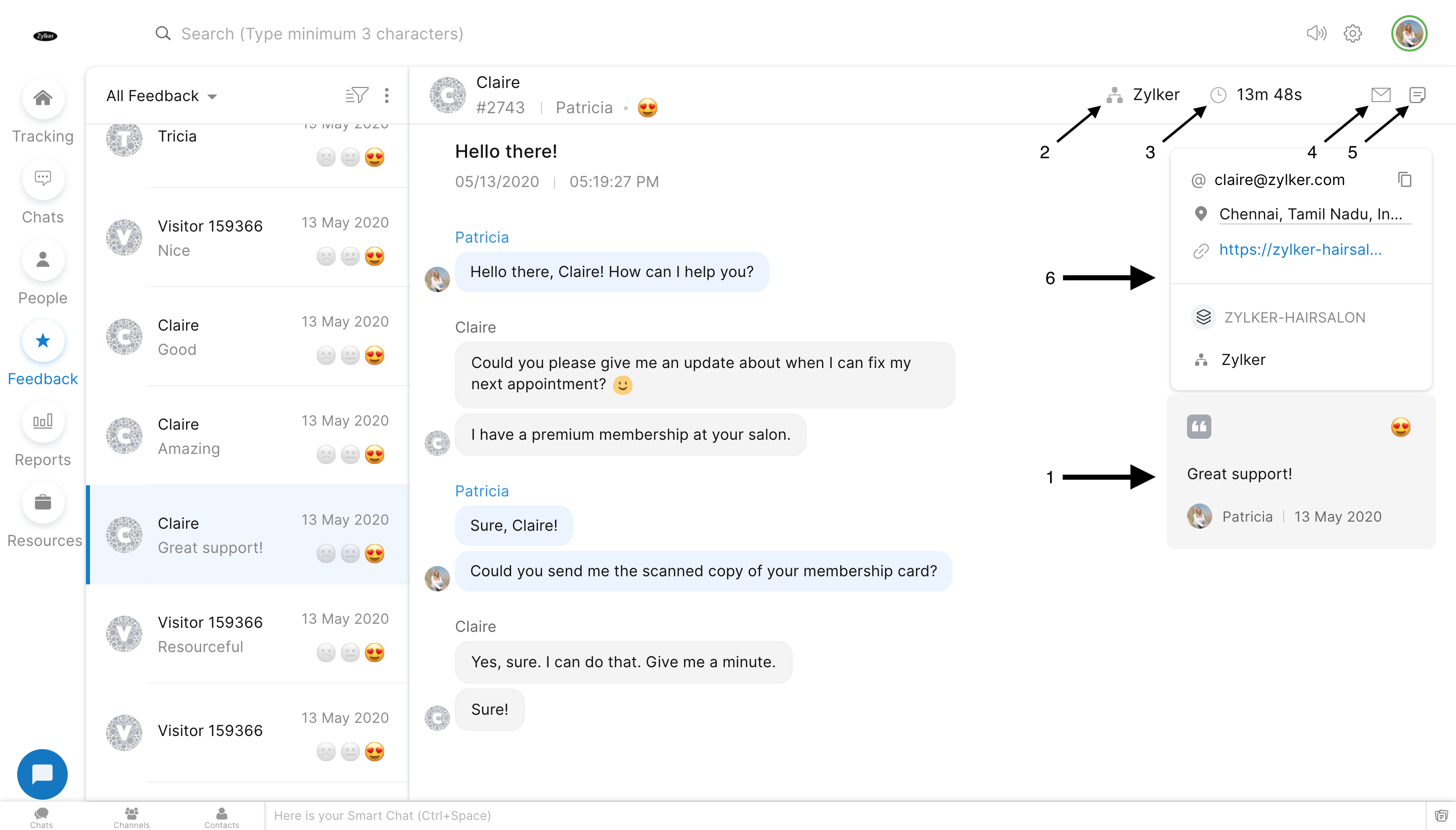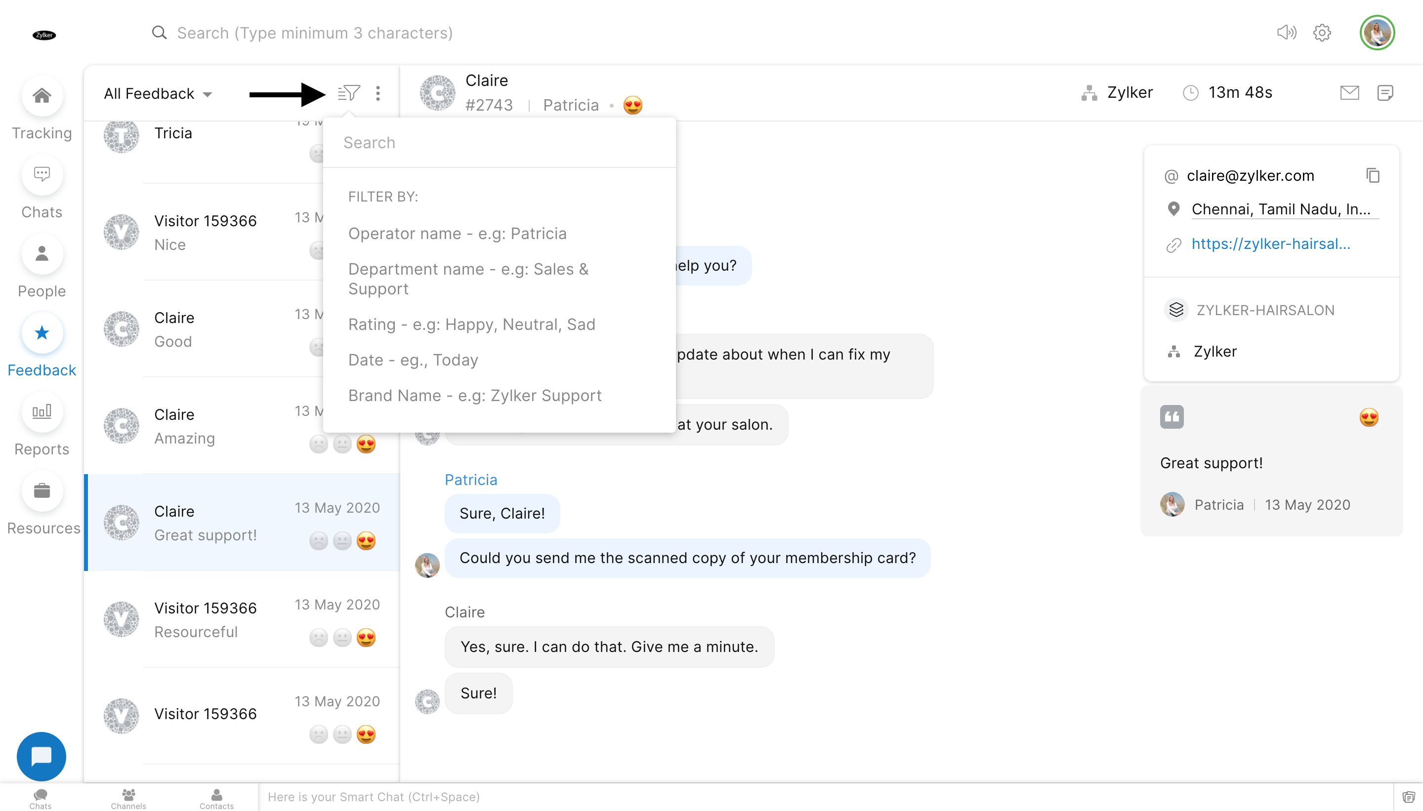 2. Zoho SalesIQの画面左側のメニューにある[フィードバック]をクリックすると、すべてのフィードバックが新しい順で一覧表示されます。
