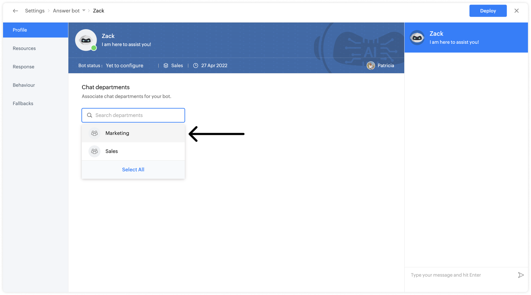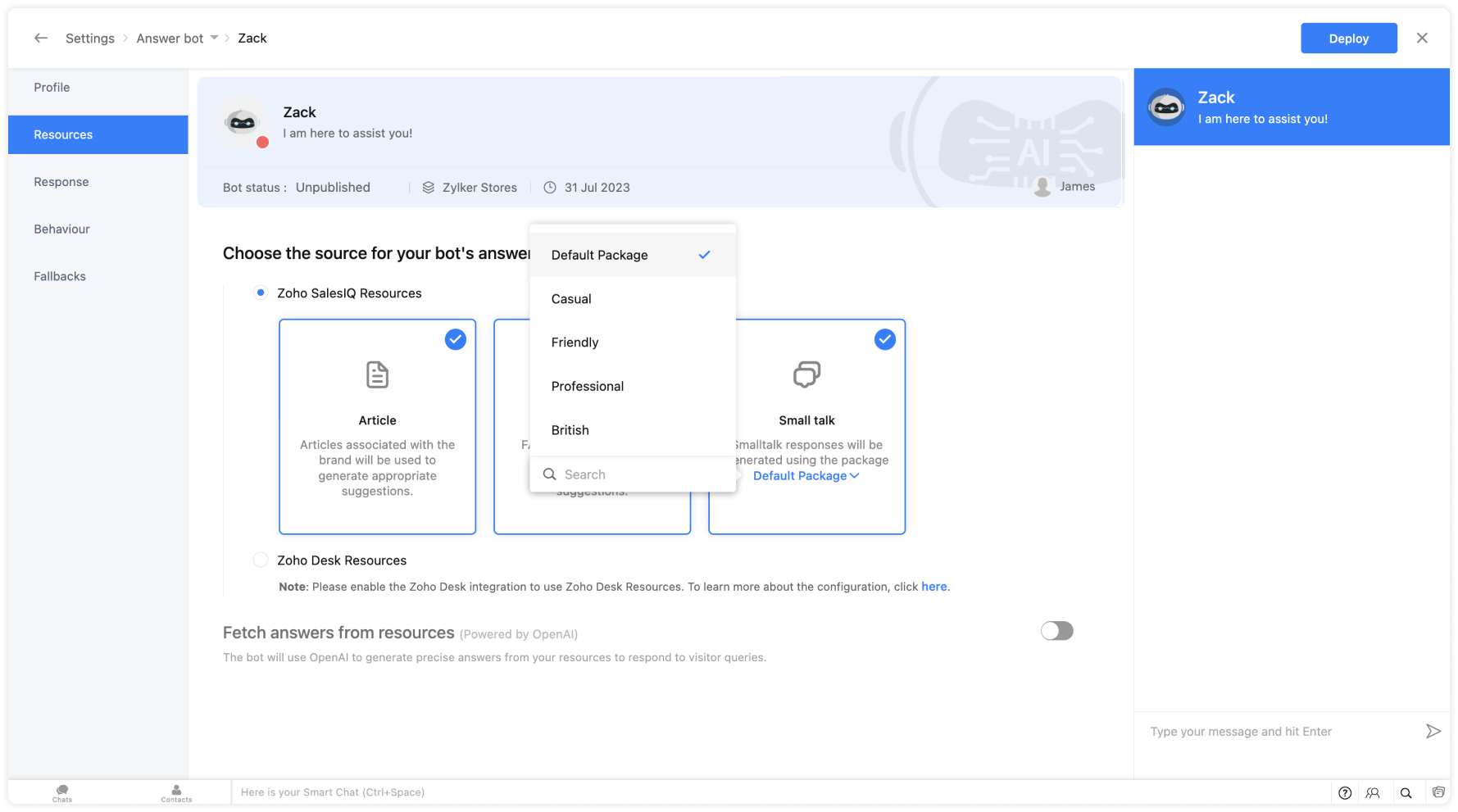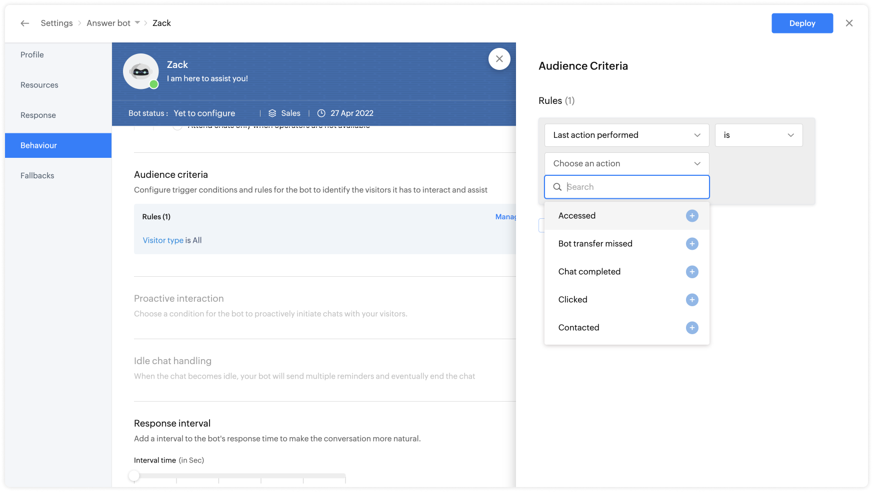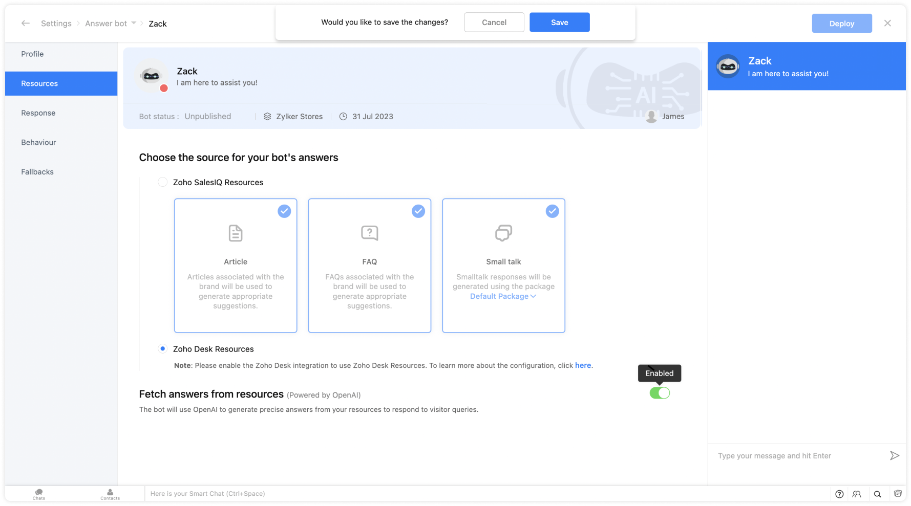 Zoho SalesIQにブランドを追加すると、ブランド専用の自動案内ボットが自動的に作成されます。ただし、自動案内ボットは設定を完了するまで有効化されません。