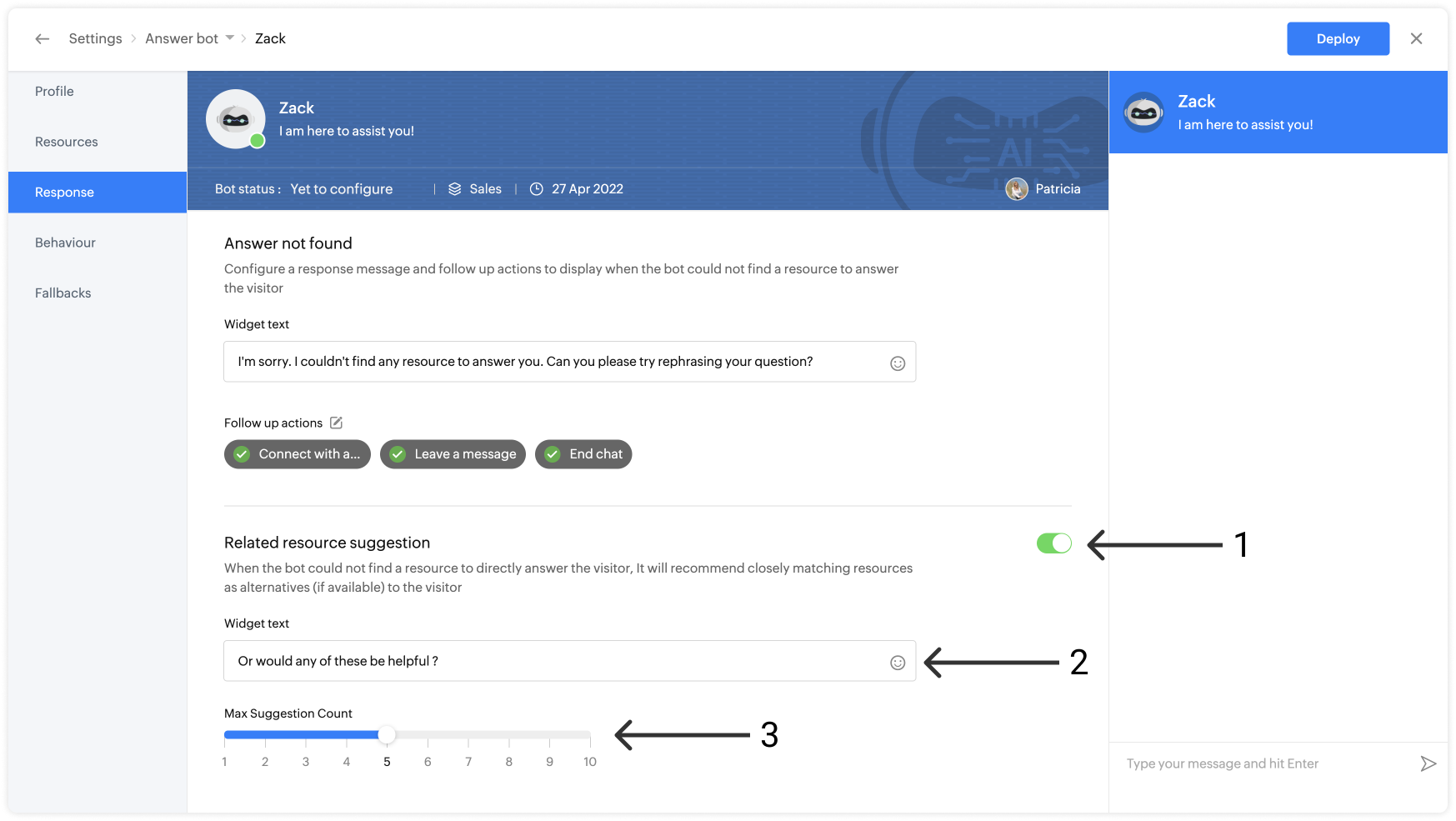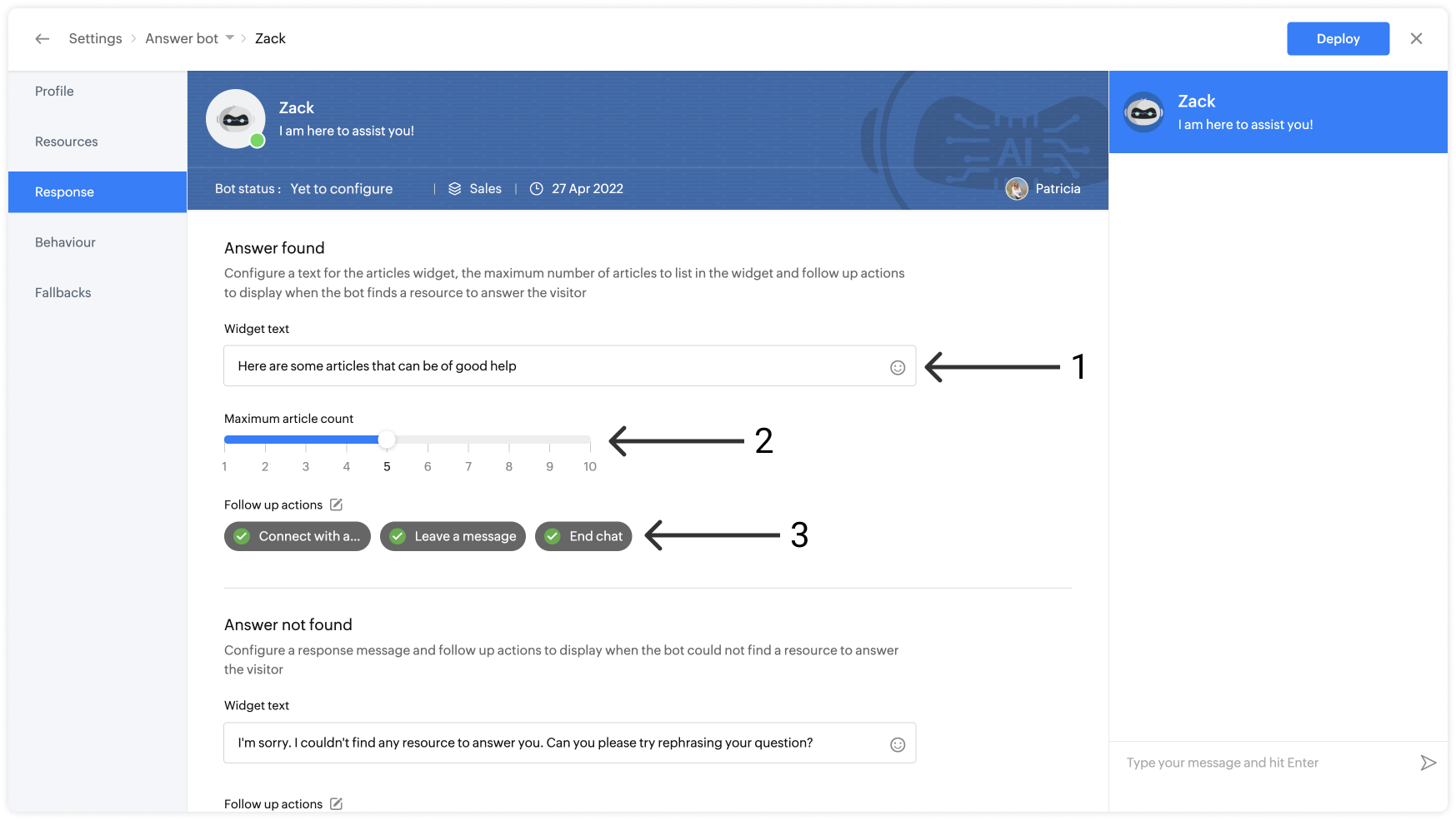 スライダーを利用して、ボットの回答に表示する記事数の上限を指定します。