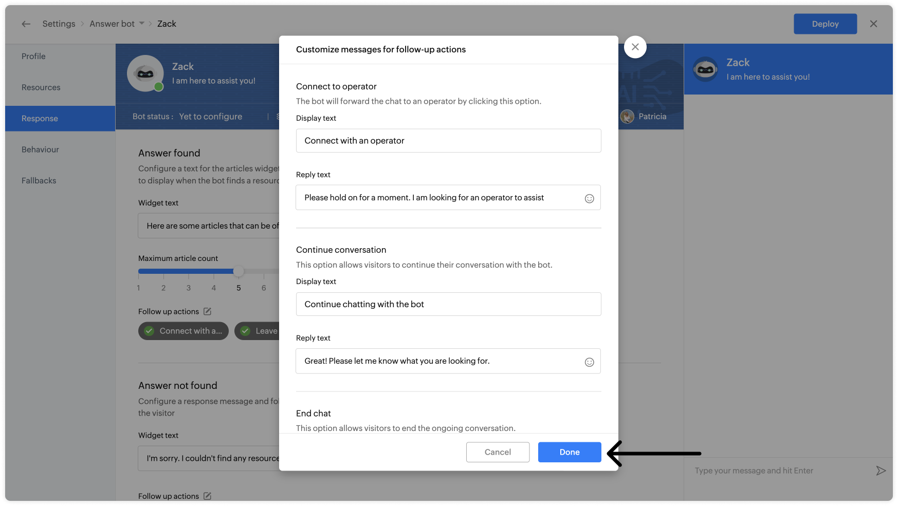 訪問者からの質問に対する回答がボットによって識別された場合、該当の記事やよくある質問の回答の内容が、ボットの返信として表示されます。このような場合を、該当する回答がある場合と呼びます。ここでは、 メッセージとフォローアップ処理の設定が可能です。