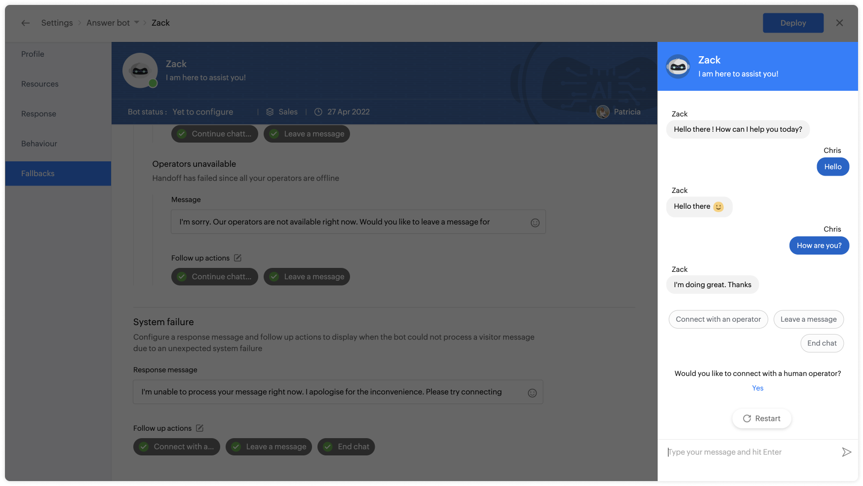自動案内ボットがチャットを担当者に引き継げなかった場合に表示する応答メッセージと、実行するフォローアップ処理を設定できます。