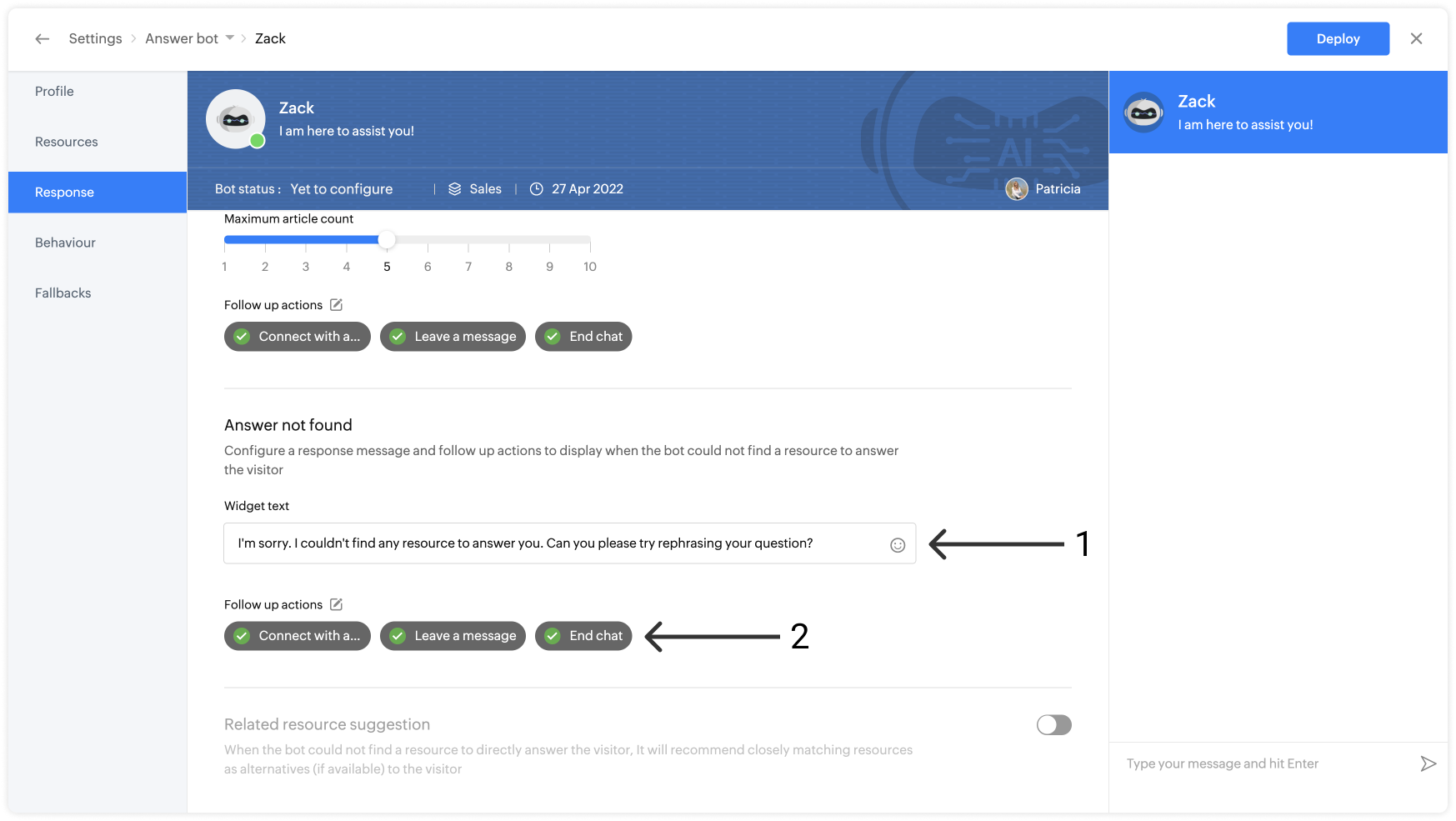 訪問者からの質問に対する回答がボットによって識別されず、適切な記事やよくある質問が見つからない場合を、該当する回答がない場合と呼びます。この設定では、 メニューのテキストとフォローアップ処理を設定できます。