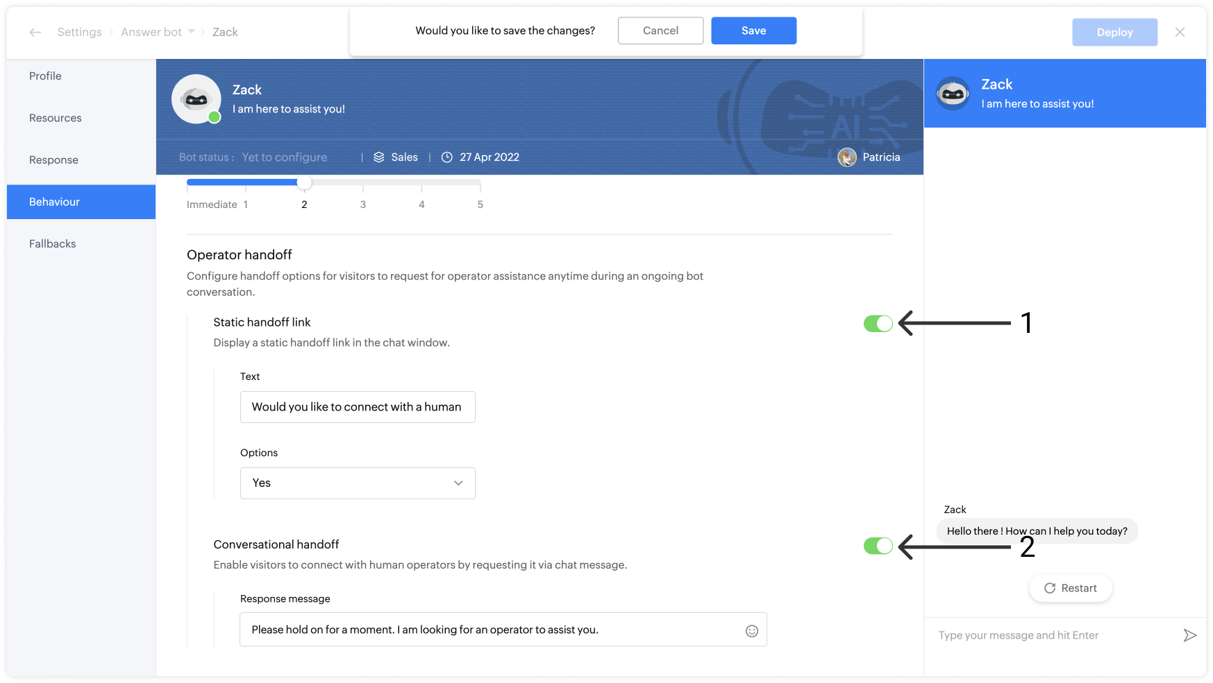 訪問者が自動案内ボットとのチャット中に人間の担当者への引き継ぎを希望する場合の対応方法や表示するメッセージを設定できます。担当者へ引き継ぐ場合、自動案内ボットとのチャット内容が担当者に転送されます。引き継ぎ処理については、以下の2つの方法を設定できます。