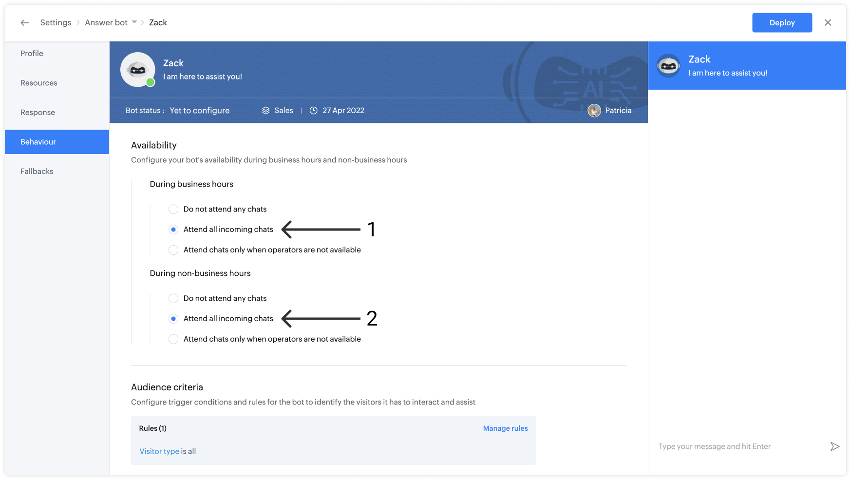 - すべての受信チャットに応答する:自動案内ボットは、営業時間内に受信したすべてのチャットに応答します。