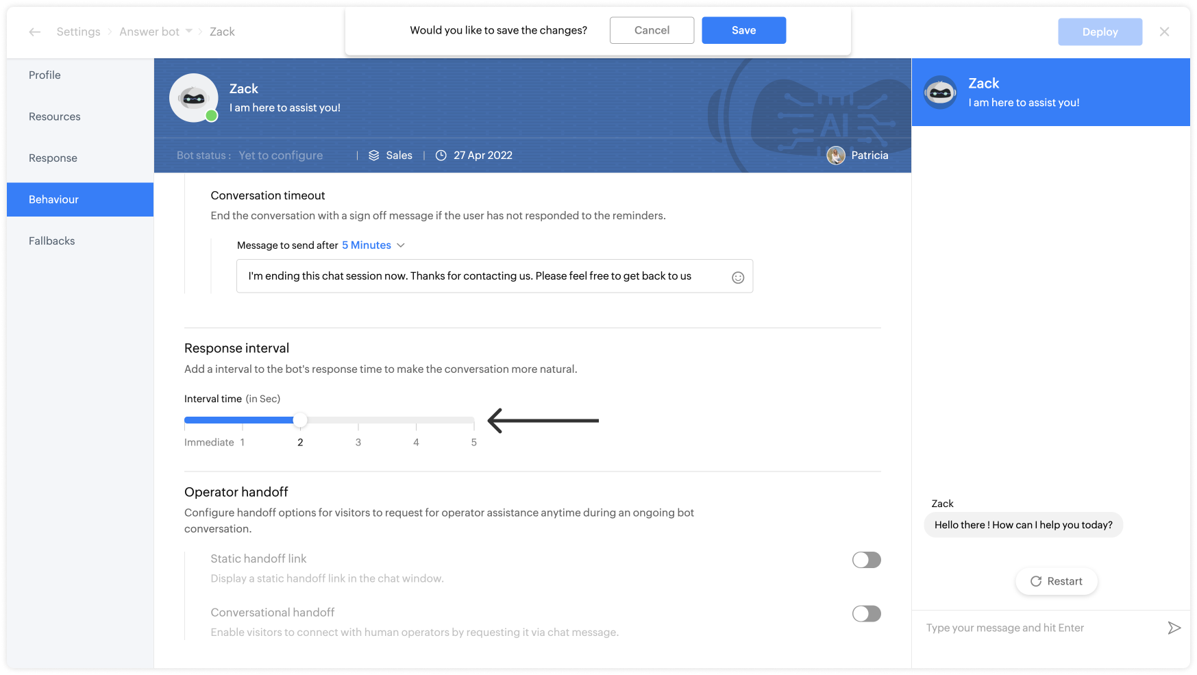 - スライダーをドラッグして値を設定することで、自動案内ボットの返信の間隔(秒単位)を設定できます。