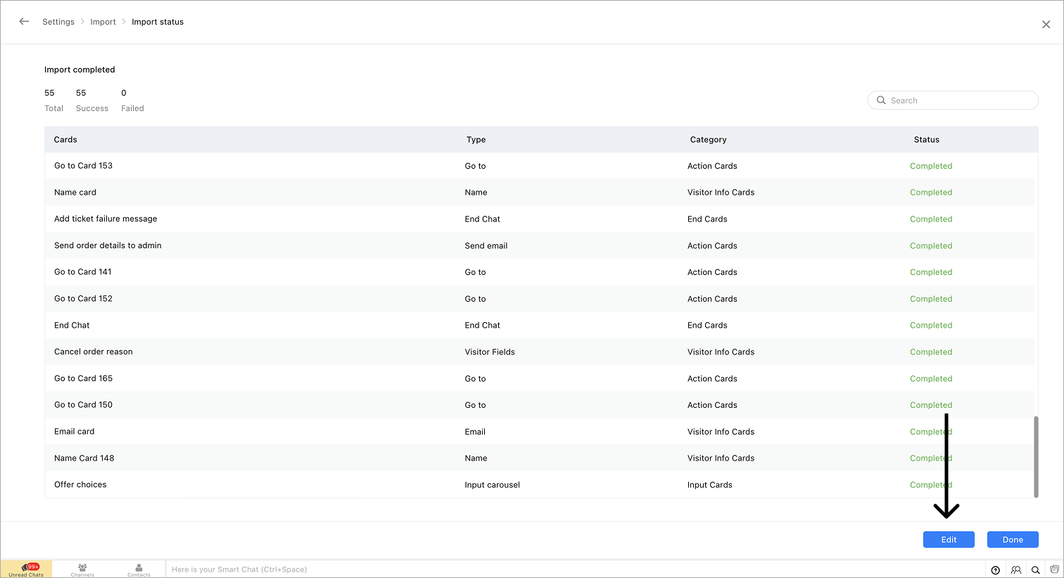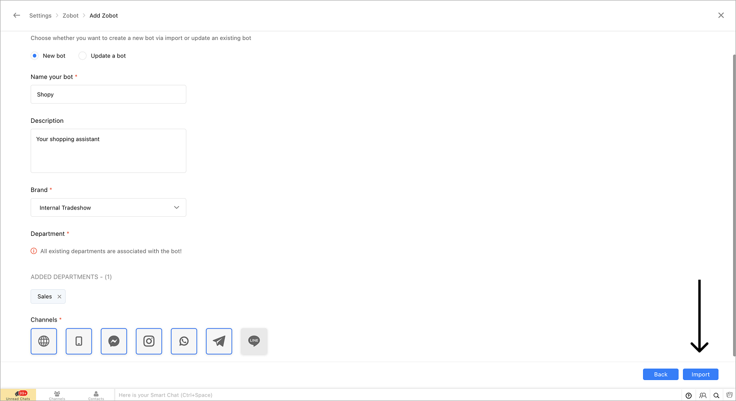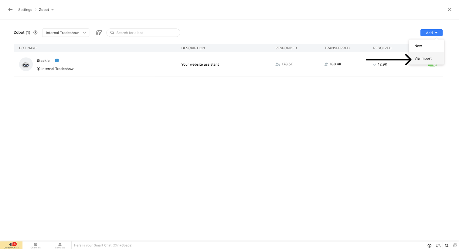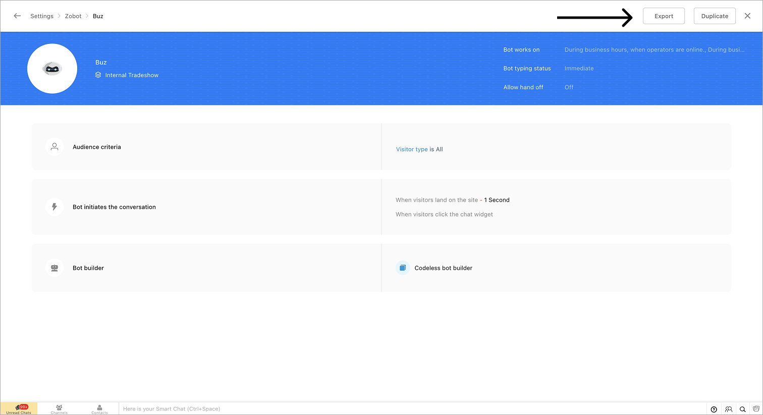 SalesIQは、強力なインポートするおよびエクスポートする機能を提供しており、チャットボットの迅速かつ手間のない移行が取引先やポータル間で可能です。この機能により、あるSalesIQポータルからボットをエクスポートし、別のポータルへインポートすることで、複数環境でのスムーズな展開および複製が簡単に行えます。