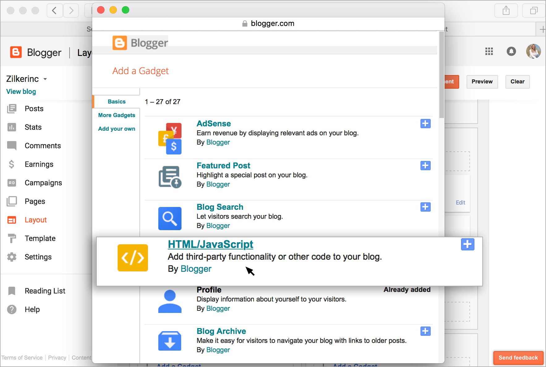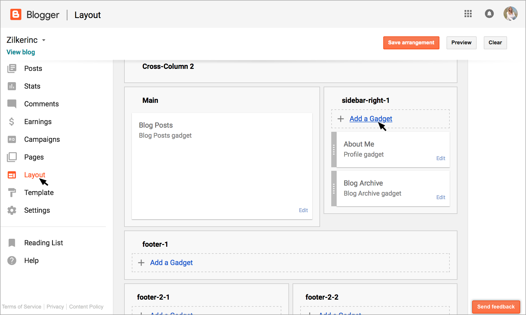 1. Bloggerのダッシュボードで[レイアウト]をクリックします。[ガジェットを追加]をクリックします。