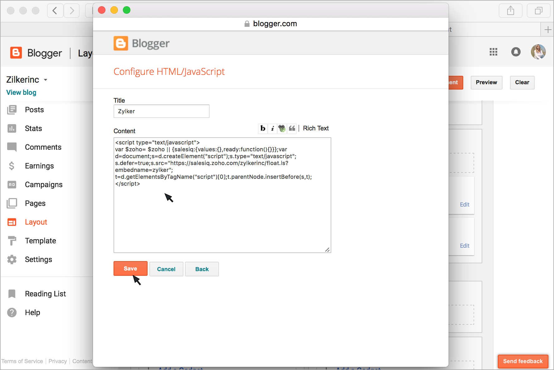 BloggerとZoho SalesIQの連携(チャットと訪問者追跡の機能の追加)