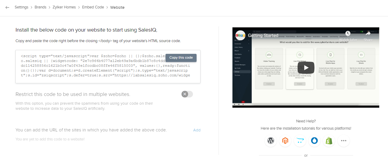 5. 「head」タグの間にZoho SalesIQのコードを貼り付けます。