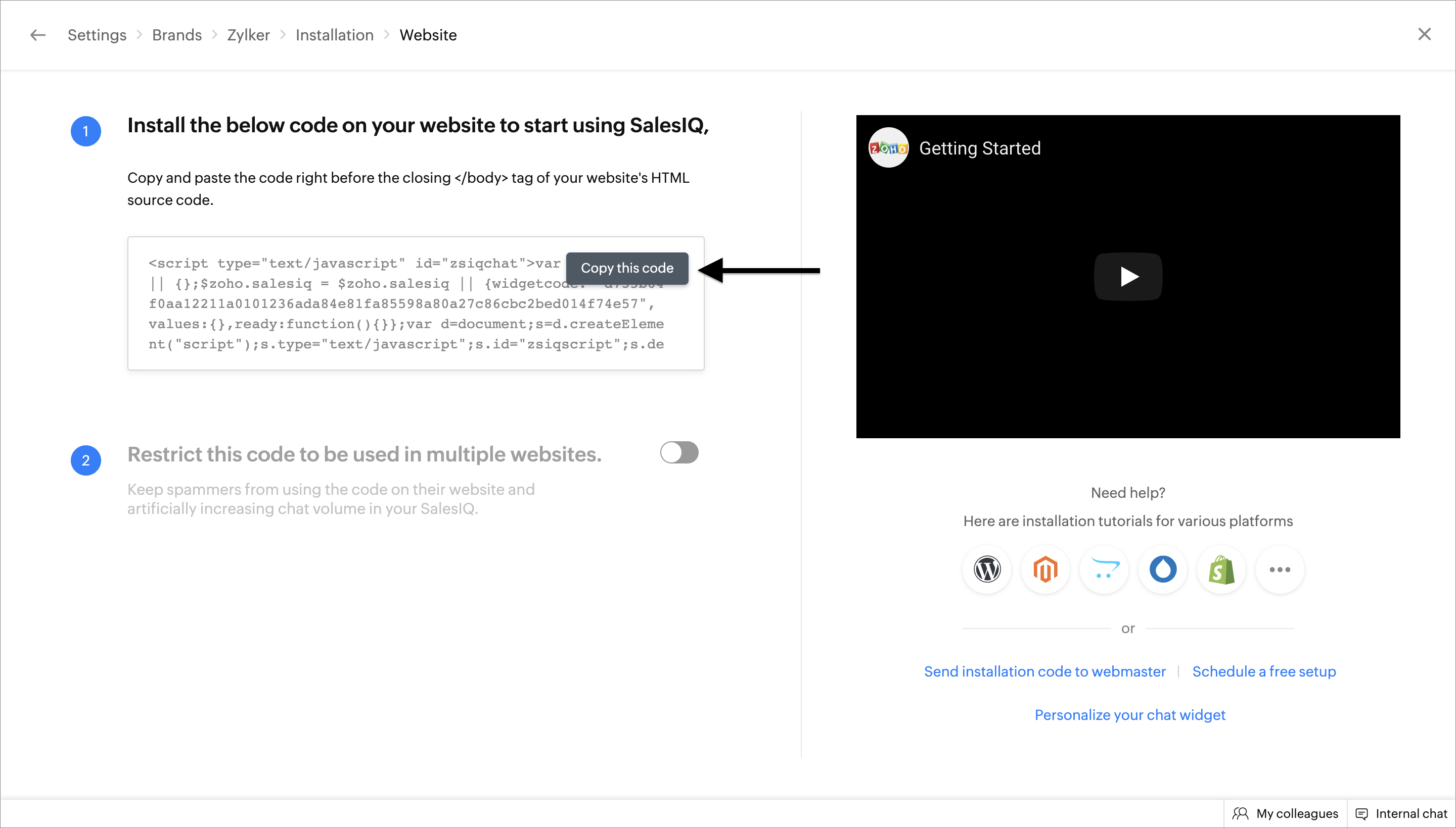 Zoho SalesIQのコードの取得