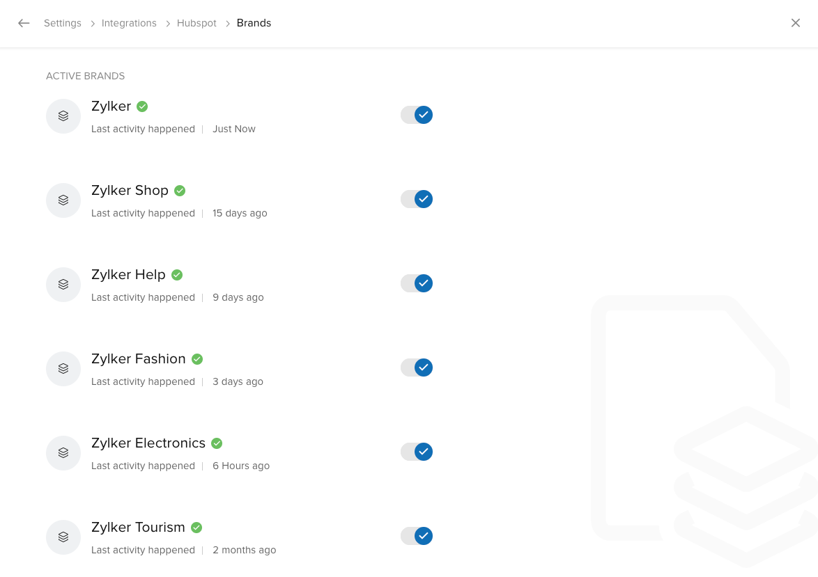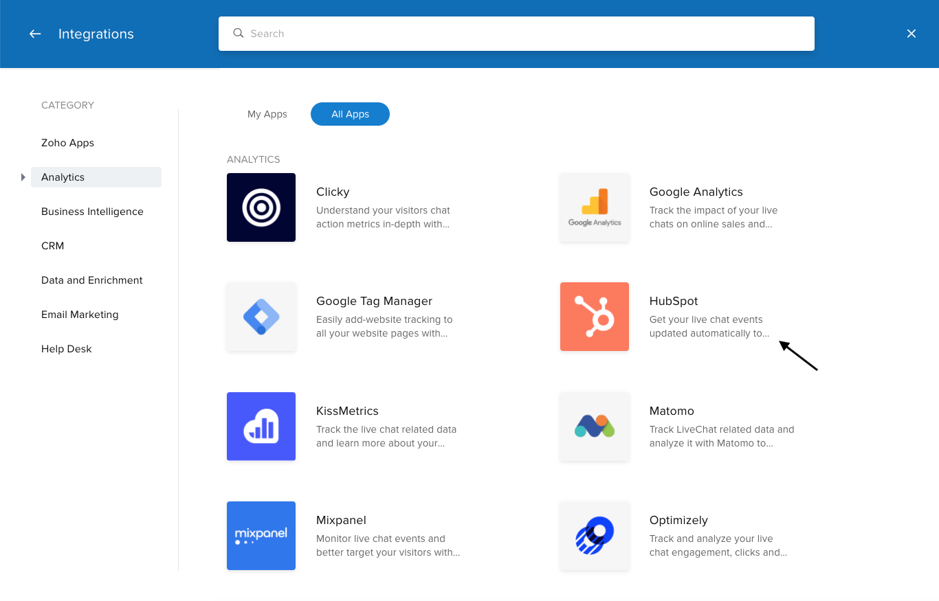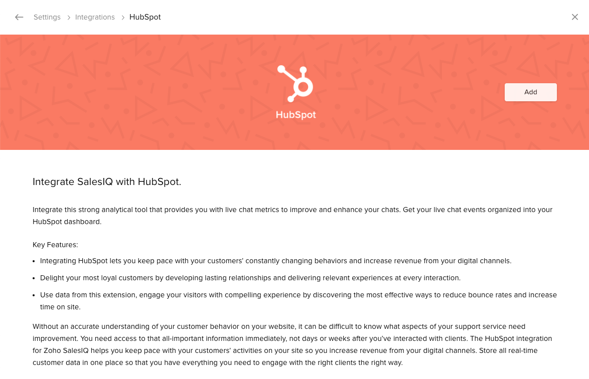 Zoho SalesIQのコードをWebサイトに設置した後、次の手順で連携を有効にすると、チャット情報がHubspotに送信されます。