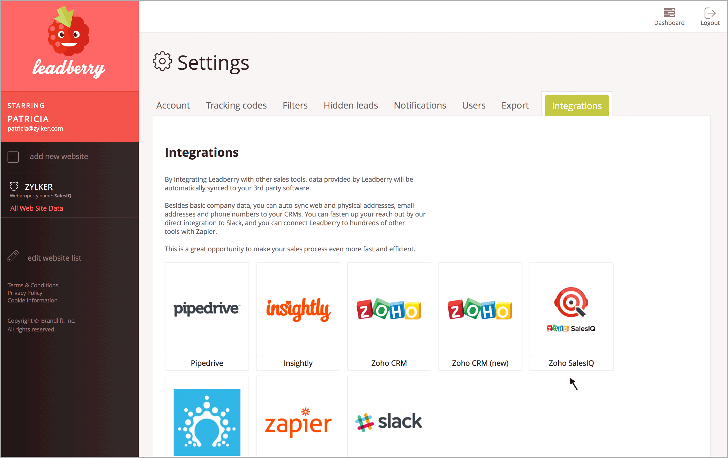 1. LeadberryのAPIトークンを取得するには、Leadberryアカウントにログインし、[Settings](設定)→[Integration](連携)→[Zoho SalesIQ]の順に移動します。